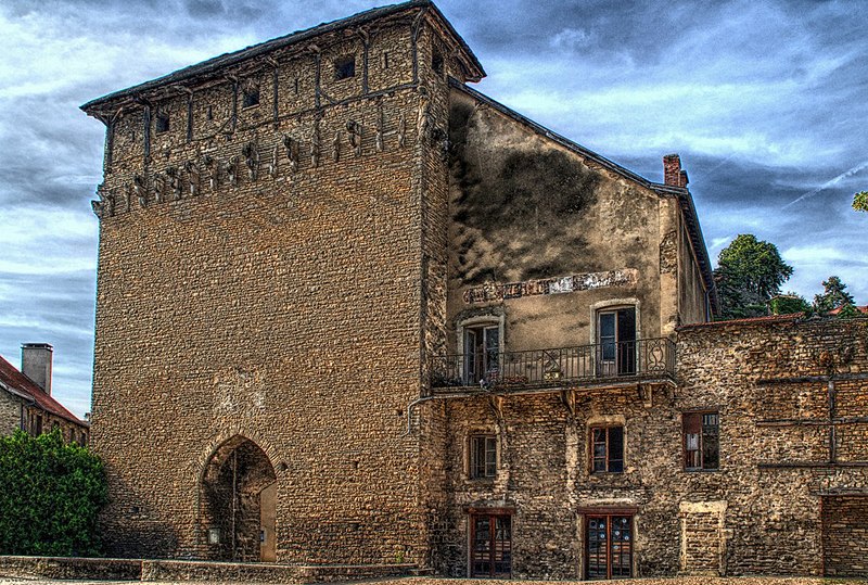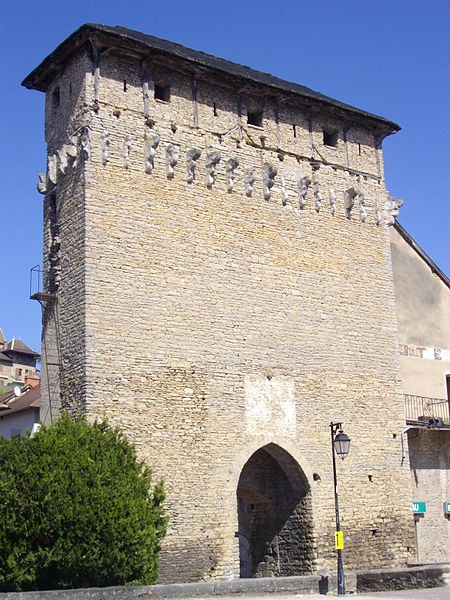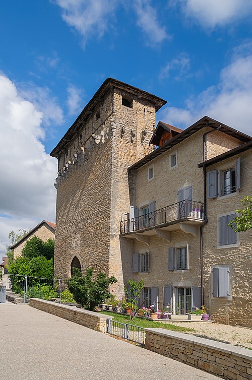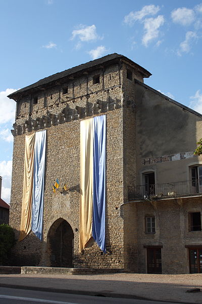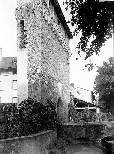 L’édifice mesure environ vingt mètres de hauteur et est couvert d’un toit à quatre pans recouvert de lauzes, pierres calcaires de la région. Des corbeaux en saillie subsistent sur la façade ; ils soutenaient autrefois des hourds en bois. À l’origine, la porte était précédée de douves alimentées par la rivière de Vaud et équipée d’un pont-levis et d’une herse.