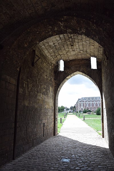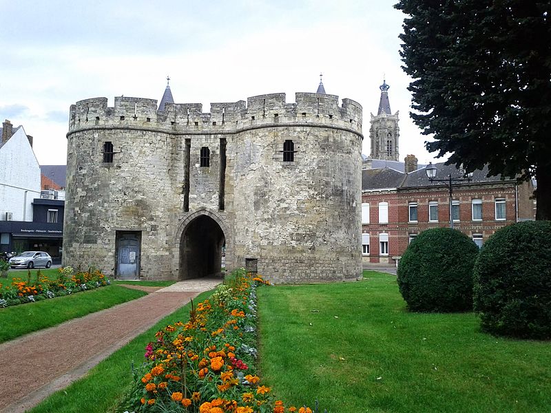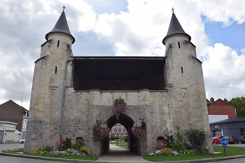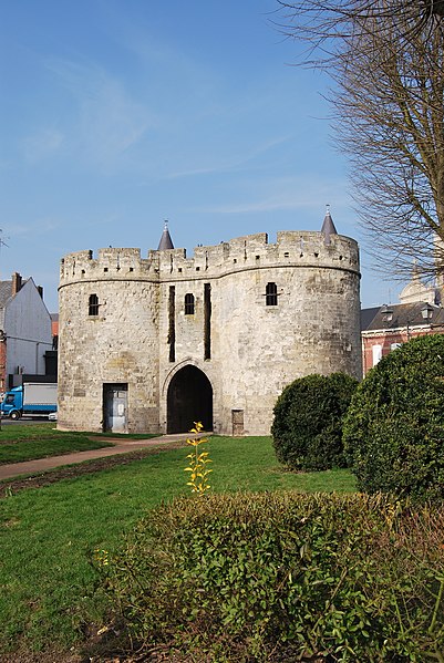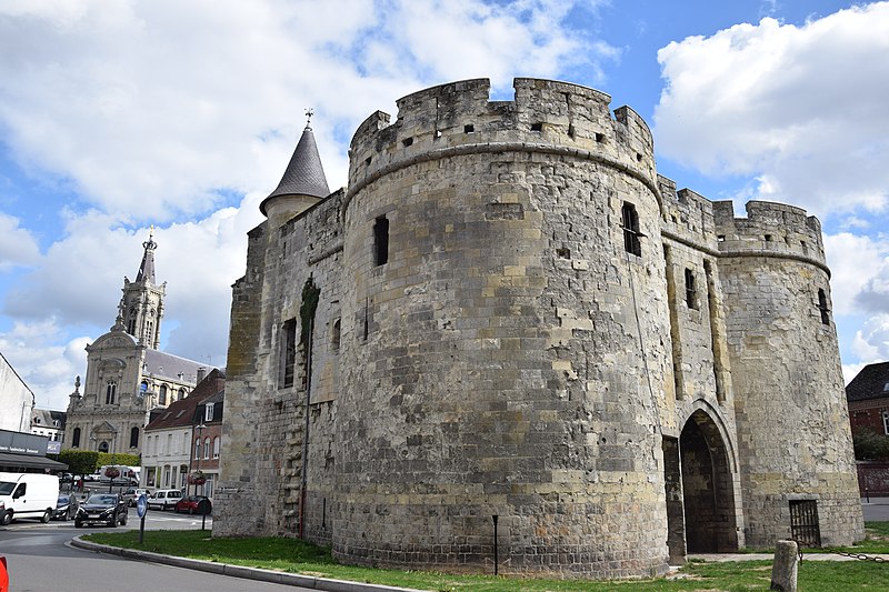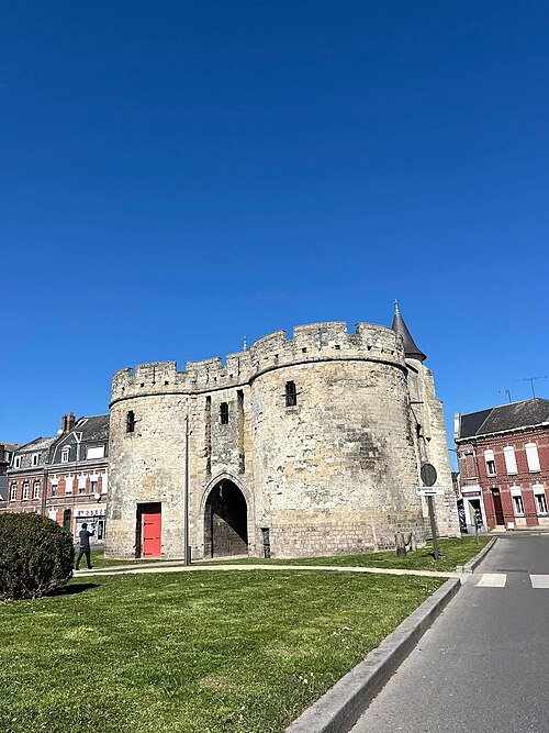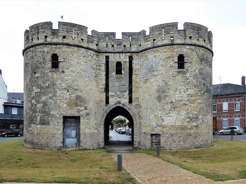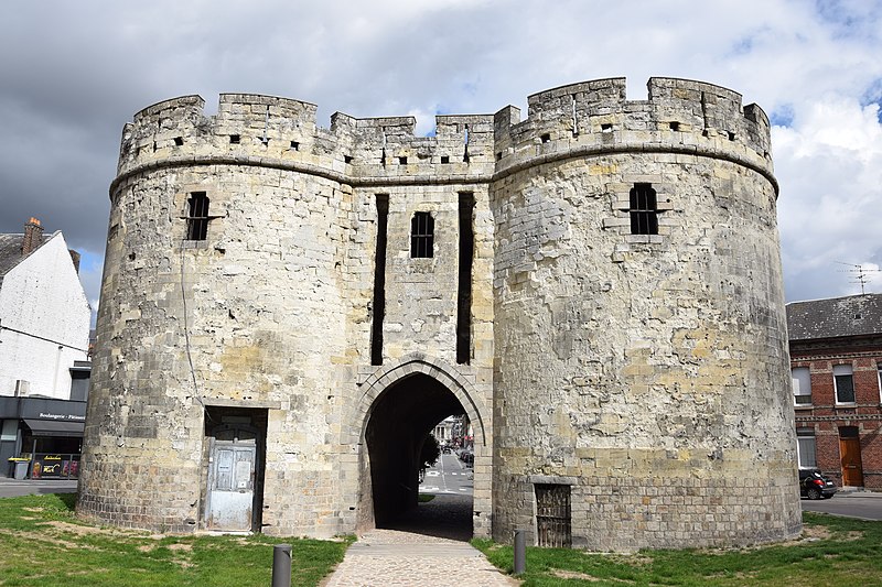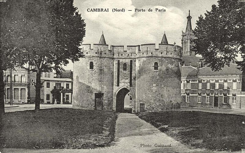 La Porte de Paris, vestige de l’enceinte de Cambrai (Nord), est l’une des dernières traces des fortifications de la cité cambrésienne. Classée monument historique le 5 juin 1942, elle a longtemps été considérée comme l’entrée la plus difficile à attaquer de la ville, contrairement à la Porte Notre-Dame ; Louis XIV choisit d’ailleurs d’entrer par cette dernière pour éviter le risque d’un affrontement en passant par la Porte de Paris. Conçue pour protéger l’accès sud de Cambrai, elle fut rebâtie au XIVe siècle dans un style proche de l’architecture philippienne de l’époque. Au XVIe siècle, sous Charles-Quint, la partie supérieure fut rasée et les murailles élargies : le corps de garde supérieur fut alors enterré et le passage d’entrée allongé par la construction d’un tunnel. À la suite du démantèlement en 1892, la porte fut conservée et restaurée ; les adjonctions du XVIe siècle furent supprimées et la façade côté ville mise au jour, tandis que des tourelles arrière et des créneaux avec merlons remplacèrent la terrasse d’artillerie en brique. La Porte de Paris a fait l’objet d’une nouvelle restauration au début du XXIe siècle. Architecturale et militaire, la construction présente deux tours curvilignes encadrant un passage voûté qui traverse l’ensemble. Un corps de garde composé de deux pièces permettait de surveiller l’ouverture du pont-levis et de la herse et donnait accès à un assommoir, tandis que des archères de part et d’autre du passage autorisaient les tirs défensifs.