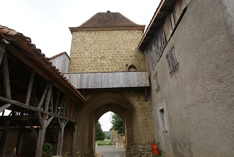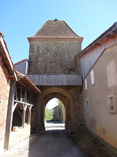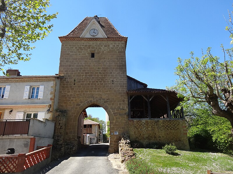 La tour-porte de Mont-d'Astarac est un vestige des fortifications gothiques : tour rectangulaire composée d'un porche et de deux étages percés de plusieurs meurtrières. Elle est le seul vestige de l'enceinte villageoise établie autour du castelnau vers la fin du XIIIe siècle ou le début du XIVe siècle. Elle a fait l'objet d'une importante campagne de remaniements à la fin du Moyen Âge, probablement vers la fin du XVe siècle ou le début du XVIe siècle, qui a notamment repris l'arc de la porte, percé la baie à accolade du deuxième étage et créé un ouvrage avancé dont ne subsiste que le départ de chaque côté du passage sur la face externe. L'installation de deux bouches à feu est également possible et pourrait être postérieure. L'existence d'un pont-levis est attestée par des sources modernes ; il a été détruit en 1787. La toiture a été reprise à la fin du XIXe siècle et le fronton ajouté ultérieurement porte la date 1908.