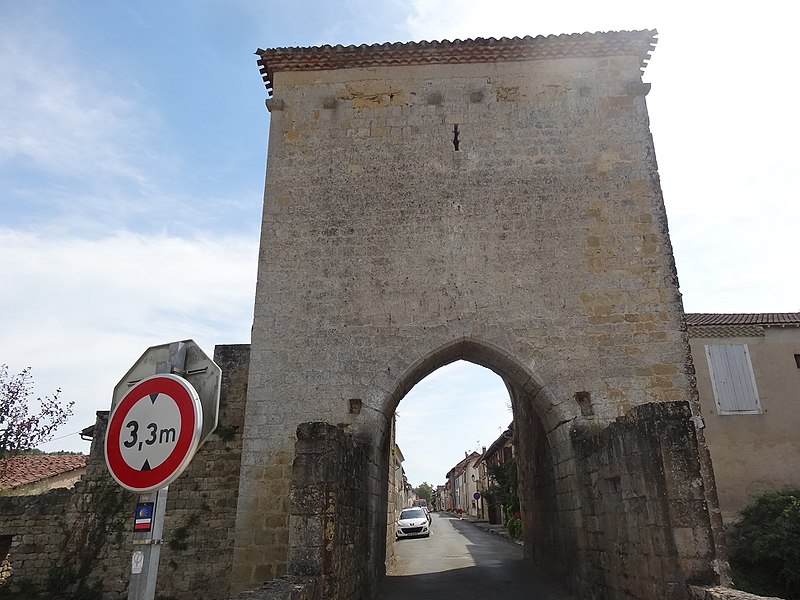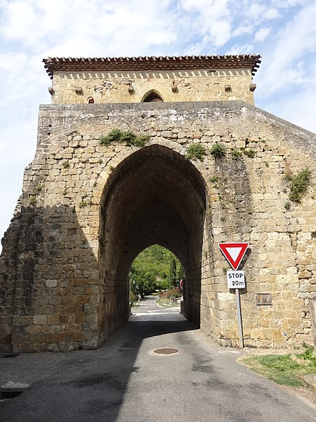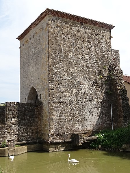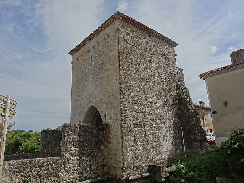 Cette ancienne tour barlongue franchit la rue principale par une baie en tiers point et ouvre le passage. Elle repose sur deux murs parallèles qui soutiennent une voûte en berceau brisé. Au‑dessus de cette voûte se trouve une petite salle qui servait de corps de garde pour les défenseurs. La partie haute laisse apparaître les traces d'anciens mâchicoulis. Les murs d'enceinte ont disparu, mais le pont qui précède la tour subsiste et enjambe l'ancien fossé. L'ensemble fortifié formé par la tour‑porte et le pont date du XIVe siècle ; le pont et la tour ont été construits simultanément et leurs maçonneries sont liées. Seul le parapet paraît postérieur : sa maçonnerie s'appuie contre celle de la tour. La partie haute de la tour a été reprise à une date indéterminée. Les crénelages et les hourds ont disparu et ont été remplacés par un toit en pavillon. La partie haute peut faire apparaître ce qui ressemble à des merlons et créneaux, mais des reprises de maçonnerie ne correspondent pas à l'alignement des corbeaux.