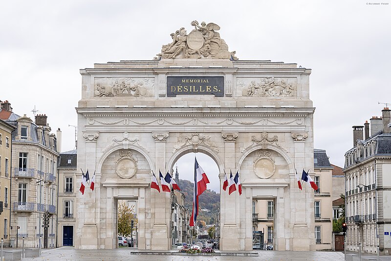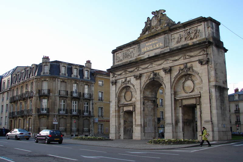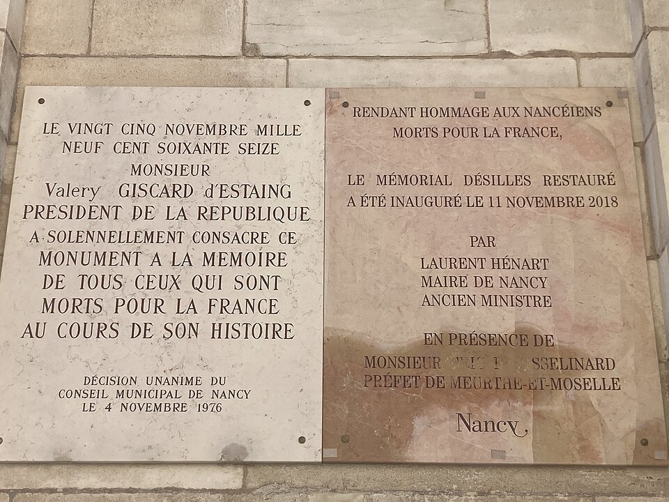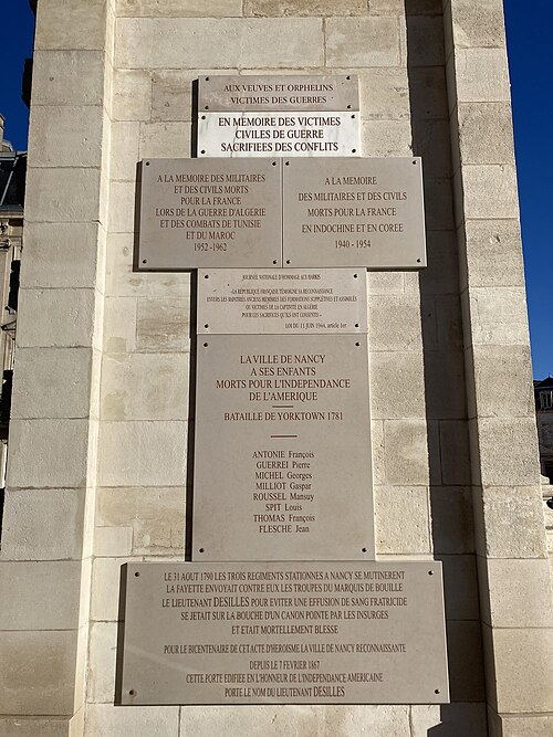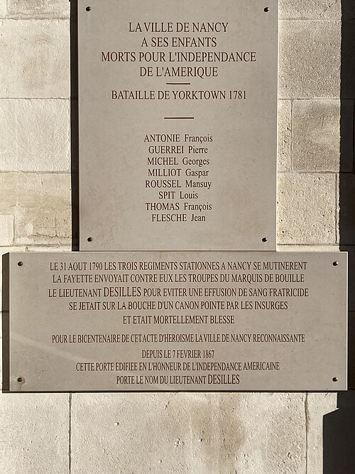 La porte Désilles, ou mémorial Désilles, est un arc de triomphe situé à Nancy, à l'ouest de la vieille-ville et à l'extrémité nord du cours Léopold. C'est le plus ancien monument aux morts de France. Érigée sur la place du Luxembourg, elle prolonge au nord le cours Léopold et l'esplanade du Souvenir-Français, au croisement des rues Désilles, de Metz et de la Craffe. L'ouvrage mesure environ dix mètres de haut, douze mètres en tenant compte des décorations sommitales, et comporte trois baies : une ouverture centrale d'environ six mètres et deux latérales d'environ trois mètres chacune. La face intérieure, tournée vers le cours Léopold, est ornée de bas-reliefs commémorant le traité de Versailles signé en 1783 par Louis XVI, tandis que la face extérieure, tournée vers la rue de Metz, représente la bataille de Nancy de 1477; statues et bas-reliefs sont l'œuvre de Joseph Söntgen. Elle porte le nom du lieutenant Désilles, en mémoire de sa mort tragique lors de l'affaire de Nancy. Conçue par l'architecte Didier-Joseph-François Mélin et construite entre 1782 et 1784 à l'initiative du comte de Stainville, commandant en chef de la Lorraine, elle devait fermer la perspective du cours Léopold et ouvrir sur la route de Metz. Destinée aussi à honorer la mémoire des Nancéiens morts pour l'indépendance américaine durant la bataille de Yorktown, elle porta successivement les noms de « porte Saint-Louis » et « porte Stainville » avant de recevoir, en 1867, le nom de porte Désilles. Classée monument historique par arrêté du 15 janvier 1925, la porte a été restaurée par la ville de Nancy pour en faire son monument commémoratif. Le souvenir du lieutenant Désilles rappelle qu'en 1790, lors d'une mutinerie de trois régiments stationnés à Nancy, il s'interposa pour éviter une effusion de sang en se jetant sur la bouche d'un canon pointé par les insurgés et fut mortellement blessé. Le monument comporte également des inscriptions rendant hommage aux veuves et orphelins victimes des guerres, aux militaires et civils morts pour la France en Indochine et en Corée (1940-1954), ainsi qu'à ceux tombés lors de la guerre d'Algérie et des combats de Tunisie et du Maroc (1952-1962), et porte une mention en hommage aux harkis exprimant la reconnaissance de la République envers les rapatriés et anciens supplétifs victimes des événements d'Algérie.