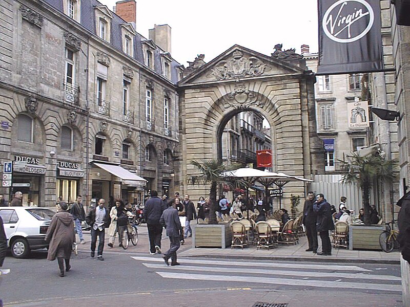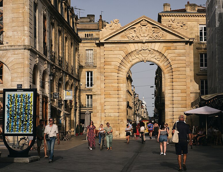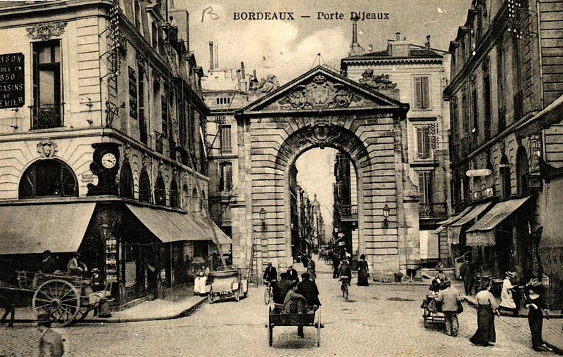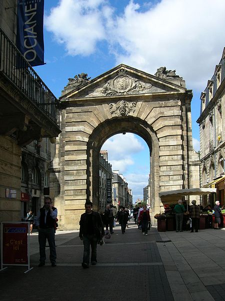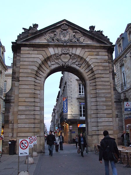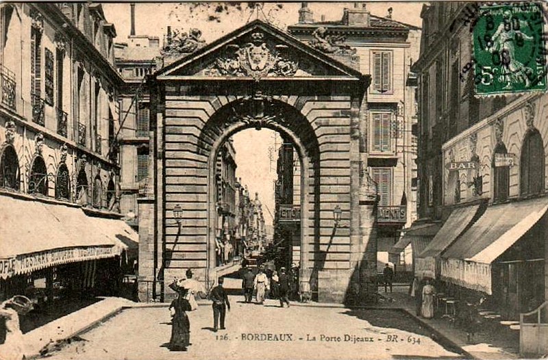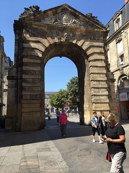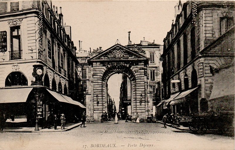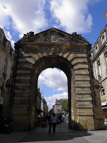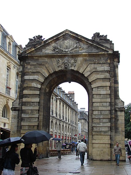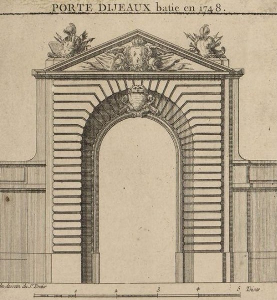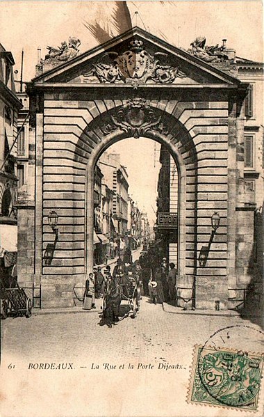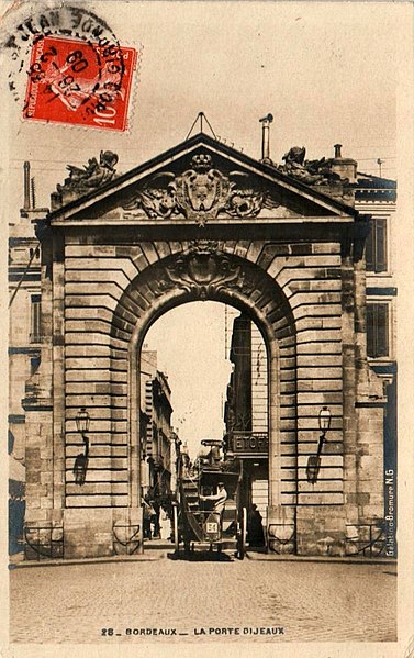 La porte Dijeaux, dite aussi porte Dauphine sous Louis XIV, est une porte de la ville de Bordeaux (Gironde) classée monument historique le 2 juin 1921. Elle se situe à l’extrémité ouest du decumanus formé par l’alignement des rues Porte-Dijeaux et Saint-Rémi et ouvre sur la place Gambetta. Le nom apparaît sous des formes variées (de Giu, Dijeu, Dijeus, Digaus) et deux hypothèses expliquent son origine : selon l’abbé Baurein, il dériverait de porta deus Judias, « porte des juifs » en gascon, en raison d’un lien avec le quartier juif du mont Judaïque ; d’après Camille Jullian, il viendrait de Porta Jovis, lié au temple de Jupiter, la forme gasconne de « de Jupiter » ayant évolué jusqu’à l’appellation actuelle. L’édifice actuel est la troisième porte à cet emplacement : la première, une ouverture de l’enceinte romaine du IVe siècle, aurait été la « porta Jovia » ; elle n’a pas été modifiée lors de l’agrandissement du XIIIe siècle. Les remparts du XIVe siècle déplacèrent la porte de dix à douze mètres vers l’ouest et l’inscrivirent entre deux tours, avec à l’extérieur une demi-lune servant de redoute. Cette porte, qui communiquait avec le faubourg Saint-Seurin, joua un rôle défensif notable, notamment lors de la Fronde de 1650 où elle permit de résister douze jours au siège du maréchal de la Mailleray. Dans le cadre des travaux d’embellissement conduits par l’intendant Tourny, les jurats décidèrent en 1746 de créer la place Dauphine (actuelle place Gambetta) et de démolir la demi-lune ; la porte elle-même fut remplacée par le monument actuel élevé à partir de 1748. La construction, dirigée par Voisin d’après les plans de l’architecte André Portier, est généralement datée du milieu du XVIIIe siècle, certaines sources mentionnant son achèvement en 1750, d’autres en 1753. Le décor sculpté, confié à Claude (ou Claude-Clair) Francin, comprend quatre trophées placés aux extrémités des frontons ; le côté ouest porte les armes de France et un cartouche daté 1748, tandis que le côté est porte les armes de Bordeaux et un cartouche figurant une tête de Neptune accompagnée de veaux marins. La Révolution entraîna la suppression des vantaux qui fermaient l’arcade centrale et des guichets latéraux, rendus inutiles par l’abolition des octrois. La porte est taillée en pierre de Frontenac, une pierre dure et dense dans laquelle on observe des sédiments de coquilles ; cette pierre est habituellement employée pour les fondations, alors que la pierre de Bourg est plus fréquemment utilisée pour les parties supérieures. Isolée aujourd’hui et privée de ses guichets piétons, elle marque toujours l’aboutissement de l’ancienne voie romaine qui reliait la place royale au fleuve. Des campagnes de restauration ont eu lieu, notamment en 1971, et de nouveaux travaux ont débuté en janvier 2022 pour une durée d’environ cinq mois. La porte encadre la perspective vers le centre-ville et constitue un point de repère historique sur la place Gambetta.