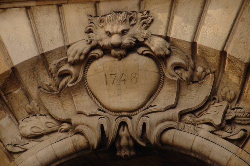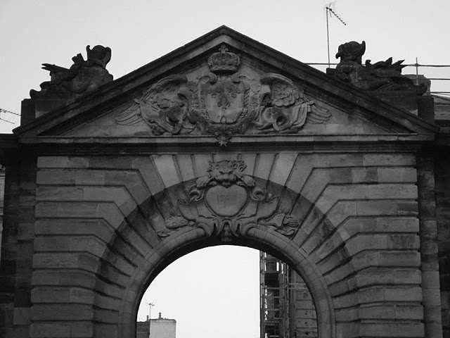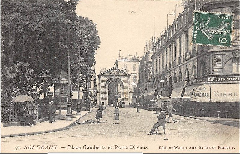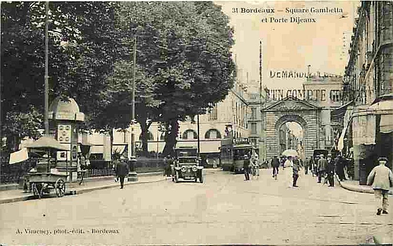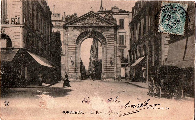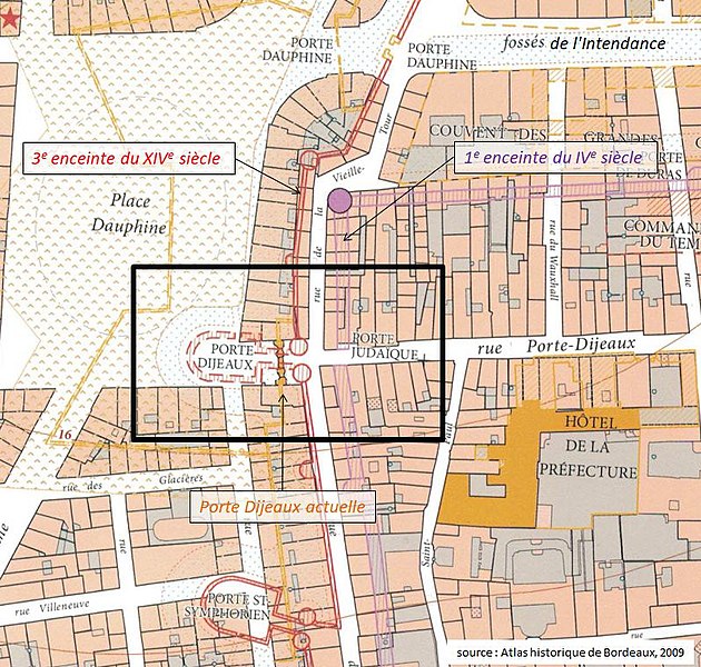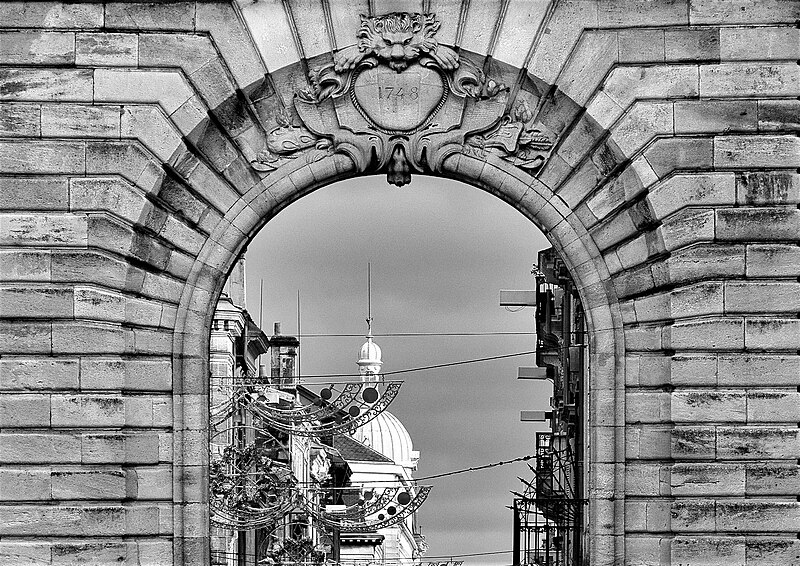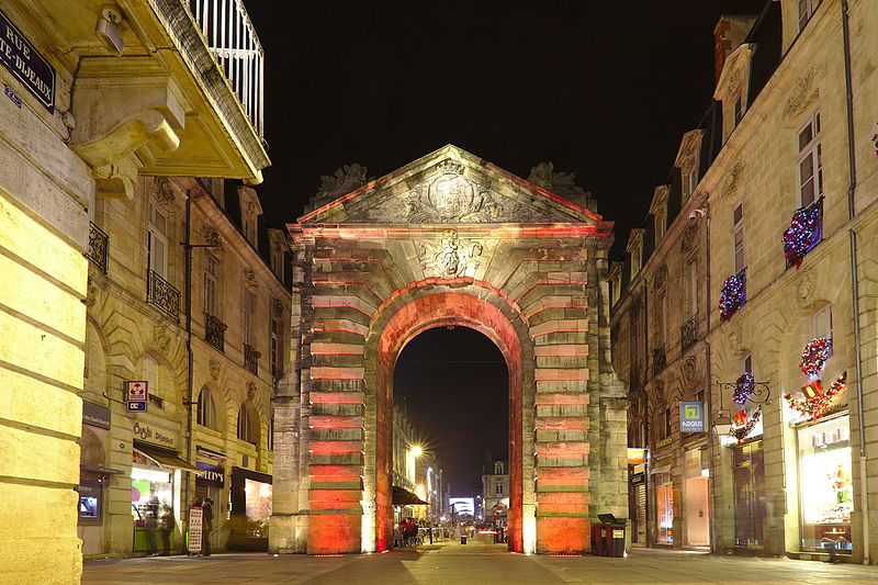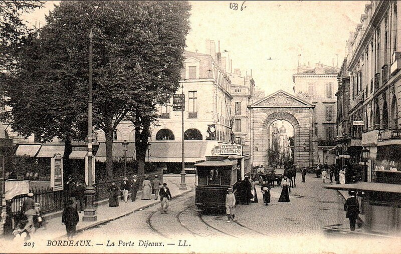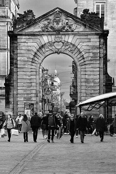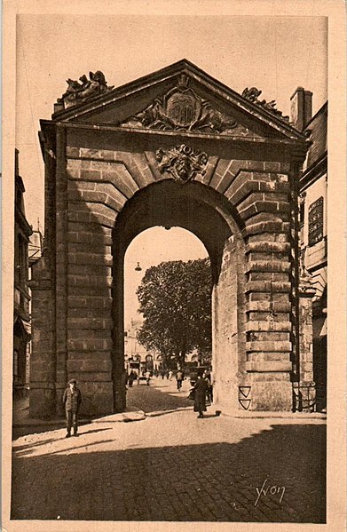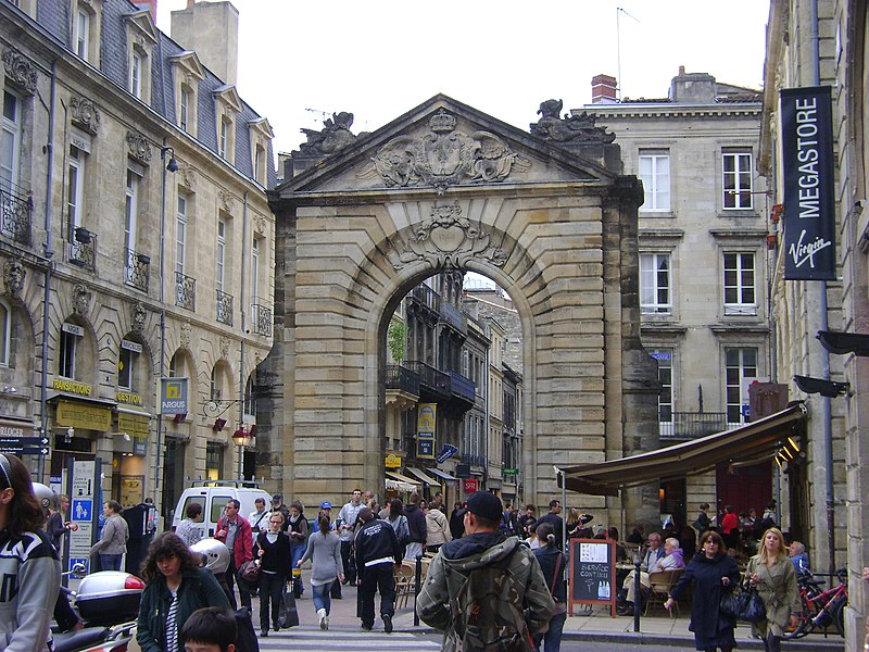 La porte Dijeaux, dite aussi porte Dauphine sous Louis XIV, est une porte de la ville de Bordeaux (Gironde) classée monument historique le 2 juin 1921. Elle se situe à l’extrémité ouest du decumanus formé par l’alignement des rues Porte-Dijeaux et Saint-Rémi et ouvre sur la place Gambetta. Le nom apparaît sous des formes variées (de Giu, Dijeu, Dijeus, Digaus) et deux hypothèses expliquent son origine : selon l’abbé Baurein, il dériverait de porta deus Judias, « porte des juifs » en gascon, en raison d’un lien avec le quartier juif du mont Judaïque ; d’après Camille Jullian, il viendrait de Porta Jovis, lié au temple de Jupiter, la forme gasconne de « de Jupiter » ayant évolué jusqu’à l’appellation actuelle. L’édifice actuel est la troisième porte à cet emplacement : la première, une ouverture de l’enceinte romaine du IVe siècle, aurait été la « porta Jovia » ; elle n’a pas été modifiée lors de l’agrandissement du XIIIe siècle. Les remparts du XIVe siècle déplacèrent la porte de dix à douze mètres vers l’ouest et l’inscrivirent entre deux tours, avec à l’extérieur une demi-lune servant de redoute. Cette porte, qui communiquait avec le faubourg Saint-Seurin, joua un rôle défensif notable, notamment lors de la Fronde de 1650 où elle permit de résister douze jours au siège du maréchal de la Mailleray. Dans le cadre des travaux d’embellissement conduits par l’intendant Tourny, les jurats décidèrent en 1746 de créer la place Dauphine (actuelle place Gambetta) et de démolir la demi-lune ; la porte elle-même fut remplacée par le monument actuel élevé à partir de 1748. La construction, dirigée par Voisin d’après les plans de l’architecte André Portier, est généralement datée du milieu du XVIIIe siècle, certaines sources mentionnant son achèvement en 1750, d’autres en 1753. Le décor sculpté, confié à Claude (ou Claude-Clair) Francin, comprend quatre trophées placés aux extrémités des frontons ; le côté ouest porte les armes de France et un cartouche daté 1748, tandis que le côté est porte les armes de Bordeaux et un cartouche figurant une tête de Neptune accompagnée de veaux marins. La Révolution entraîna la suppression des vantaux qui fermaient l’arcade centrale et des guichets latéraux, rendus inutiles par l’abolition des octrois. La porte est taillée en pierre de Frontenac, une pierre dure et dense dans laquelle on observe des sédiments de coquilles ; cette pierre est habituellement employée pour les fondations, alors que la pierre de Bourg est plus fréquemment utilisée pour les parties supérieures. Isolée aujourd’hui et privée de ses guichets piétons, elle marque toujours l’aboutissement de l’ancienne voie romaine qui reliait la place royale au fleuve. Des campagnes de restauration ont eu lieu, notamment en 1971, et de nouveaux travaux ont débuté en janvier 2022 pour une durée d’environ cinq mois. La porte encadre la perspective vers le centre-ville et constitue un point de repère historique sur la place Gambetta.