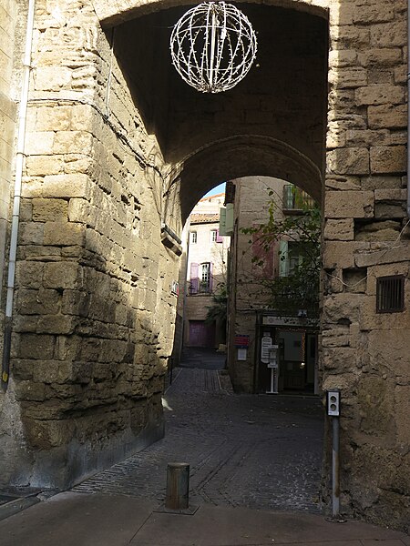 Le premier document évoquant directement l'enceinte fortifiée de la ville date de la fin du XIIIe siècle. Dans la seconde moitié du XIVe siècle, Hugues de Arsis, maître des Eaux et Forêts chargé d'inspecter les fortifications du royaume, ordonne de reconstruire les murailles. L'entretien de l'enceinte et de ses fossés est attesté jusqu'à la fin du XVIe siècle. La courtine médiévale longeait l'actuelle place du Quatorze-Juillet, puis suivait la ligne des façades de la rue Maréchal de Plantavit ; confondue avec les fortifications du château, elle bordait le ghetto avant de rejoindre l'enclos de la commanderie. Cinq portes perçaient le rempart : Saint-Jean, Saint-Christol, Faugères, de Béziers et Saint-Blaise. La courtine était renforcée par plusieurs tours carrées, détruites lors de la construction de l'enceinte moderne en 1597 ; une seule subsista, la tour de Peyrat — du nom de son propriétaire au début du XVIIe siècle — également appelée tour des Prisons. Les aménagements successifs de la ville ont fait disparaître la plupart des portes : Saint-Blaise et Béziers furent supprimées au cours du XVIIe siècle, la porte de Saint-Jean fut abattue en 1886, et la porte Saint-Christol avait déjà disparu après avoir été entretenue en 1707. Seule la Porte Faugères a été conservée.
