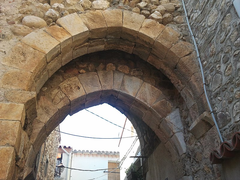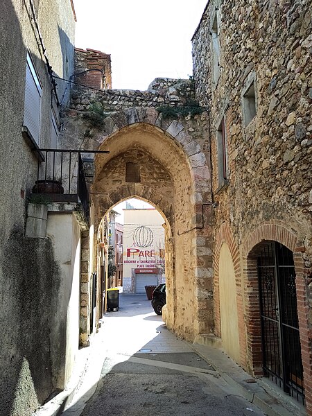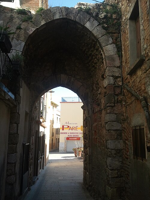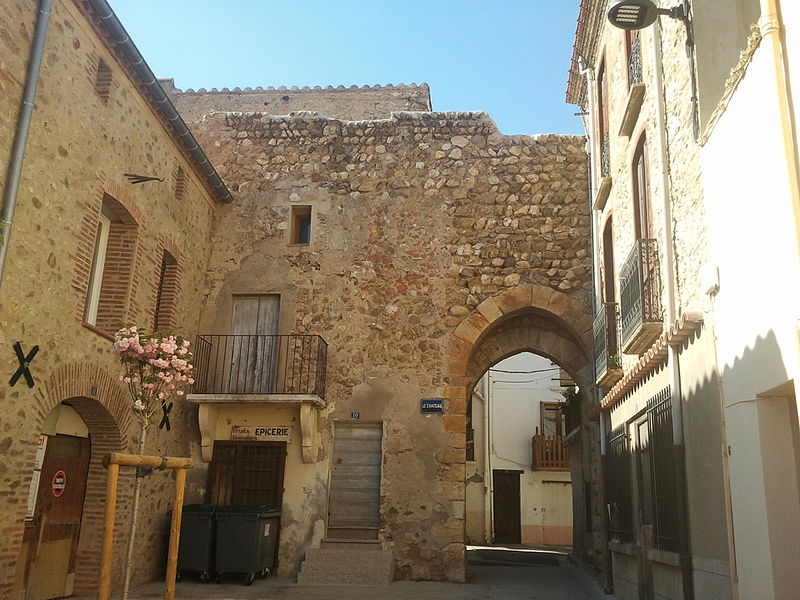 L'ouvrage est construit en gros galets disposés en épi et assisés sans chaînage de briques, appareil retrouvé également sur certaines courtines et qui, selon les observations, exclut en principe une influence mayorquine. Les arcs brisés, avec joint vertical au sommet, témoignent d'une datation relativement tardive, plutôt vers la fin du XIIIe siècle. L'entrée extérieure comporte deux arcs successifs séparés par un mâchicoulis ; le premier arc est plus élevé que le second et tous deux reposent sur des corbeaux biseautés. L'arrière voussure est voûtée en berceau légèrement brisé ; elle comprend un arc de tête avec clé sommitale, sans impostes aux naissances, et supporte un élément de chemin de ronde beaucoup plus large que celui conservé sur certains vestiges de courtines. Sous le passage, au revers de l'entrée, subsistent les vestiges d'une niche. La porte et les fragments de murs qui l'entourent constituent l'essentiel des vestiges défensifs conservés du village.