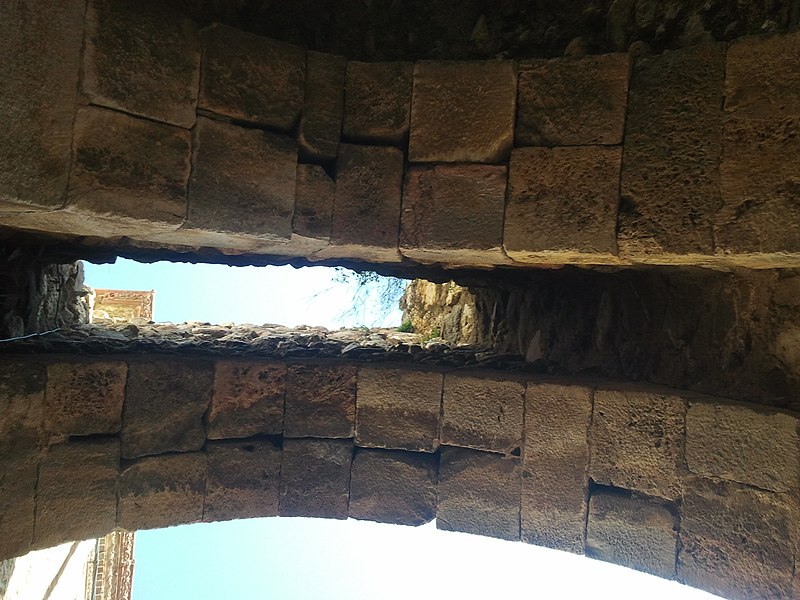Édification de la porte fortifiée avec des arcs brisés et un appareil en galets.