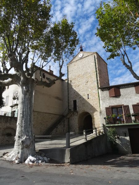 Alaigne faisait partie des seigneuries de l'archevêque de Narbonne. Le castrum est mentionné en 1252 et 1309, mais la construction de la porte fortifiée actuelle est postérieure. L'édifice adjacent servait déjà de maison presbytérale avant la Révolution et apparaît comme tel sur un plan du XVIIIe siècle. La porte sud, appelée Pépi ou Popy, est une porte profonde surmontée d'une tour contenant trois salles superposées. La seule ouverture ancienne se situe au premier étage, côté sud : une embrasure verticale, évasée circulairement à ses extrémités. Le passage sous la tour est couvert d'une voûte en plein cintre ; en avant de cet arc, la première voûte présente une fente destinée au mâchicoulis. La clé de l'arc d'entrée sud est sculptée d'un écu suspendu par une courroie retordue. Plus haut dans le mur, une large pierre sculptée en relief porte le blason en accolade de l'archevêque François Halle, encadré par deux pinacles à crochets et surmonté d'une accolade ; au‑dessus du fleuron figurent les initiales gothiques IHS en relief. Un cadran solaire à chiffres gothiques est encastré encore plus haut dans le mur. La porte du presbytère, antérieure à la tour, forme un arc brisé composé de onze claveaux ; son encadrement intérieur est chanfreiné et la clé sommitale reprend le motif d'un écu suspendu par un lien retordu. Dans le mur du presbytère, à l'extérieur de la porte fortifiée, une pierre rectangulaire sculptée en relief porte le blason de François‑Guillaume de Castelnau de Clermont‑Lodève, archevêque de Narbonne. L'édifice est inscrit au titre des monuments historiques en 1948.