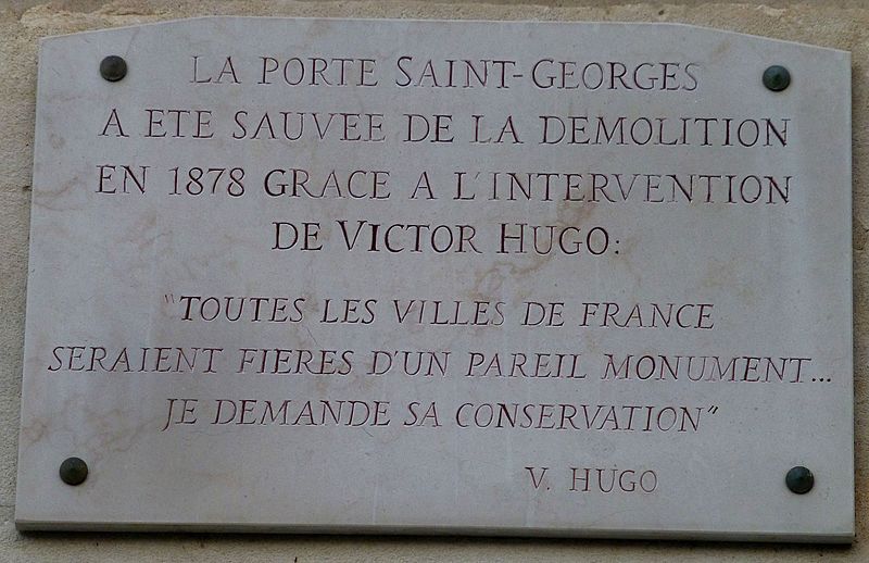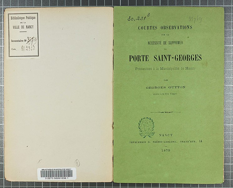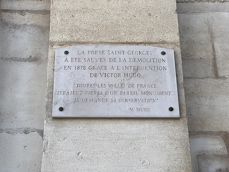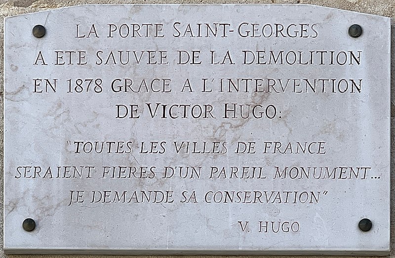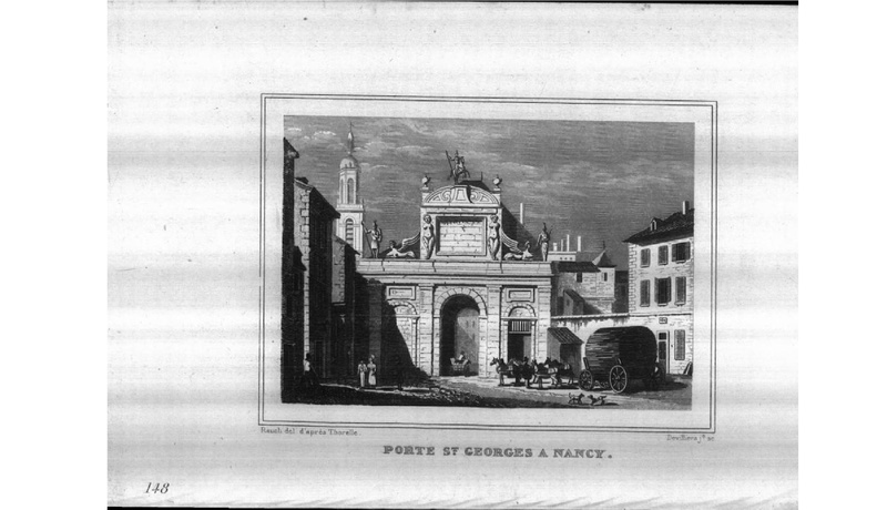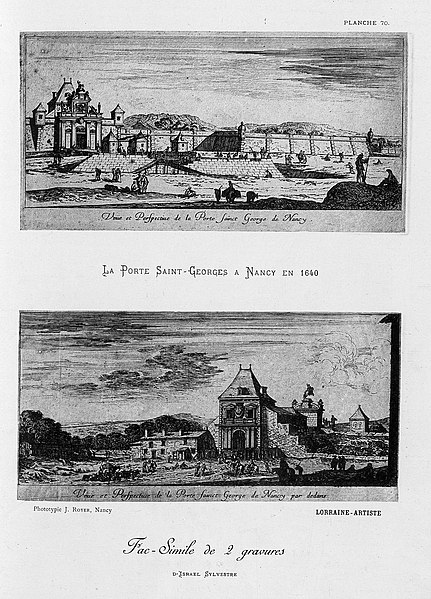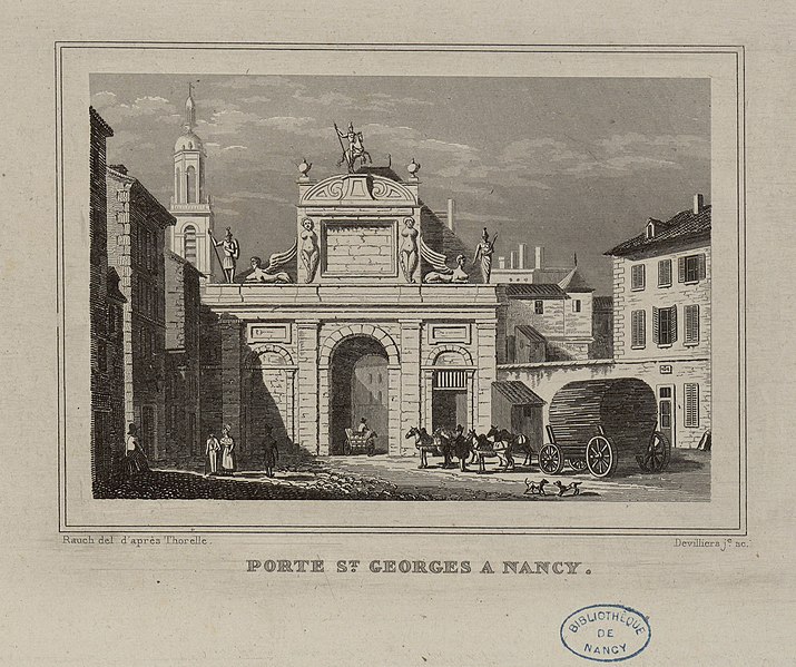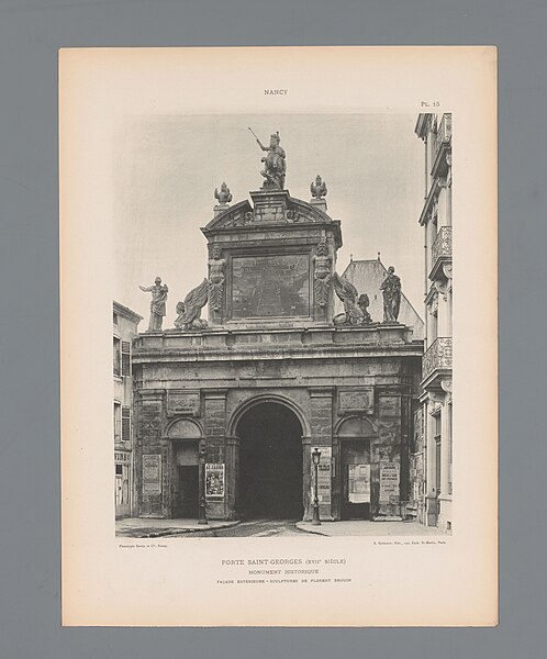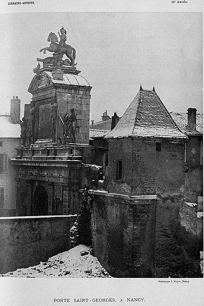La porte Saint‑Georges est une porte de Nancy, érigée au tout début du XVIIe siècle à l'est de la ville neuve. Elle se situe place Saint‑Georges, à l'extrémité ouest de l'avenue du XXe Corps, à l'intersection avec la place du Colonel‑Driant et à proximité de la rue Saint‑Georges. La façade monumentale, de composition d'ordre toscan et marquée par l'influence de Jean‑Baptiste Stabili, est surmontée d'un fronton couronné par la statue équestre de Saint Georges, œuvre de Florent Drouin. De part et d'autre du fronton se trouvent des allégories de la guerre et de la paix sculptées par Jean Richier ; la trace des grandes armes de Lorraine, aujourd'hui mutilées, est visible au centre de la composition, et des statues de sphinx ornent la base du fronton. La contre‑façade conserve l'allure sobre d'un bâtiment de la Renaissance. La porte doit son nom à la statue équestre du chevalier Georges de Lydda réalisée par Florent Drouin, datée de 1608, qui se trouve sur le monument. Elle fait partie des trois portes créées lors de l'aménagement de la ville neuve et, avec la porte Saint‑Jean, délimitait un large axe de communication est‑ouest correspondant aux actuelles rues Saint‑Jean et Saint‑Georges. Pendant la Révolution, elle porta le nom de « Porte de la Fédération » en raison des fêtes qui se déroulaient hors les murs et dont les cortèges passaient sous la porte ; par délibération municipale elle fut ensuite appelée « Porte de la Meurthe » à partir de l'an III de la République et jusqu'à la Restauration. Menacée de destruction lors de l'installation du premier tramway hippomobile à la fin du XIXe siècle, la porte fut sauvée en 1878 grâce à un comité de sauvegarde du patrimoine créé par le verrier Émile Gallé, qui reçut le soutien de Victor Hugo. La porte Saint‑Georges a été classée au titre des monuments historiques par un arrêté du 17 mars 1879, classement confirmé par l'arrêté du 31 août 1883. Parmi les références consacrées au monument figurent l'article de Christian Corvisier et René Elter dans les actes du Congrès archéologique de France (session de Nancy et Lorraine méridionale) et la notice disponible sur stanislasurbietorbi.com.