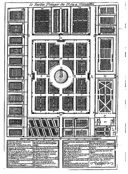Le potager du Roi, jardin potager de neuf hectares près du château de Versailles, a été créé en 1683 par Jean‑Baptiste de La Quintinie à la demande de Louis XIV pour alimenter la cour. Son sort évolue après la Révolution : successivement mis en location puis jardin d'application, il est exploité par l'École nationale supérieure d'horticulture de 1874 à 1995, puis pris en charge par l'École nationale supérieure de paysage de Versailles depuis 1995. Classé, avec le parc Balbi voisin, aux monuments historiques par arrêté du 15 mars 1926, il est reconnu Jardin remarquable et inscrit au patrimoine mondial de l'UNESCO en 1979 avec le parc de Versailles. Potager de château typique, il se situe à l'écart du parc, est entouré de hauts murs et destiné à la production alimentaire, contrairement aux potagers décoratifs intégrés à leur château. Sa surface de neuf hectares en fait le plus grand potager de France et le distingue par l'abondance de murs intermédiaires qui jouent le rôle de coupe‑vent, d'accumulateur de chaleur et de support pour des palissages formant de véritables tapisseries végétales. Ces murs, constitués de deux parements de moellons avec remplissage argileux, exigent un entretien du faîtage pour éviter que la pluie ne lessive l'intérieur et provoque des effondrements. Le potager fut aussi un jardin d'essais où l'on expérimentait amendements, sélection variétale, tailles, greffage, traitements, acclimatation d'espèces méditerranéennes ou tropicales, et forçage sous châssis, cloches ou serres afin d'obtenir des produits hors saison. La création a exigé la transformation d'un marécage proche de l'aile du midi du château : drainage, aqueduc souterrain, remblai apporté par la terre de la future pièce d'eau des Suisses et enrichissement des sols par de nombreux tombereaux de fumier issus des écuries. La grille du Roi, œuvre du serrurier Louis Fordrin et l'une des rares grilles d'origine de Versailles, donne accès au jardin depuis l'allée du Potager et a bénéficié d'une restauration soutenue par le Fonds mondial pour les monuments en 1993. Dans son Instruction pour les jardins fruitiers et potagers, La Quintinie relate les difficultés rencontrées et préconise des méthodes qui firent du potager une vitrine du savoir horticole français. À l'origine, de nombreux carrés étaient bordés de fruitiers taillés en gobelet, pratique moins contraignante que la taille en espalier, dont l'abandon systématique ultérieur a eu des conséquences durables. Le potager devait fournir en toutes saisons des fruits et légumes à la Bouche du roi, former des jardiniers et développer des techniques de culture novatrices pour améliorer qualité et productivité. La Quintinie y expérimenta et sélectionna près de 400 variétés légumières — laitues, épinards, oignons, choux, artichauts, poireaux, pois, tomates, aubergines, asperges, carottes, champignons de Paris, courges — et fit acclimater de nombreux fruits comme melons, cerises, fraises, figues, raisins, pommes et poires. Une partie du jardin était consacrée aux plantes médicinales et aux fleurs, et des plantes exotiques rapportées par les voyageurs, tels kakis et grenades, y furent acclimatées, les agrumes étant pour leur part réservés à l'Orangerie de 1686. Le potager a également été un terrain d'innovation technique : taille savante, choix de porte‑greffe, paillage, irrigation, utilisation massive de fumier, murs créant des microclimats, cloches de verre et serres chauffées au bois, munies des premiers grands vitrages fournis par la manufacture Saint‑Gobain. L'Instruction de La Quintinie, publiée à titre posthume en 1690, rassemble ces observations et méthodes et montre comment hâter ou retarder les productions pour assurer des fruits et légumes hors saison. Au XIXe siècle et au début du XXe, le potager devient jardin d'application et voit se développer des techniques comme le thermosiphon ; l'École nationale d'horticulture gère le site de 1873 à 1995, période durant laquelle le nombre d'arbres passe, selon Vincent Piveteau, de 1 500 à 15 000 en 1910. L'uniformisation de la taille en espalier pour renforcer l'aspect vitrine a considérablement augmenté la charge de travail et les coûts d'entretien, et des mutations dans la formation ont contribué à une pénurie de main‑d'œuvre et à un recul progressif du verger. Le jardin se compose essentiellement du grand carré central de trois hectares, consacré aux légumes et divisé en seize carrés autour d'un grand bassin circulaire servant de réserve d'arrosage, et d'une trentaine de jardins clos et vergers protégés par de hauts murs. Certaines terrasses entourant le bassin ont été aménagées en rampes pour faciliter la circulation et, au XVIIIe siècle, six murs furent supprimés dans la partie sud, réduisant le nombre de jardins clos. Depuis 1995, l'École nationale supérieure de paysage assure la responsabilité du potager, qui reste à la fois un lieu de formation, un jardin historique ouvert au public et un espace de production. Les méthodes mises en place depuis 1995 comprennent des approches permacoles et, à partir de 2015, l'arrêt de toute pulvérisation de traitements, y compris de produits « naturels », décision qui a entraîné des pertes importantes d'arbres et réduit le verger à 2 787 sujets lors du recensement de 2018. Le site compte aujourd'hui plus de 460 variétés fruitières sur quelque 5 000 arbres et produit annuellement 40 à 50 tonnes de fruits et 20 tonnes de légumes, dont une partie est vendue en boutique et au marché Notre‑Dame de Versailles. Ouvert au public depuis 1991 et recevant près de 40 000 visiteurs par an, le potager recherche des partenaires et des mécènes pour financer l'entretien et la restauration nécessaires à la conservation de cet ensemble horticole historique. Les choix de gestion récents ont suscité des controverses doc