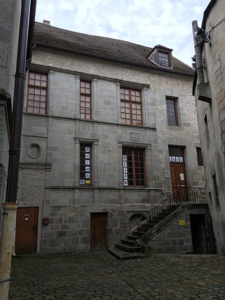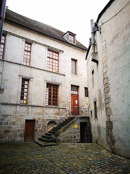 Les parties du XVIIe siècle comprenant le portail sur la place du Marché, les façades en retour d'équerre construites en granit et décorées de pilastres et cartouches, l'escalier en pierre et la salle à rez-de-chaussée de l'aile avançante : inscription par arrêté du 26 juillet 1934