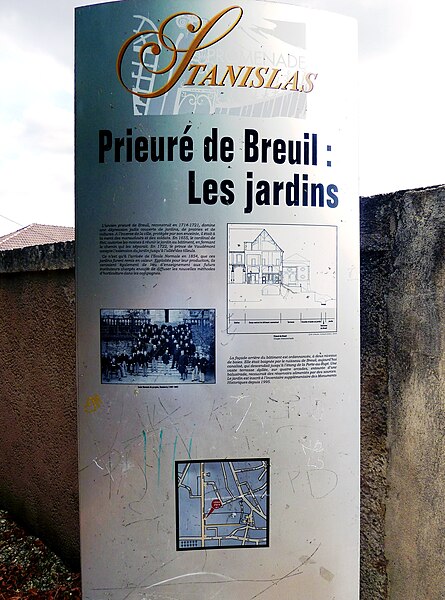 L'ancien prieuré de Breuil est situé à Commercy, dans le département de la Meuse en région Grand Est. Des bénédictins de Molesmes fondent le prieuré vers 1090. Au XVIIe siècle, l'établissement est occupé par des religieuses et sert de scolasticat ; l'édifice est restauré en 1652 et ses dépendances entre 1656 et 1666. Les bâtiments conventuels, en pierre, sont reconstruits au début du XVIIIe siècle sous la direction de Léopold Durand, les travaux s'étant déroulés entre 1714 et 1754, date portée sur l'entablement de la façade sud de l'aile droite. Le jardin est aménagé après 1722 et le colombier édifié en 1729. Un collège fondé par dom Calmet en 1751 est construit en 1757, date portée sur sa façade. Les trois corps de logis du milieu du XVIIIe siècle forment un U autour du cloître; l'église qui fermait l'ensemble au sud a été démolie au début du XIXe siècle. Les trois galeries s'ouvrent par des arcs en anse de panier; les distributions intérieures ont été modifiées à partir du XIXe siècle, mais l'escalier d'honneur placé dans l'angle nord-ouest conserve son organisation du XVIIIe siècle. Le prieuré est vendu comme bien national en 1792, transformé en sous-préfecture puis en gendarmerie autour de 1800, et utilisé comme école normale d'instituteurs de 1854 à 1962. Le site comporte notamment un cadran solaire et le bâtiment du collegium. Au titre des monuments historiques, le prieuré est inscrit par arrêté du 23 décembre 1926; cette protection est précisée par un arrêté du 4 avril 1984 qui classe les façades et toitures ainsi que l'escalier de l'aile ouest avec sa rampe en fer forgé. L'ancien jardin, incluant ses murs de clôture d'origine (à l'exclusion du gymnase moderne), est inscrit par arrêté du 20 juillet 1995, et la terrasse avec sa balustrade, le mur de soutènement incluant ses arcades, le pont-escalier sur le Breuil, les viviers et le sol de la parcelle font l'objet d'un classement par arrêté du 18 juin 2008.