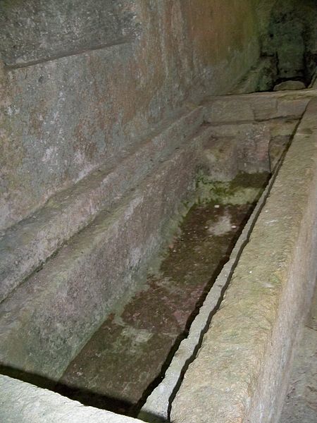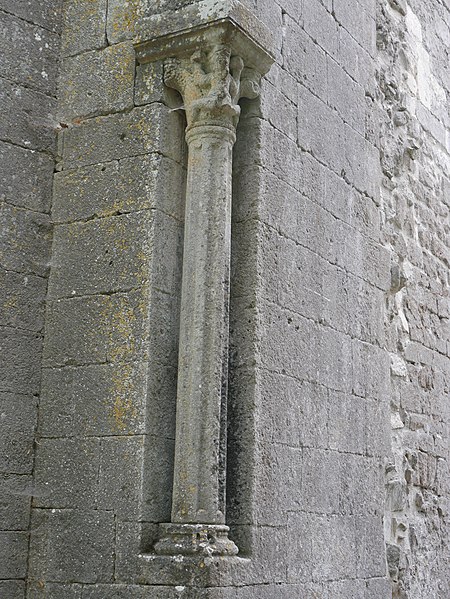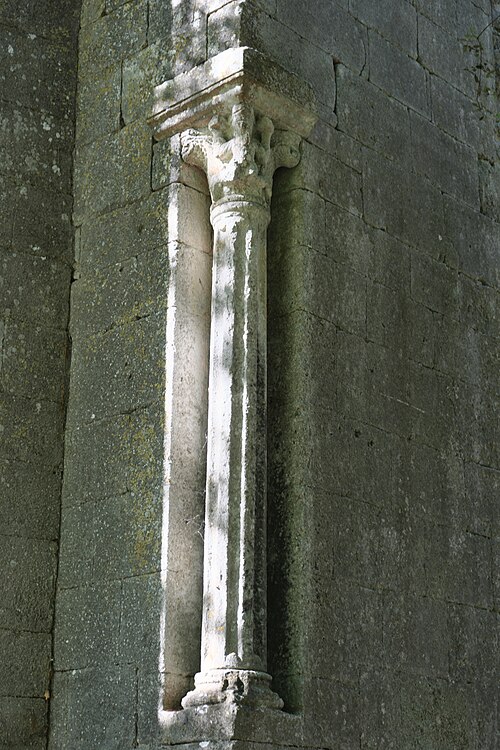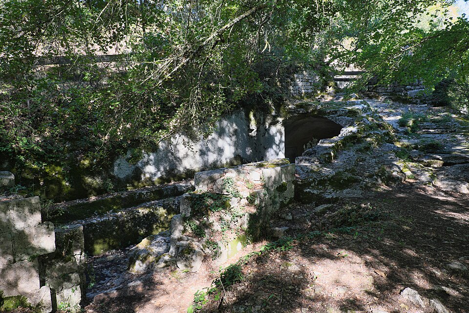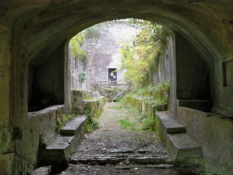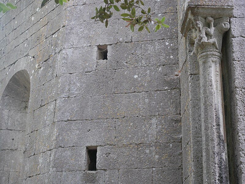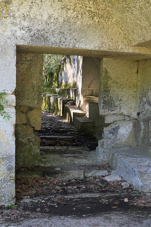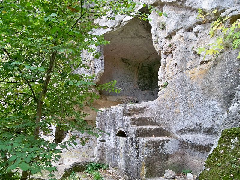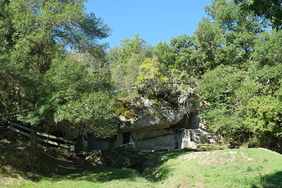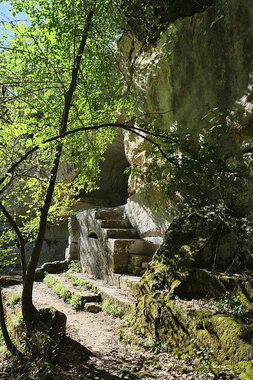 La longue galerie rupestre, accessible par une porte en plein cintre ouverte dans le mur nord et par un escalier monumental légèrement en contrebas de la chapelle, présente une partie ouest taillée dans le roc et une face est soigneusement maçonnée. Sa première section, où s’alignent des tombes rupestres du côté du levant, était couverte de voûtes d’arête sur dix travées reposant sur des colonnettes monolithiques ; trois de ces colonnettes ont été dégagées lors des fouilles et leurs fûts sont lisses, cannelés droits ou torses. Les chapiteaux, de style corinthien, se répartissent en deux registres, l’un simple à palmettes, l’autre plus riche mêlant palmettes, feuilles d’acanthe et entrelacs. La seconde partie, profondément creusée, conserve un mur au levant marqué par des marques de tâcherons et percé de quatre portes donnant soit à l’extérieur, soit vers les anciens bâtiments conventuels ; une banquette orientale a été aménagée pour recevoir des tombeaux anthropomorphes qui se succèdent tout le long de la galerie, puis la banquette et le sol ont été utilisés pour creuser d’autres tombes. Dans la partie nord, une porte communique avec l’église Saint-Jean-Baptiste et une autre conduit à l’extérieur par un couloir creusé dans le rocher, sur la paroi duquel a été gravée une croix potencée.