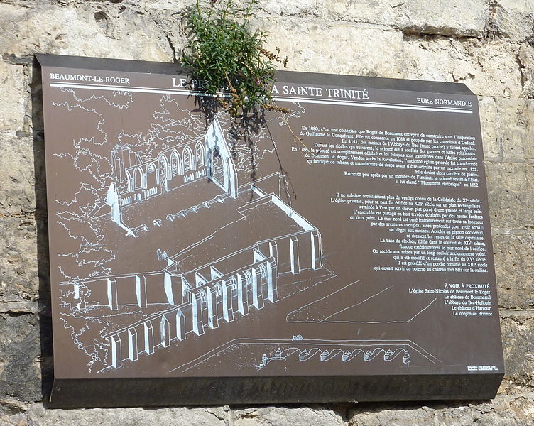 Le prieuré de la Sainte-Trinité est un ancien monastère situé à Beaumont-le-Roger, dans l'ouest du département de l'Eure, en Normandie. Il occupe la mi-hauteur d'un coteau de la vallée de la Risle, dans le pays d'Ouche à proximité de la campagne du Neubourg, et offre de larges perspectives sur la vallée et la ville. L'édifice, élevé à la fin du XIe siècle, fut d'abord une collégiale fondée par Roger de Beaumont. La construction débute en 1070 et la collégiale est consacrée en 1087 en présence de plusieurs dignitaires et seigneurs ; Roger de Beaumont la dote par charte le jour même. La collégiale est confiée à des chanoines anglais de Sainte-Frideswide d’Oxford, dont le premier supérieur, Wazon, prend le titre de doyen. Avant de se retirer à l'abbaye de Préaux, Roger de Beaumont transmet aux chanoines plusieurs églises et dépendances ainsi que des logements, notamment les églises Saint-Nicolas et Saint-Léonard de Beaumont-le-Roger et des maisons au Neubourg. Au milieu du XIIe siècle, la collégiale décline et, en 1142, elle devient prieuré dépendant de l'abbaye du Bec : douze moines remplacent les chanoines et Robert, moine du Bec, est nommé premier prieur. Le transfert suscite un litige avec les chanoines d'Oxford au sujet des dîmes ; l'affaire est portée devant le pape Eugène III et aboutit en 1147 à un compromis qui attribue aux chanoines d'Oxford le domaine d'Edenetown. Le prieuré reçoit de nombreuses donations et privilèges au cours des siècles suivants, ainsi que des confirmations pontificales. Au XIIe siècle, Robert de Meulan accorde au prieuré des privilèges importants, qui permettent notamment de presser les récoltes au pressoir de Vaux et d'assurer le transport du vin à travers son domaine ; d'autres donations sont consenties entre 1182 et 1199, et une bulle du pape Célestin confirme certaines pensions. En 1258, Saint Louis passe par Beaumont et afferme aux religieux des vignes près du château, et en 1307 Philippe IV le Bel leur accorde des privilèges commerciaux et d'exemption de droits dans le royaume. À partir de la fin du XVIe siècle et jusqu'à la Révolution, le prieuré connaît un fort déclin numérique : on compte quatre moines en 1580, puis un prieur et deux chanoines en 1634, et seulement deux chanoines en 1789. Après la Révolution, des commerçants rouennais procèdent à des réparations, bouchent des ouvertures et consolident les bâtiments en réutilisant des matériaux provenant du château du président du Parlement de Rouen. Au XIXe siècle, l'ensemble passe entre diverses mains industrielles et abrite successivement une filature de coton, une fabrique de rubans et une manufacture de draps. Mis en vente en 1847, le prieuré est adjugé à un acquéreur qui détruit une partie des constructions pour revendre les pierres, utilisées dans plusieurs maisons de la ville ; en 1855 un incendie ravage les installations. En 1862, M. Lenormand empêche la démolition complète en achetant le site pour la Société des antiquaires de Normandie, mais des murailles sont ensuite démolies pour l'élargissement d'une route. Les vestiges ont été inscrits et classés à plusieurs reprises : inscrits sur une liste en 1862 puis déclassés en 1879, ils font l'objet d'un classement par arrêté du 2 mai 1916, et des jardins, logements et parcelles boisées ont été inscrits par arrêté du 16 février 2022. Aujourd'hui, le prieuré est en partie classé et inscrit et appartient à l'État. L'accès aux ruines se fait par une longue galerie voûtée flanquée de contreforts massifs, nécessaires en raison de l'implantation à flanc de coteau et renforcés par d'importants piliers en pierre cités comme hauts de quarante à quarante-trois pieds. Cette galerie, précédée d'un porche remanié au XIIIe siècle et modifiée à la fin du XVe siècle, pouvait servir de poterne au château qui dominait le prieuré. Les vestiges principaux sont ceux de l'église priorale, datée du XIIIe siècle, construite sur un plan rectangulaire et terminée à l'est par un chevet plat percé d'une large baie. L'édifice est divisé en huit travées éclairées par hautes fenêtres en tiers-point ; le mur nord présente des arcatures aveugles assez profondes pour avoir servi de sièges aux moines. Accolés au pignon occidental subsistent les restes de la salle capitulaire, et la base du clocher, édifiée au XIVe siècle, flanque extérieurement le mur nord de l'église.
