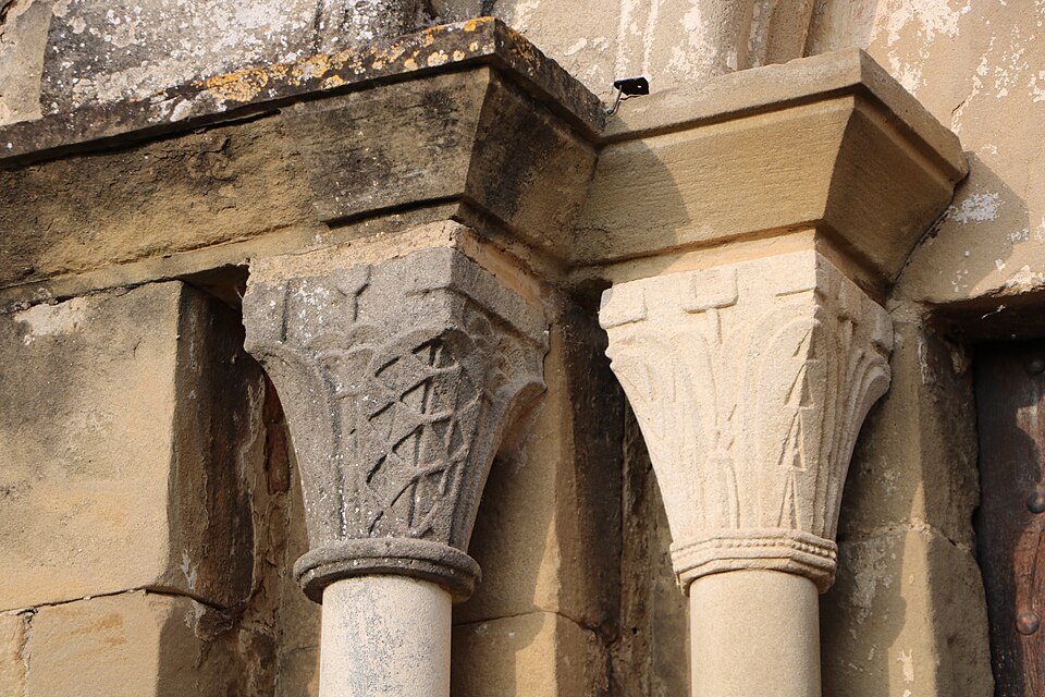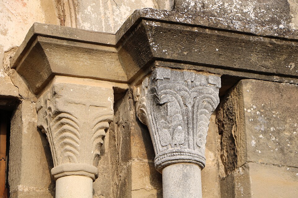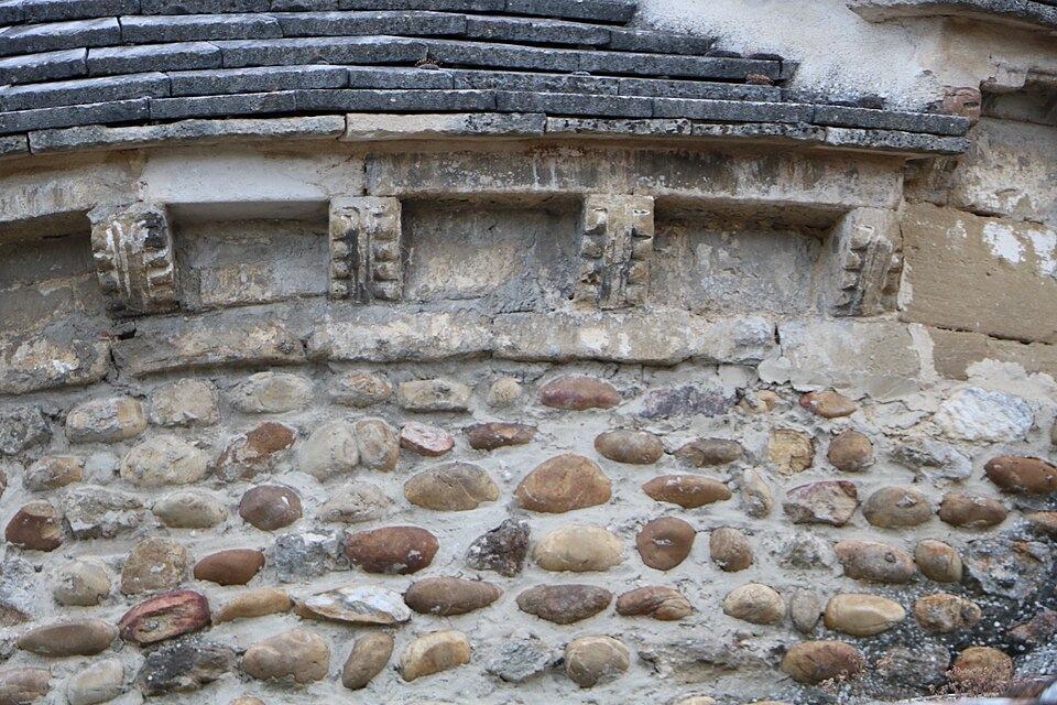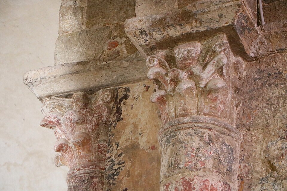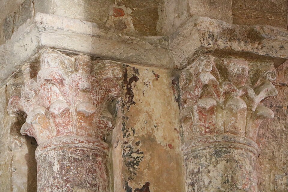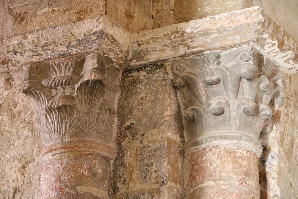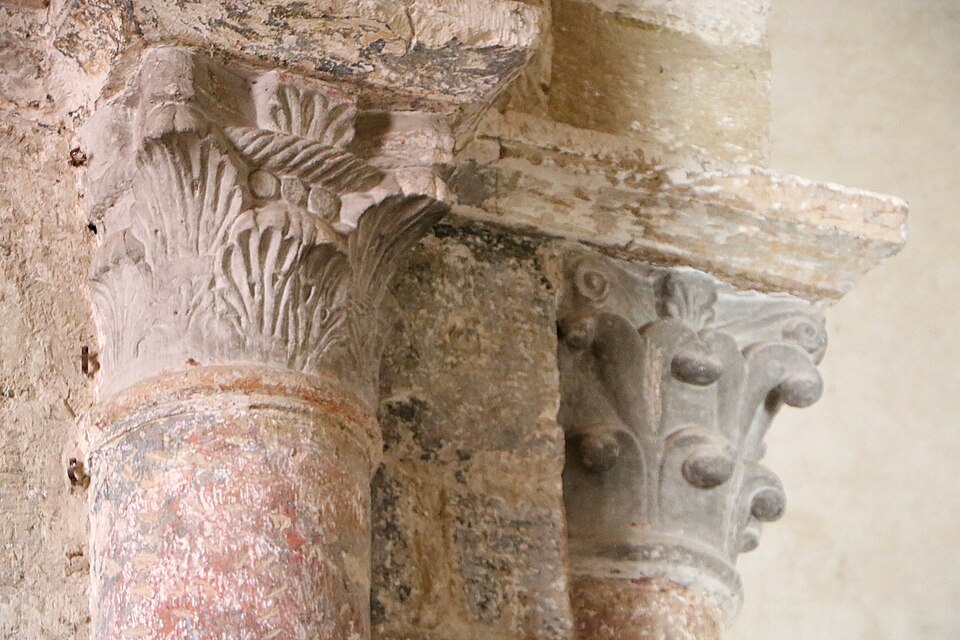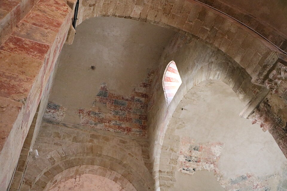 Seul le chevet de l'église conserve un état roman, avec une abside et deux absidioles voûtées en cul-de-four. La croisée est couverte d'une voûte en berceau et repose sur quatre grosses piles en tuf surmontées de chapiteaux. Trois de ces chapiteaux portent des motifs végétaux, le quatrième représente une petite tête d'où sort du feuillage, motif fréquent dans l'art de la vallée du Rhône. Des traces de peintures et de fresques subsistent, notamment sur la voûte d'une absidiole où apparaît le triangle de la Trinité.