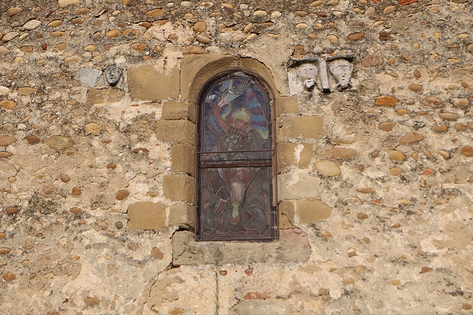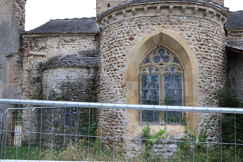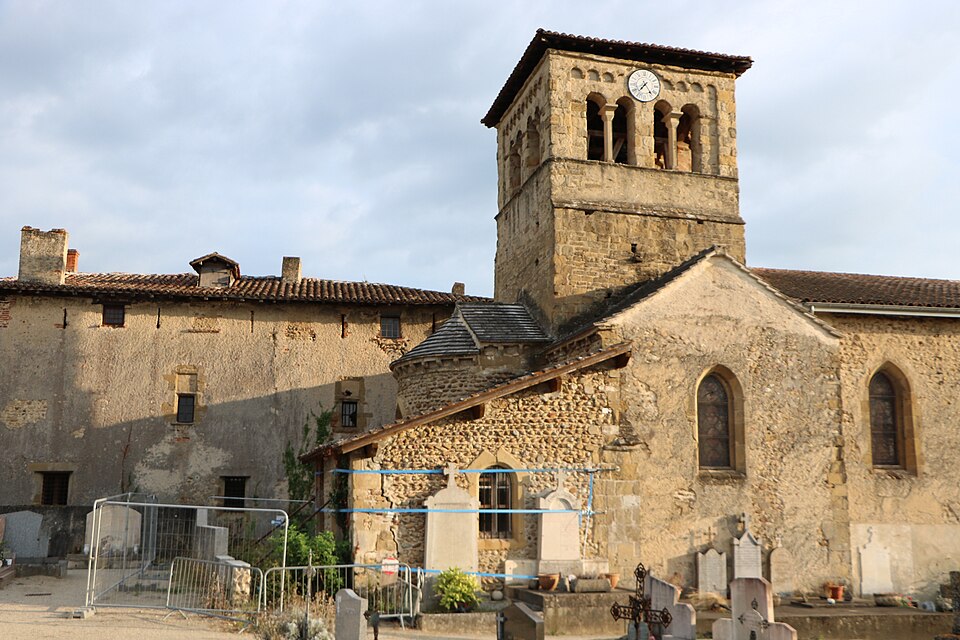 Le porche extérieur présente deux voussures en plein cintre surmontées de trois têtes sculptées à longues moustaches, disposées autour d'un vitrail représentant saint Georges; ces têtes semblent être des éléments gallo-romains réemployés. Dans le chœur, un double vitrail figure saint Pierre et saint Paul : les têtes des personnages datent du XVIe siècle tandis que le reste de la verrière a été restauré au XXe siècle. Le clocher, roman, trapu et quadrangulaire de tradition viennoise, a été reconstruit au XVIe siècle en molasse ; il comprend deux étages et des fenêtres géminées au deuxième niveau. En 1741, l'église faillit être interdite en raison de son mauvais état après la combustion du clocher et l'effondrement de la toiture. Rien ne subsiste aujourd'hui du prieuré clunisien ; les éléments visibles datent principalement des XVe et XVIe siècles.