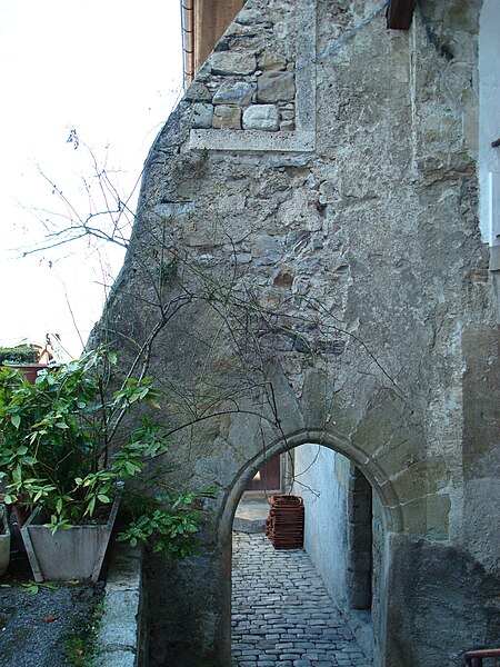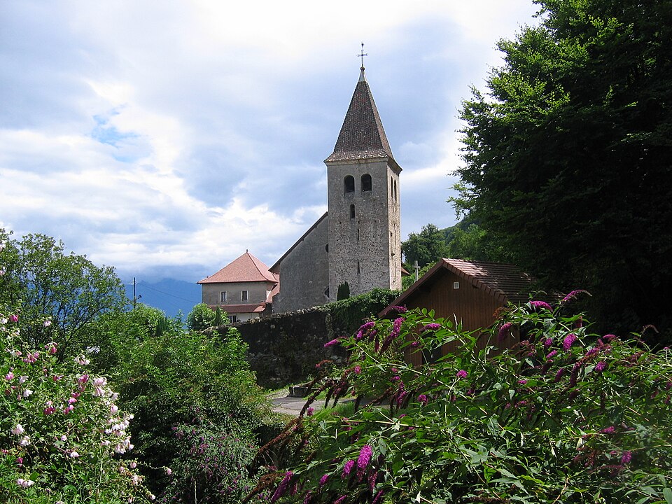 L'église Saint‑Bernard‑de‑Menthon mêle architecture médiévale (XIIIe siècle) et apports du XIXe siècle ; le chœur, ancienne chapelle du prieuré, mesure dix mètres de long sur sept mètres cinquante de large et sa voûte culmine à dix mètres ; il est rythmé par six colonnes de molasse à chapiteaux végétaux qui portent deux voûtes d'ogives et deux clés de voûte peintes représentant le Christ montrant ses stigmates et l'Agneau pascal. Le chevet est orné d'une rosace particulière à six lobes et six trèfles avec un centre évidé, ainsi que de deux grandes baies encadrées de colonnettes sculptées en molasse ; les vitraux représentent notamment saint Augustin et saint Bernard d'Aoste et une peinture du début du XVIIIe siècle illustre saint Bernard capturant le diable, un temple païen et un paysage montagnard. La nef du XIXe siècle comprend deux travées, est plus large que le chœur et a été insérée entre ce dernier et la tour.