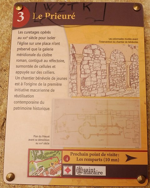 Le prieuré de Saint‑Macaire, constitué de l'église Saint‑Sauveur et des vestiges des bâtiments conventuels, se situe dans la commune de Saint‑Macaire en Gironde. Il occupe le cœur de la ville ancienne, aménagée en demi‑cercle autour de l'église, et figure parmi les monastères historiques de l'Entre‑deux‑Mers ; il se distingue notamment par les peintures murales du transept et de l'abside. L'origine du prieuré est mal connue : il succède à une villa gallo‑romaine appelée Ligena et se rattache à la figure légendaire de Makarios (Macaire). La chapelle primitive dédiée à saint Laurent, lieu de pèlerinage et de sépulture du fondateur, fut remplacée par une nouvelle église consacrée en 1038. Le prieuré connut de longues contestations avec l'abbaye Sainte‑Croix de Bordeaux, marquées par des actes de donation discutés et par la perte de reliques du fondateur. En 1096 le couvent fut détruit et la ville mise à sac par Guillaume IX, duc d'Aquitaine ; les moines rebâtirent ensuite l'église dans le style roman visible aujourd'hui. Les moines refusèrent toute obédience à Sainte‑Croix jusqu'en 1166. Du XVIe siècle jusqu'à leur expulsion en 1781, les Jésuites occupèrent le prieuré, période au cours de laquelle l'état des voûtes et diverses réparations furent régulièrement signalés. Aux XVIIIe et XIXe siècles, des aménagements intérieurs modifièrent l'usage paroissial et des travaux répétitifs furent nécessaires pour les toitures et les voûtes. La Commission départementale des Monuments historiques signala dès 1839‑1840 l'urgence de refaire la charpente et de consolider les voûtes ; le projet exécuté en 1841 remit notamment en état la couverture et entraîna la suppression du porche et la démolition de bâtiments conventuels au sud. Au XXe siècle, des restaurations ont permis de dégager la galerie méridionale du cloître et des fouilles sous la partie orientale mirent au jour, sur les murs de l'église préromane détruite en 1098, des peintures murales attribuées aux Xe‑XIe siècles ; ces fragments, décorés de rideaux et d'une frise végétale ornithologique, sont conservés au premier étage du réfectoire. Une pierre sculptée trouvée dans les fondations de la salle capitulaire, de type métope et relevant de l'art préroman, est conservée à la mairie ; une copie en bronze est incrustée dans la terrasse du 18 rue Carnot. L'église Saint‑Sauveur est classée au titre des monuments historiques par la liste de 1840 et le cloître est inscrit par arrêté du 21 décembre 1925. L'édifice, de plan en croix latine, présente un chœur composé de trois absides romanes polygonales voûtées en cul‑de‑four, un carré de transept à voûte gothique associant piles romanes et pilastres, ainsi qu'une nef comportant travées et voûtures des XIIe et XIIIe siècles. Le chevet est rythmé par une corniche à billettes portée par modillons et contreforts transformés en colonnettes, et un clocher hexagonal s'élève contre le flanc nord de la nef. L'église conserve un important répertoire sculpté roman autour des absides : chapiteaux historiés figurant épisodes bibliques, figures de saints, créatures hybrides et scènes morales ou satiriques, parmi lesquelles figurent le sacrifice d'Isaac, l'Annonciation, saint Macaire entouré de démons, la femme impudique et le porteur de poisson. La polychromie des arcades date du XIXe siècle ; les peintures murales gothiques de la voûte du sanctuaire, inspirées de l'Apocalypse et de la Légende dorée, ont été restaurées au XIXe siècle, étudiées en 1997 et fait l'objet d'une restauration en 2008‑2009. Le portail occidental appartient au gothique de la fin du XIIIe siècle et présente un tympan sculpté avec le Christ, des apôtres et des anges ; les vantaux de bois du XIIIe siècle, remarquables pour leurs ferrures, sont classés et conservés dans le narthex. Le décor peint de l'abside représente des visions apocalyptiques et des scènes du Jugement dernier, tandis que la voûte du transept illustre la vie de saint Jean et des épisodes mariaux. Le mobilier rassemble reliquaires, statues (dont une Vierge à l'Enfant du XVe siècle classée), un Christ régnant du XVIIIe siècle, tableaux provenant notamment de la période jésuite, bénitiers du XIIIe siècle et autres éléments liturgiques. Les cadrans solaires, les remploi lapidaires et la clef de voûte du narthex ornée des armoiries municipales témoignent des remaniements successifs et des réemplois au fil des siècles. Cet ensemble, entre continuités liturgiques et campagnes de restauration, témoigne d'une longue histoire religieuse et artistique qui fait du prieuré de Saint‑Macaire un site majeur du patrimoine local.