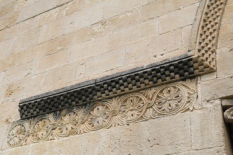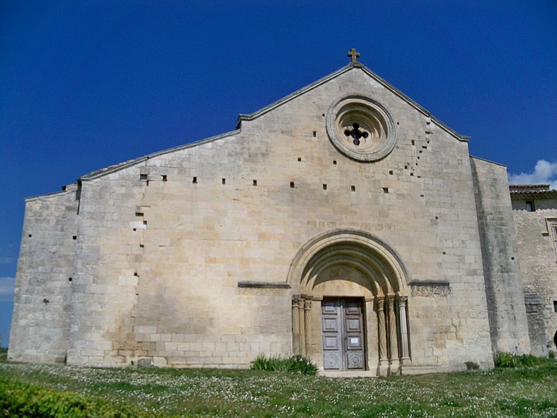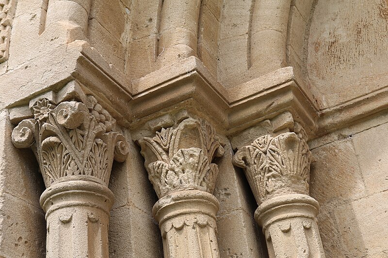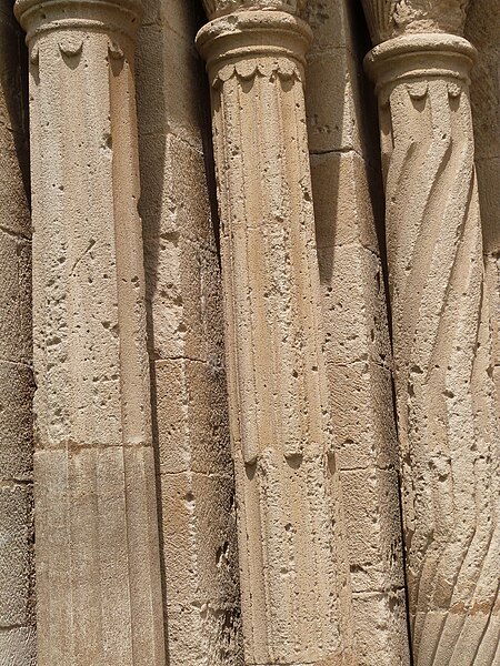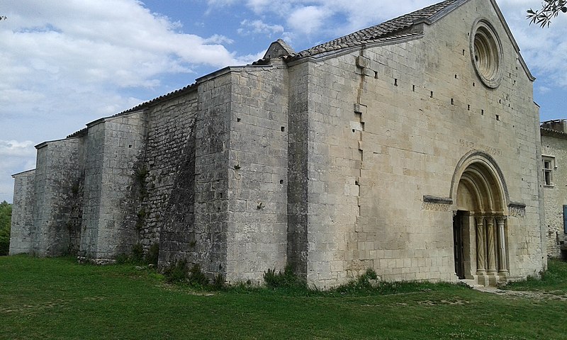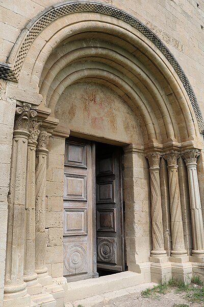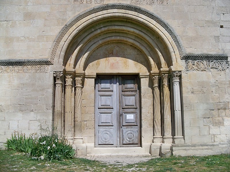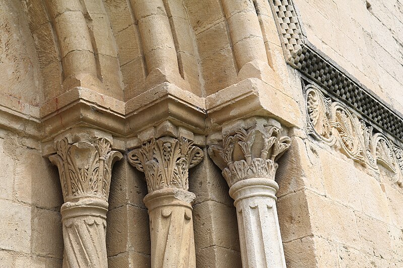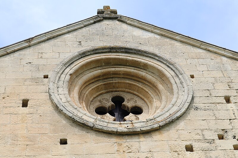 La façade occidentale, en pierre de taille assemblée en grand appareil, est percée d'un oculus et d'un portail richement sculpté et porte de nombreux trous de boulin témoignant des échafaudages. L'oculus est entouré de trois anneaux toriques et présente en son centre une ouverture quadrilobée dont les lobes alternent avec des rosaces gravées. Le portail est encadré par trois paires de colonnes à base et astragale torique, dont les fûts présentent des cannelures droites, torsadées ou en zigzag, et supportent des chapiteaux à feuilles d'acanthe qui portent une archivolte ornée d'arcs toriques ; la voussure externe est bordée d'une frise en damier qui se prolonge horizontalement de part et d'autre. Des rinceaux complètent la décoration du portail et il s'agit probablement de réemplois ; l'un de ces rinceaux, en haut à gauche, porte le signe symbolique de « l'union », formé de deux ellipses entrecroisées.