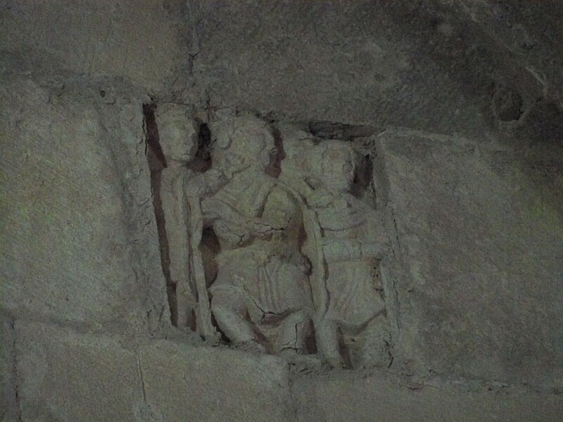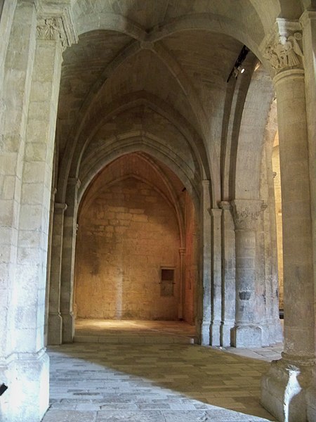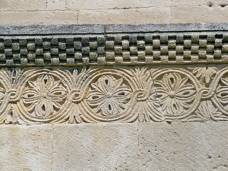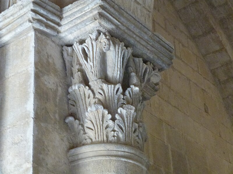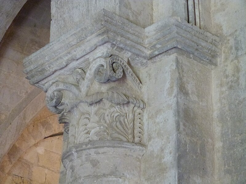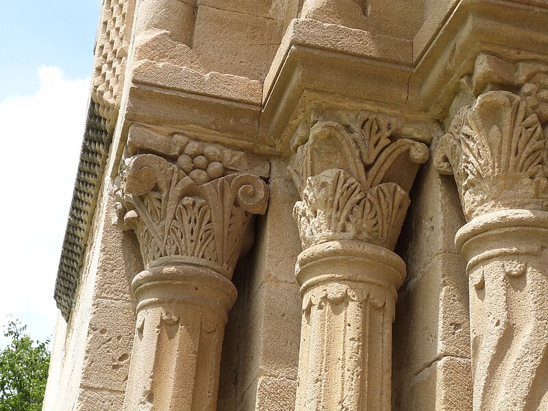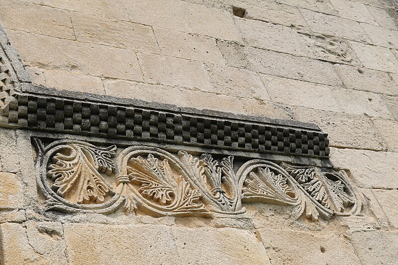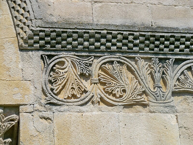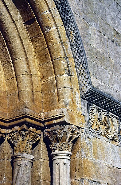 La façade occidentale, en pierre de taille assemblée en grand appareil, est percée d'un oculus et d'un portail richement sculpté et porte de nombreux trous de boulin témoignant des échafaudages. L'oculus est entouré de trois anneaux toriques et présente en son centre une ouverture quadrilobée dont les lobes alternent avec des rosaces gravées. Le portail est encadré par trois paires de colonnes à base et astragale torique, dont les fûts présentent des cannelures droites, torsadées ou en zigzag, et supportent des chapiteaux à feuilles d'acanthe qui portent une archivolte ornée d'arcs toriques ; la voussure externe est bordée d'une frise en damier qui se prolonge horizontalement de part et d'autre. Des rinceaux complètent la décoration du portail et il s'agit probablement de réemplois ; l'un de ces rinceaux, en haut à gauche, porte le signe symbolique de « l'union », formé de deux ellipses entrecroisées.