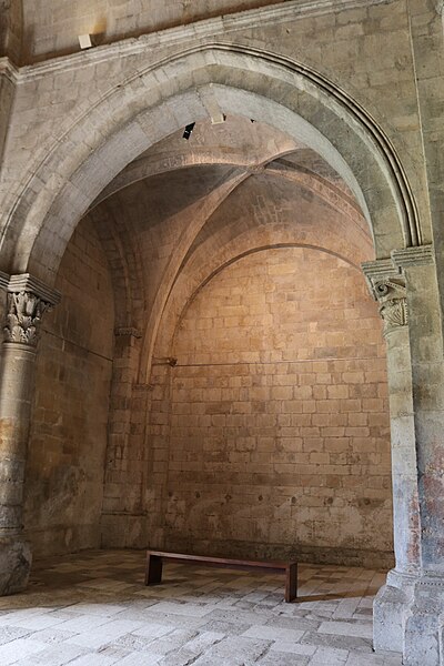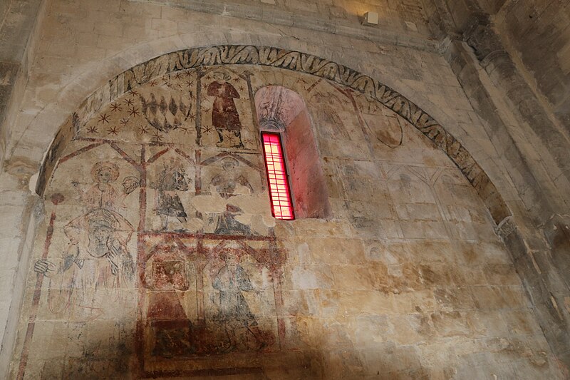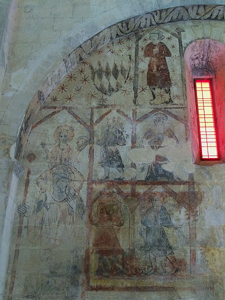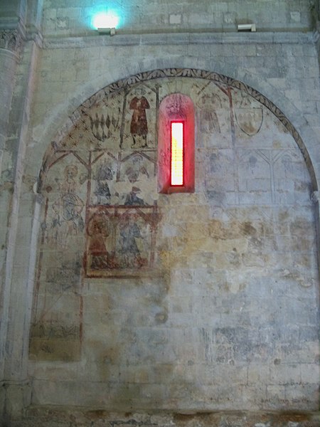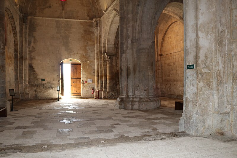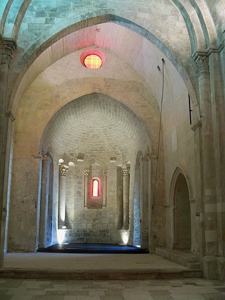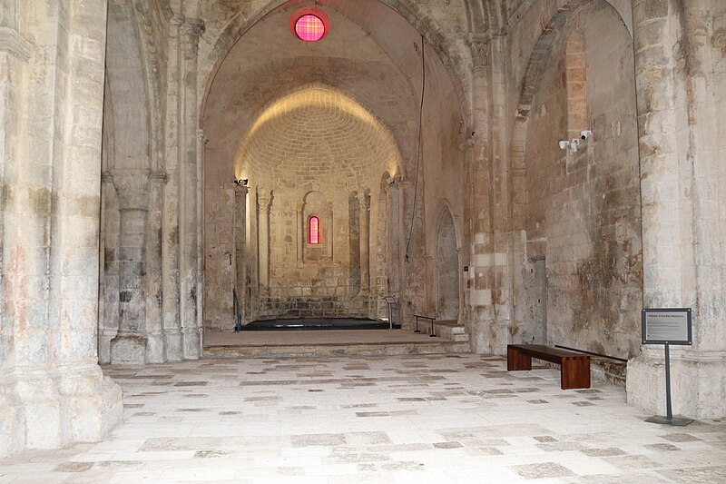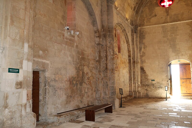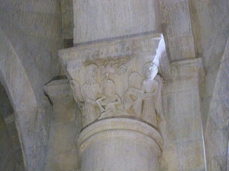 À l'intérieur, la nef est rythmée par des arcs de décharge latéraux séparés par des colonnes engagées surmontées de chapiteaux ornés de palmettes et de feuilles d'acanthe. On y remarque également un grand arc ogival bordé d'un cordon de bâtons brisés. Le chœur, de dimensions modestes, offre une décoration soignée : la fenêtre axiale à simple ébrasement est encadrée par deux colonnettes cannelées aux chapiteaux à palmettes qui soutiennent un arc de décharge; de part et d'autre, des colonnes monolithes à chapiteaux à feuilles d'acanthe sont logées dans des niches. Les six vitraux du chœur, créés par Aurélie Nemours en 1998, reprennent la géométrie de son œuvre abstraite par des plombs qui forment des lignes horizontales et verticales et proposent un rythme différent pour chacun des panneaux. Le rouge au sélénium utilisé pour l'un des vitraux, dit « rouge SNCF », permet d'obtenir une teinte stable, insensible aux variations du ciel, parce qu'il laisse passer une seule longueur d'onde du spectre.