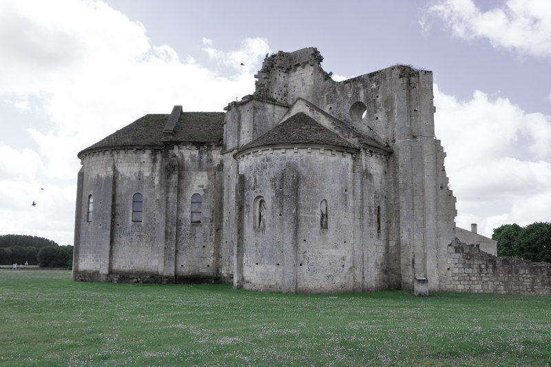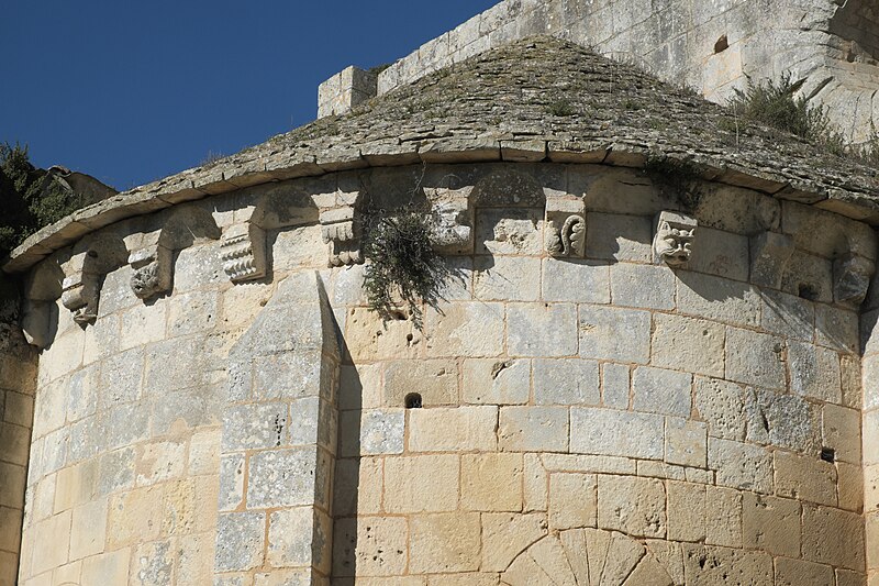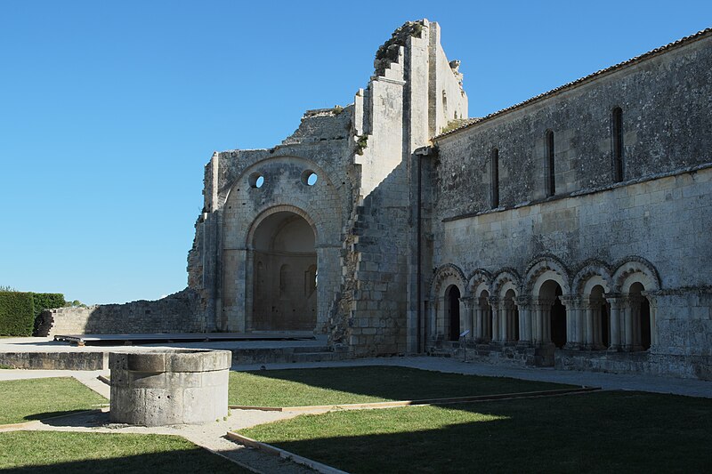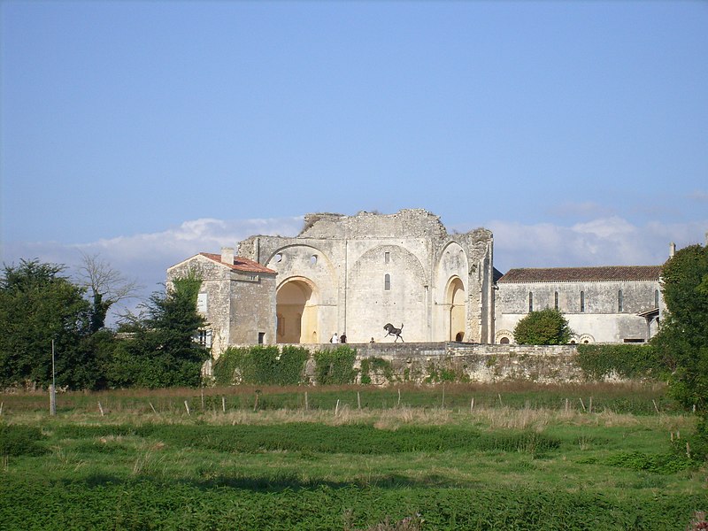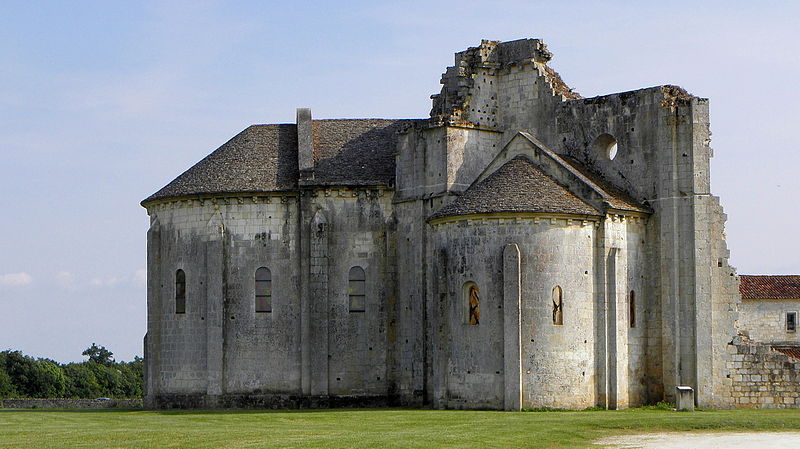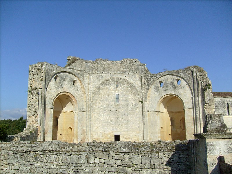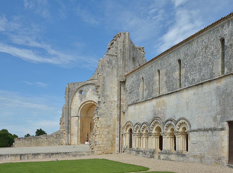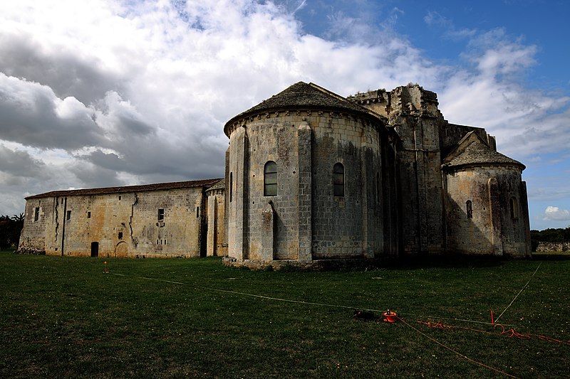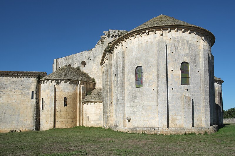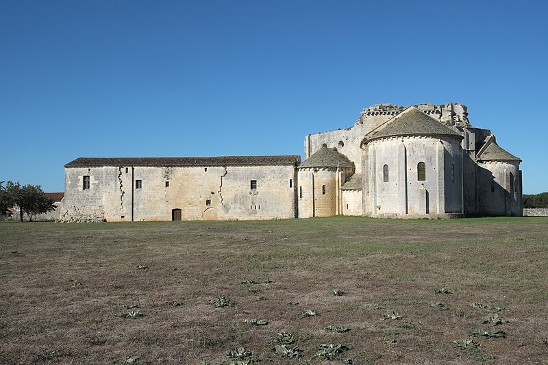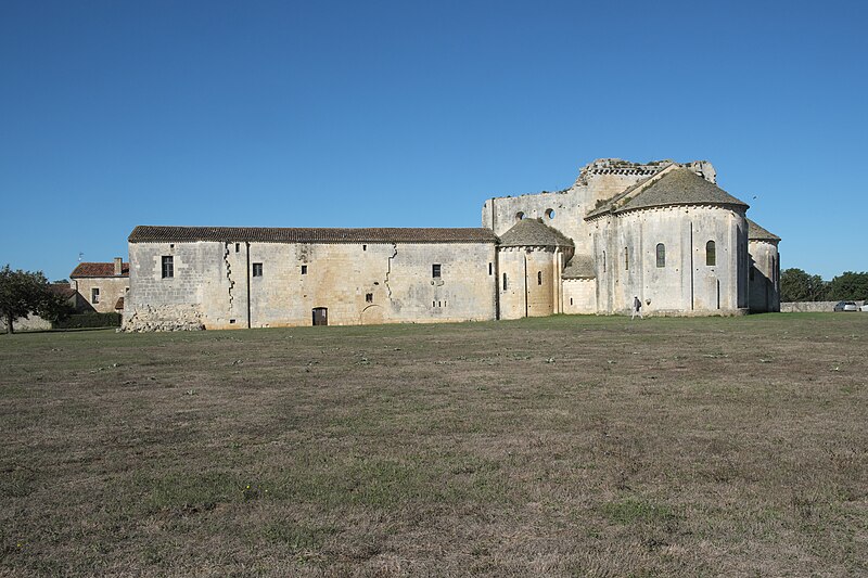 L'église romane conserve des vestiges d'une structure rare en Saintonge : une chapelle axiale de deux travées terminée par une abside en cul‑de‑four, flanquée de deux absidioles greffées sur un plan à pans coupés ; des sondages ont montré que l'édifice primitif reposait sur un plan centré octogonal rappelant celui de Saint‑Michel‑d'Entraigues. L'église initiale comportait cinq chapelles disposées autour de la chapelle axiale et devait mesurer environ 40 mètres dans l'axe et 39 mètres d'une absidiole à l'autre ; la chapelle axiale elle‑même atteignait 12 mètres de long sur 9 mètres de large pour une hauteur sous voûte de 12 mètres, tandis que les chapelles latérales mesuraient environ 6 par 5 mètres avec une hauteur de 10 mètres. Les voûtes, étayées par des arcs doubleaux reposant sur colonnes, présentent des chapiteaux sculptés à décors animaliers et végétaux — lions, volutes et entrelacs — notamment concentrés dans la chapelle sud, et les trois chapelles sont éclairées par des baies en plein cintre bordées de colonnettes à chapiteaux feuillagés ; des vitraux modernistes y ont été récemment posés. Le plan restitue en outre la probable présence d'un double déambulatoire formant deux corridors d'environ 3 mètres chacun.