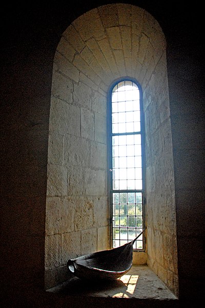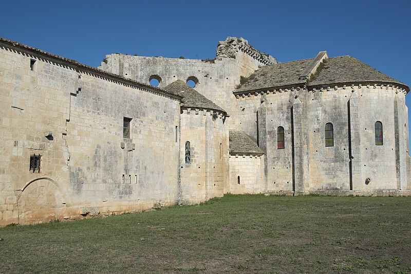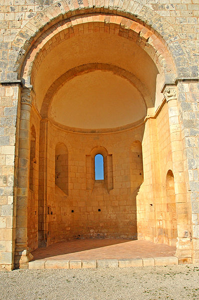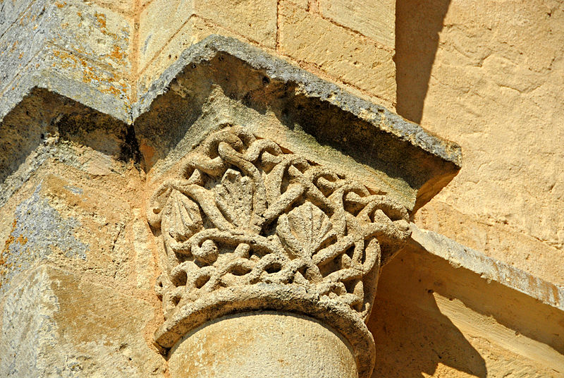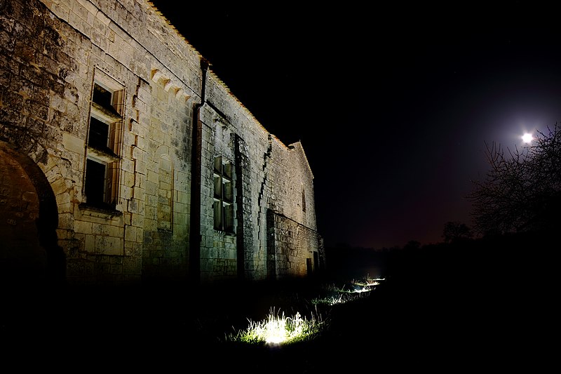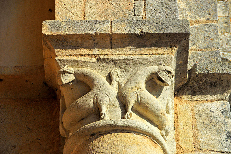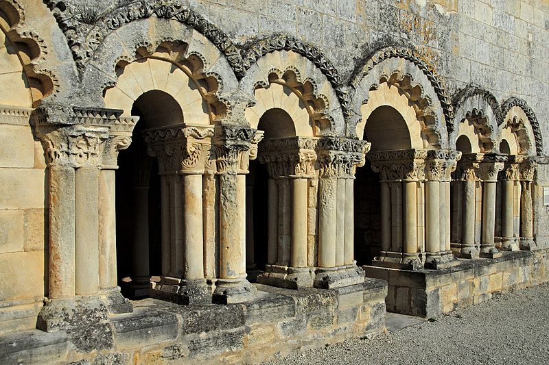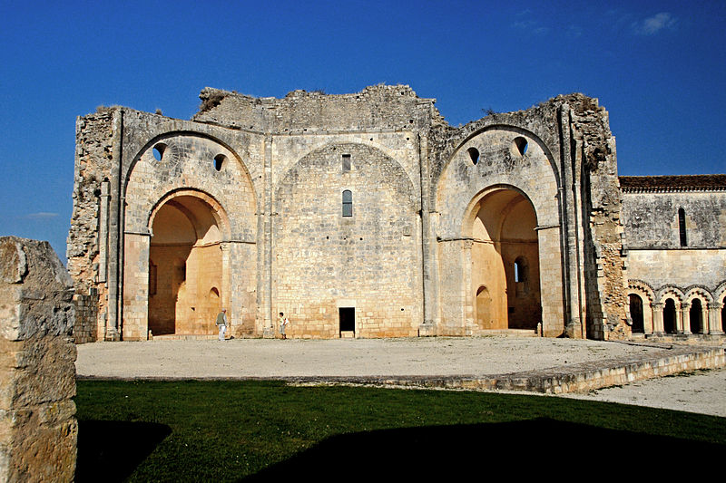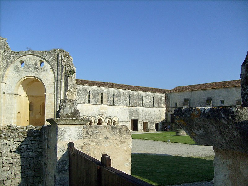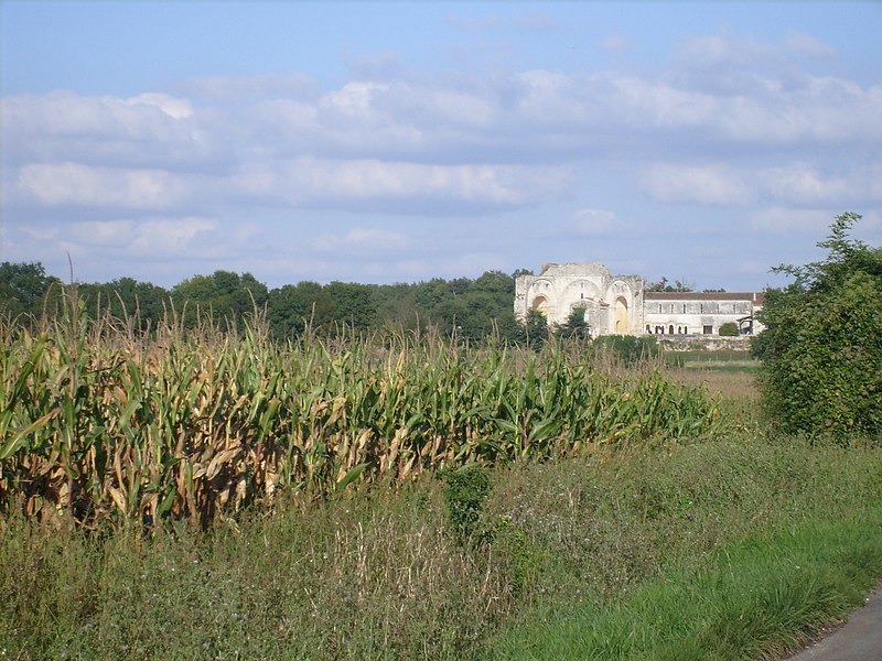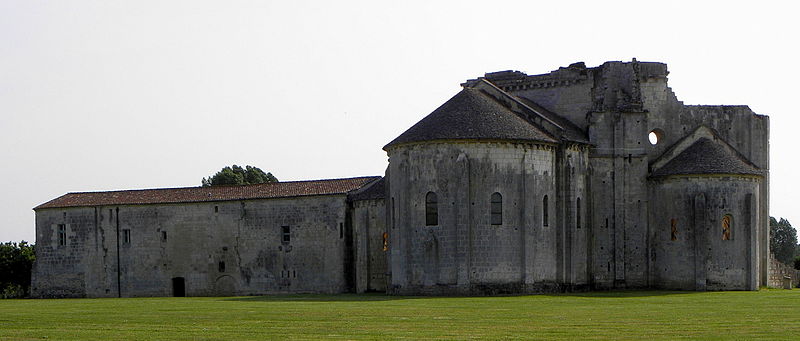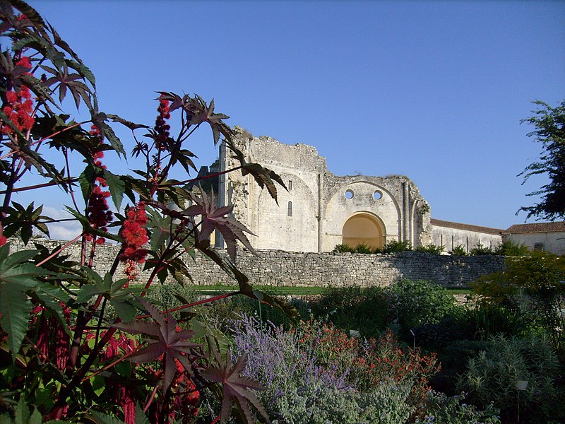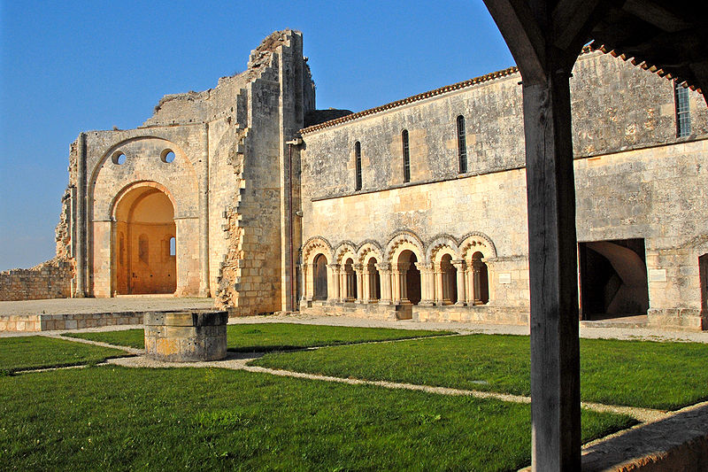 L'église romane conserve des vestiges d'une structure rare en Saintonge : une chapelle axiale de deux travées terminée par une abside en cul‑de‑four, flanquée de deux absidioles greffées sur un plan à pans coupés ; des sondages ont montré que l'édifice primitif reposait sur un plan centré octogonal rappelant celui de Saint‑Michel‑d'Entraigues. L'église initiale comportait cinq chapelles disposées autour de la chapelle axiale et devait mesurer environ 40 mètres dans l'axe et 39 mètres d'une absidiole à l'autre ; la chapelle axiale elle‑même atteignait 12 mètres de long sur 9 mètres de large pour une hauteur sous voûte de 12 mètres, tandis que les chapelles latérales mesuraient environ 6 par 5 mètres avec une hauteur de 10 mètres. Les voûtes, étayées par des arcs doubleaux reposant sur colonnes, présentent des chapiteaux sculptés à décors animaliers et végétaux — lions, volutes et entrelacs — notamment concentrés dans la chapelle sud, et les trois chapelles sont éclairées par des baies en plein cintre bordées de colonnettes à chapiteaux feuillagés ; des vitraux modernistes y ont été récemment posés. Le plan restitue en outre la probable présence d'un double déambulatoire formant deux corridors d'environ 3 mètres chacun.