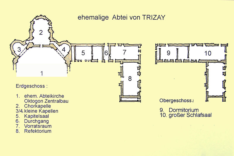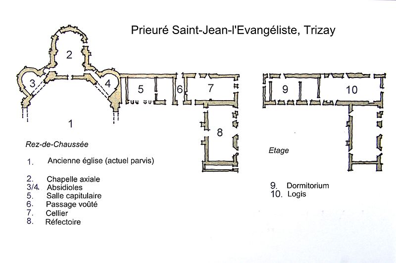 Ne subsistent de l'ancienne abbaye que le chevet polygonal partiel, trois chapelles absidiales rayonnantes et un bâtiment abbatial qui contient une salle capitulaire à deux travées voûtées en ogives ; l'ensemble a été ruiné au cours des guerres de Religion. Il s'agit du prieuré Saint‑Jean‑l'Évangéliste de Trizay, un ancien prieuré bénédictin fondé au XIe siècle sur une légère éminence dominant les marais de la rive droite de l'Arnoult, et dépendant de l'abbaye de la Chaise‑Dieu. Le fondateur, un seigneur de Tonnay‑Charente, en fit ensuite donation à La Chaise‑Dieu, et la maison bénéficia de libéralités successives des seigneurs de Tonnay, qui lui accordèrent forêts, droits sur les marais et privilèges de chasse. Au début du XIIIe siècle la communauté pouvait compter jusqu'à douze moines ; deux siècles plus tard son influence s'étendait jusqu'au pays de Marans et à la paroisse de Saint‑Just. En 1518 le prieuré passa sous le régime de la commende et connut une période de déclin exacerbé par les combats de 1585 et 1586 : tenu tour à tour par les ligueurs puis par les protestants, il fut aménagé en citadelle, l'église fut incendiée et une partie des bâtiments conventuels détruite puis seulement sommairement réparée. Les premiers prieurs commendataires mentionnés sont Charles Goumard, puis Jean et Antoine Goumard ; plus tard, François‑Louis de Polastron fut prieur commendataire en 1698. Au début du XVIIIe siècle la maison n'abritait plus guère qu'un seul moine, qui dut s'installer à Tonnay‑Charente faute de réparations ; un état des lieux de 1760 signale déjà une église à demi‑ruinée. Vendu comme bien national en 1791, le prieuré fut transformé en exploitation agricole ; l'église priorale resta église paroissiale jusqu'en 1843, date de sa fermeture pour vétusté, et fut finalement remplacée par l'église Saint‑François en 1897. Classé monument historique en 1920, l'ensemble a fait l'objet d'une restauration à partir de 1994 et accueille désormais un centre d'art contemporain ; les bâtiments conventuels et les vestiges de l'église sont ouverts à la visite et l'ensemble a obtenu le label des « trésors de Saintonge ». Traditionnellement appelé « abbaye de Trizay », le prieuré ne doit pas être confondu avec les restes d'une abbaye de Trizay situés en Vendée, à Bournezeau.