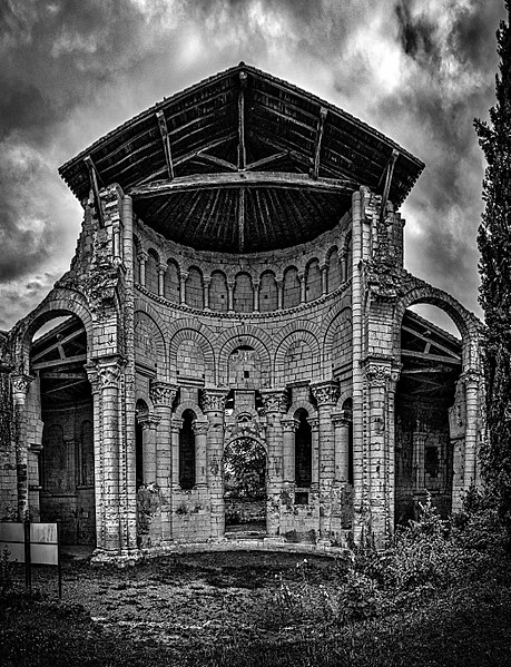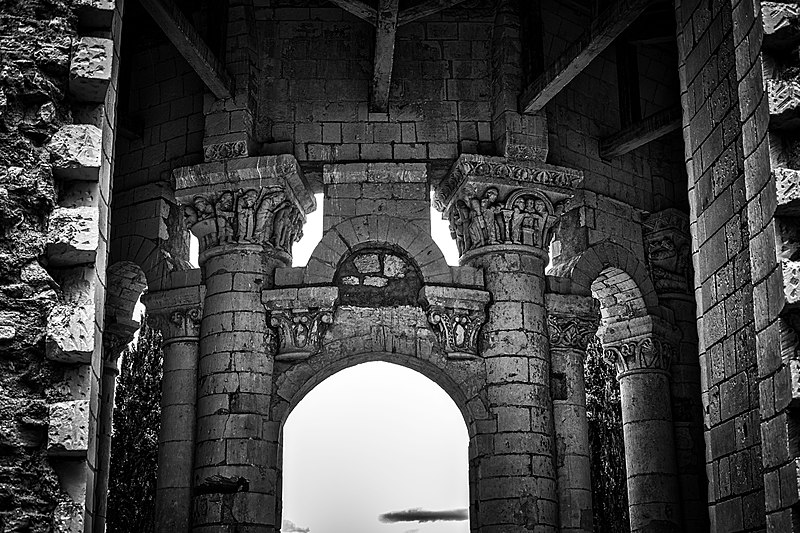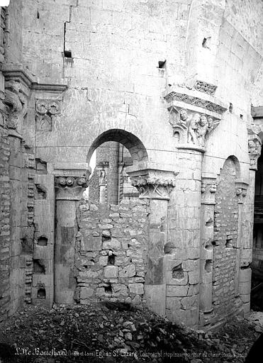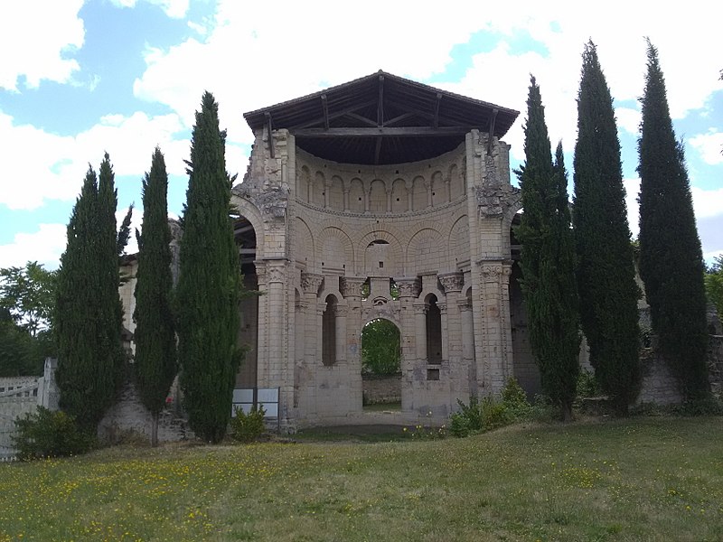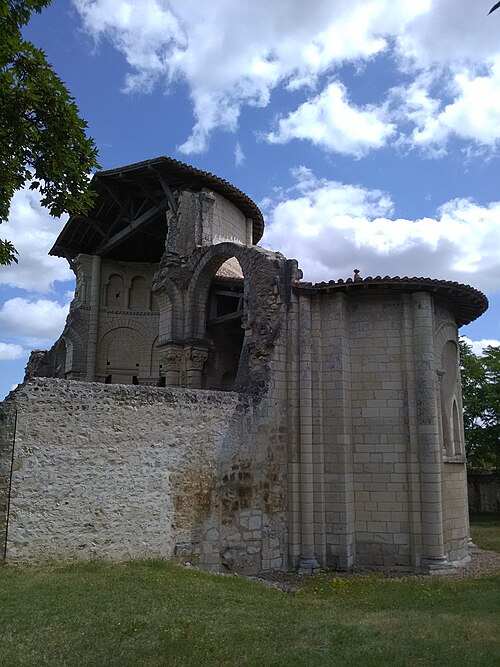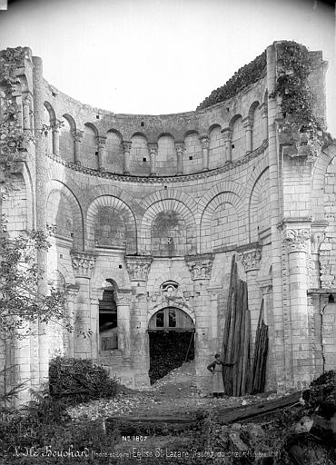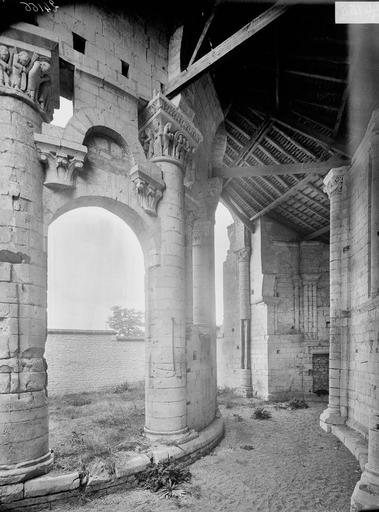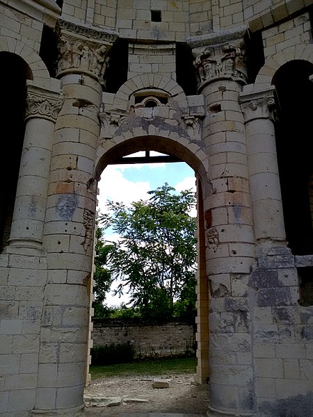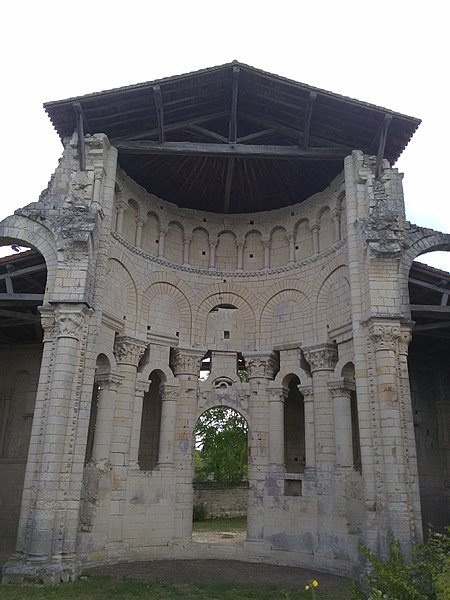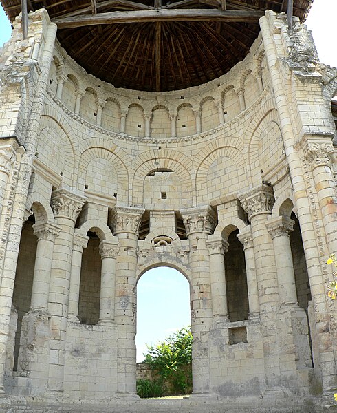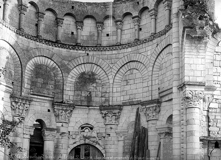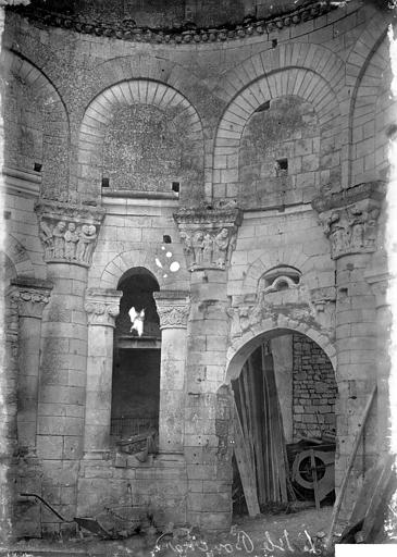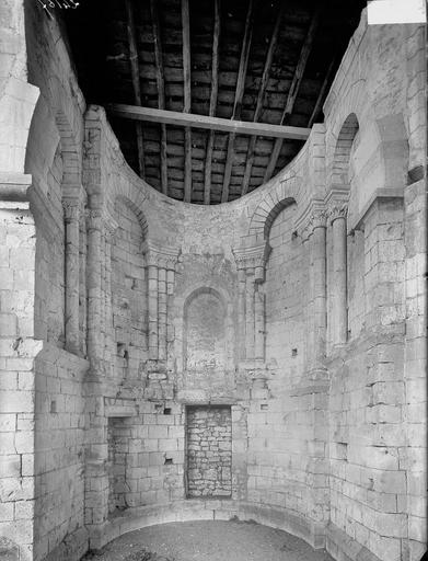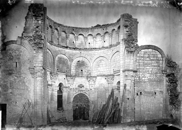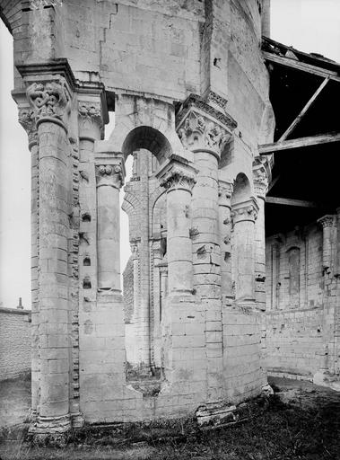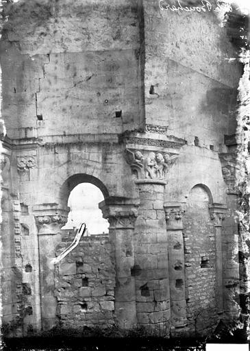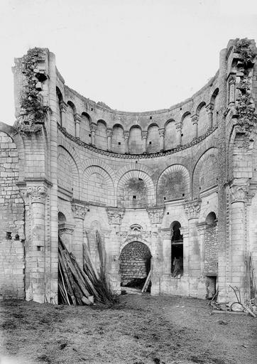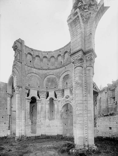 Seuls subsistent aujourd'hui le chœur avec son abside principale, les trois absidioles, le déambulatoire et les départs des voûtes méridionales, tous appareillés en pierre de taille ; la nef et le transept ont disparu et aucun plan d'ensemble n'a été retrouvé. Le chœur et le déambulatoire sont séparés par cinq arcades reposant sur de fortes colonnes à chapiteaux, chaque colonne étant flanquée de deux colonnettes munies de chapiteaux plus sobres ; l'occultation de la partie supérieure des arcs et cet appareillage secondaire correspondent à une phase de remaniement probablement destinée à limiter le poids des voûtes, datée éventuellement de la seconde moitié du XIIe siècle ou du premier quart du XIIIe siècle. Les six chapiteaux principaux, datés des années 1130-1140, sont attribués au sculpteur roman Denis et à son atelier en raison de leur similitude avec d'autres ensembles régionaux. Les quatre chapiteaux centraux (numérotés 2 à 5 du nord au sud) portent le décor le plus riche et représentent, sur leurs différentes faces, des épisodes de la vie de Jésus, de la Vierge et des Évangiles : le chapiteau n°2 traite des premiers épisodes de l'enfance du Christ (Annonciation, Visitation, Nativité, Adoration des mages et Annonce aux bergers), le n°3 présente la Présentation au Temple, le Massacre des Innocents, la Fuite en Égypte et le Baptême, le n°4 montre la Cène et la Crucifixion, et le n°5 la Tentation du Christ et l'Entrée à Jérusalem. Les chapiteaux extrêmes (n°1 et n°6) offrent un décor végétal et des personnages fabuleux ; la disposition des scènes, qui place la Crucifixion au chapiteau le plus central, semble destinée à mettre en valeur cette scène au plus près de l'autel.