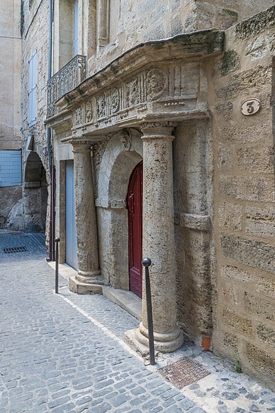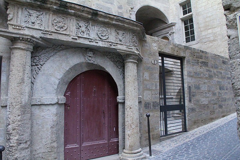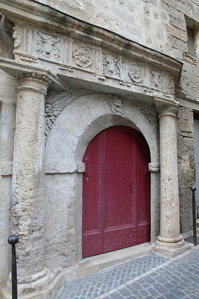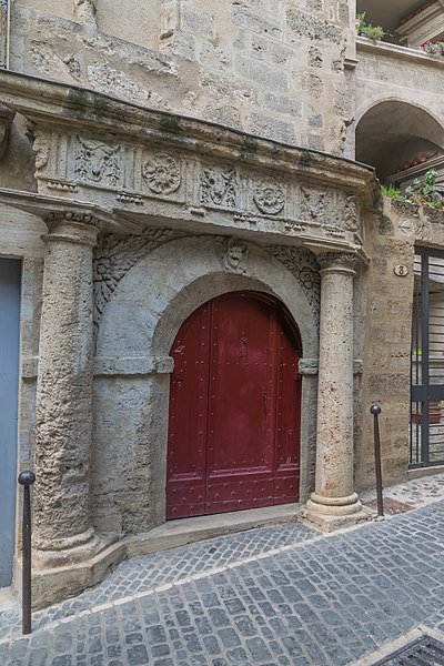 La porte dite de la Juiverie doit son nom à la proximité du ghetto de Pézenas, daté de 1313. Elle présente un entrecolonnement d'inspiration classique avec colonnes ovoïdales, frise à triglyphes et métopes sculptées, et une corniche. La frise, implantée selon un parallélogramme, semble destinée à renforcer l'effet de perspective dans un espace restreint ; l'ancienne entrée, dont l'arc est encore visible, ne paraît toutefois pas avoir été biaisée. L'immeuble, situé à proximité immédiate de l'ancienne porte Faugères conservée lors de l'établissement de l'enceinte fortifiée moderne, appartint à la famille d'Agde de Fondousse du XVIe siècle à la fin du XVIIe siècle. La maison, divisée en trois corps de logis et contiguë à la muraille de la ville, comportait un passage donnant accès à la rue des Litanies. L'aménagement actuel de la demeure, notamment de la partie gauche, est attribué à Antoine d'Agde, seigneur de Fondousse, propriétaire au début du XVIIe siècle. Appelée en 1744 le Palais de la Justice, l'immeuble est également connu sous le nom de Prison consulaire.