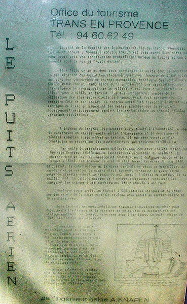 Construit en 1931 par l'ingénieur belge Achille Knapen, ce puits aérien était destiné à recueillir l'humidité atmosphérique par condensation. Ressemblant à une ruche, il se présente comme une masse en béton faite de grenailles de porphyre et de mortier de ciment, revêtue d'un enduit maigre où sont fichées des ardoises obliques, et entourée d'une enveloppe maçonnée de 2,50 m d'épaisseur. Un vide central d'un mètre de diamètre constitue le puits proprement dit et reçoit les eaux de condensation. Conçu comme structure expérimentale pour un usage dans les régions désertiques, il n'a peut-être jamais fonctionné.