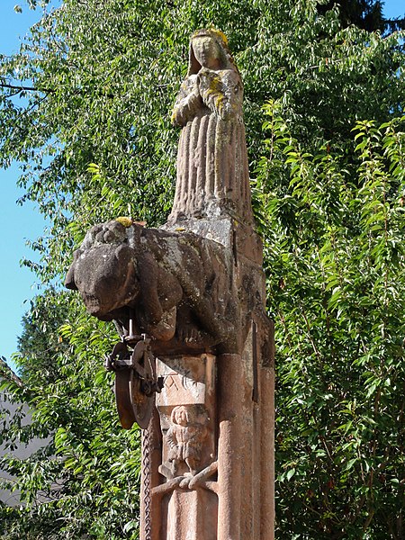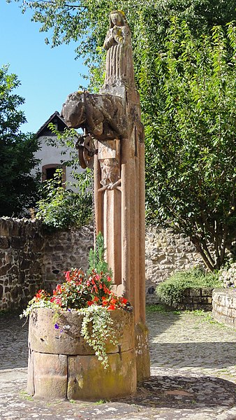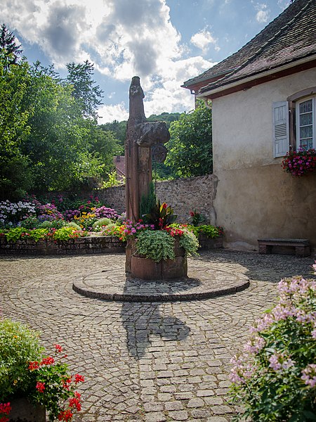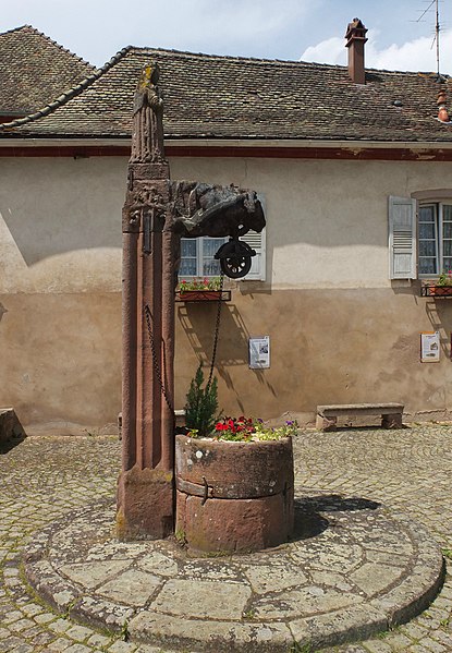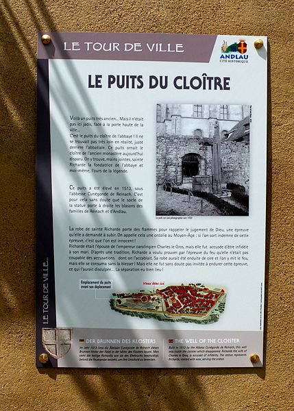 Le puits Sainte-Richarde, classé monument historique depuis 1930, est situé rue Deharbe à Andlau (Bas-Rhin). Il provient de l'ancien cloître de l'abbaye fondée vers 880 par Richarde, épouse de l'empereur Charles III le Gros. L'abbaye, composée de chanoinesses séculières et dirigée par une abbesse princesse d'Empire, subsista jusqu'à la Révolution ; son église, dédiée aux saints Pierre et Paul, devint paroissiale à cette époque. L'édifice primitif du IXe siècle fut remanié à plusieurs reprises : le pape Léon IX reconstruisit l'église dont subsistent les soubassements du chœur, la crypte, le mur ouest de la nef et des vestiges dans le transept. Le massif occidental fut relevé au milieu du XIIe siècle, la croisée du transept et le chœur actuels furent rebâtis vers 1170, et le bras nord fut largement reconstruit vers 1445 avec des tourelles d'escalier desservant les tribunes. Entre 1698 et 1703, la nef, les sacristies et les parties hautes du transept et du chœur furent reconstruites (une clé de voûte de la nef porte la date 1700) ; le massif occidental fut restauré et pourvu en 1704 d'un clocher complété en 1732 par un niveau octogonal surmonté d'un toit à l'impériale et d'un lanternon. Les bâtiments conventuels ont ensuite été l'objet de reconstructions et d'aménagements successifs : le logis abbatial fut reconstruit en 1759, la maison du portier en 1727, la maison du syndic porte la date 1608, et d'autres corps de bâtiments datent des XVIe au XVIIIe siècles, avec des vestiges d'ouvrages antérieurs. Certaines maisons conservent des éléments romans, comme des arcatures de l'ancienne salle capitulaire, et d'anciennes inscriptions indiquent des phases de construction en 1573 et 1583. Après la vente et la division des bâtiments à la Révolution, le logis abbatial accueille aujourd'hui la maison de retraite Stoltz Grimm. Le puits, daté de 1513, a été déplacé et se trouve désormais rue Deharbe.