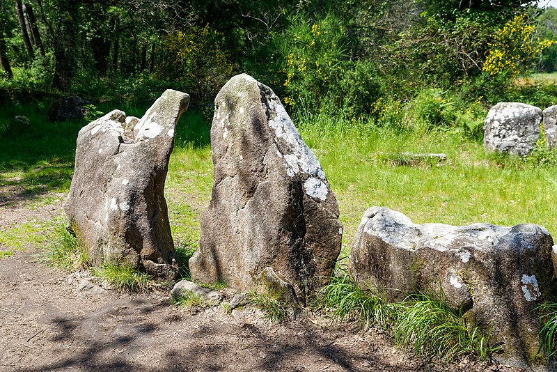 À environ 1 m au sud‑ouest de la base, les fouilleurs ont découvert un coffre funéraire délimité par des murets et recouvert d’une grande dalle de plus de 3 m, dont la face externe porte la gravure d’une hache emmanchée longue de 0,60 m. Un second coffre, situé à quelques mètres à l’ouest, présente une architecture différente : il est formé de dalles jointives fichées en terre et devait être recouvert à l’origine par une dalle brisée retrouvée à proximité, mesurant 1,30 m sur 1,10 m. Plusieurs petites cavités, larges et profondes de 0,20 à 0,30 m, ont été mises au jour dans la masse du tumulus ; trop réduites pour servir d’espaces funéraires et disposées en deux files parallèles dans la partie ouest, elles pourraient correspondre à des structures de calage, de type « trous de poteaux », pour un édifice en bois ancien. La partie nord du tumulus comportait en outre une série de foyers.