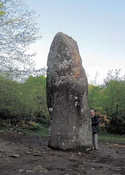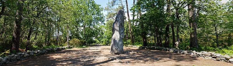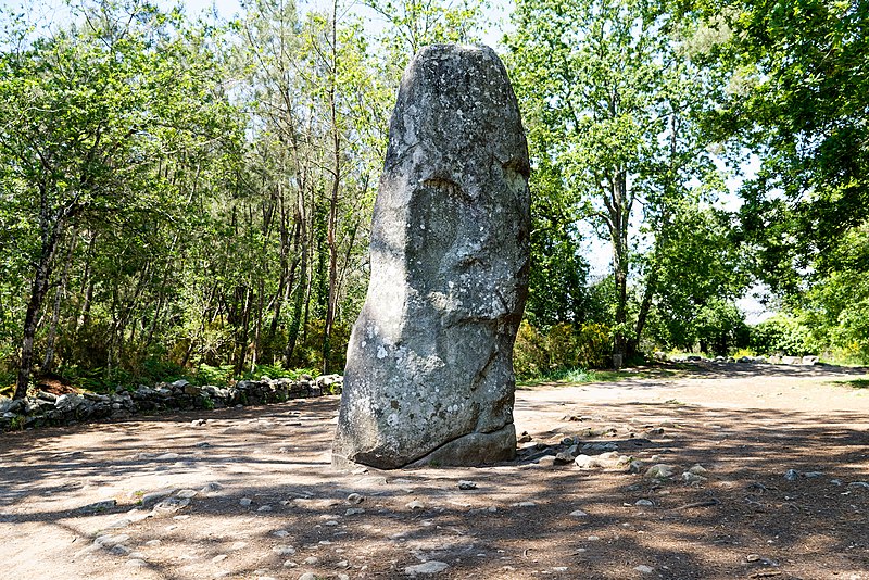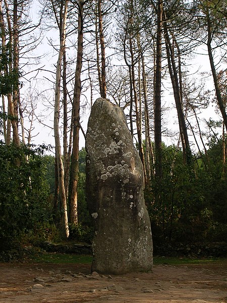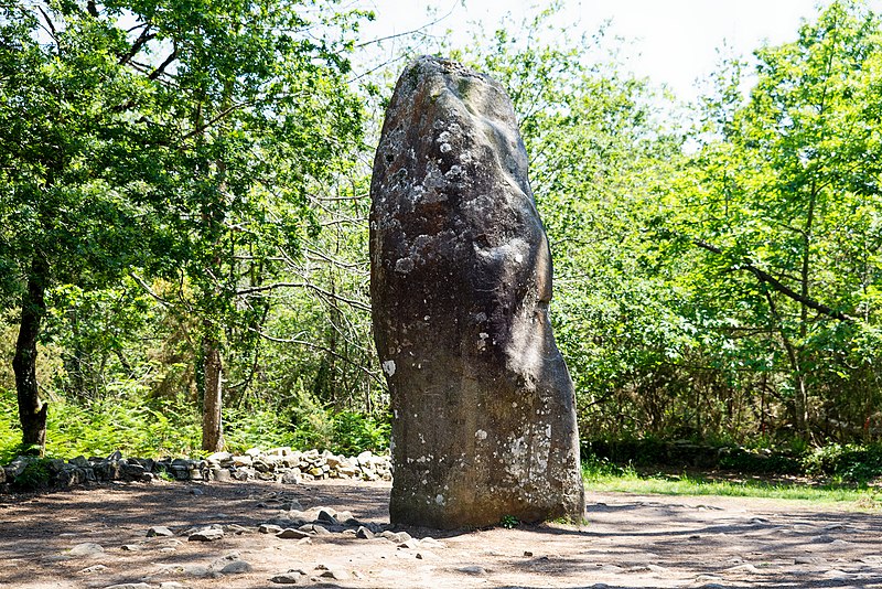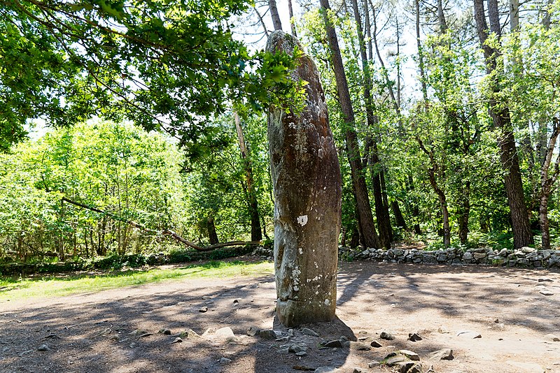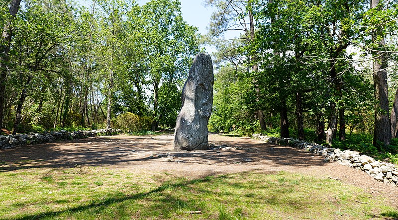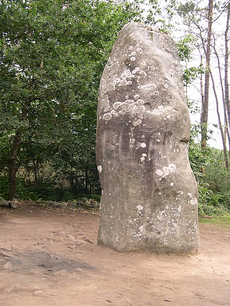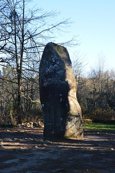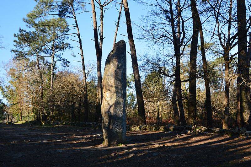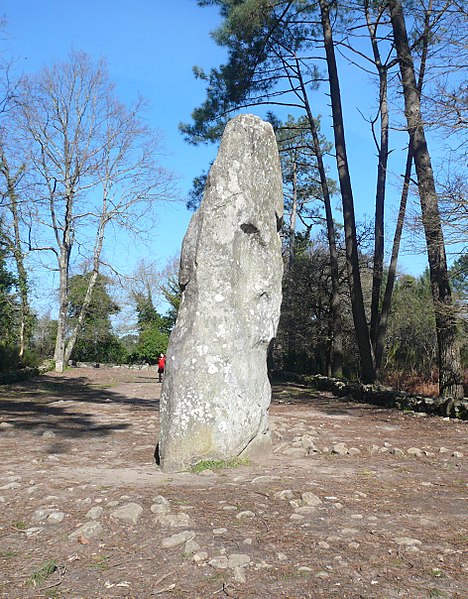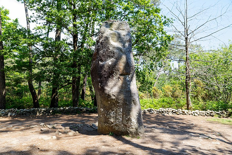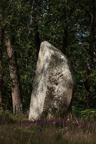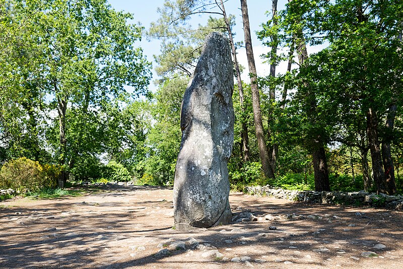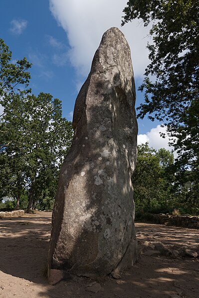 Le tumulus présente une forme trapézoïdale de 35 m de long, avec 11 m de largeur côté occidental et 16 m côté oriental. Son intérieur est composé d’une succession de massifs circulaires accolés, chacun délimité par des dalles et blocs de granite juxtaposés et implantés dans une couche d’argile rapportée formant assise. Dans sa partie la plus élevée, au nord-est, se dresse un menhir de plus de 4 m de hauteur, dont 3,50 m hors sol ; sa base repose dans une fosse de fondation creusée dans l’arène granitique et est calée par un anneau de pierres disposé sur 3 m de rayon et 0,80 m de hauteur. Sur une face de la base du menhir figurent cinq traits serpentiformes en grande partie masqués par le tumulus.