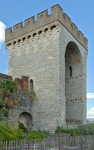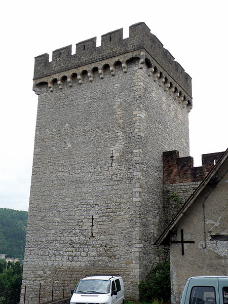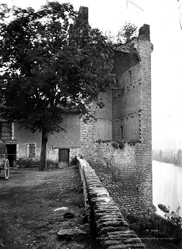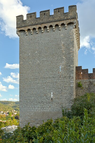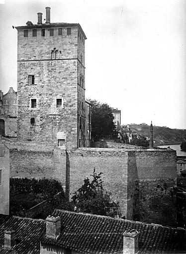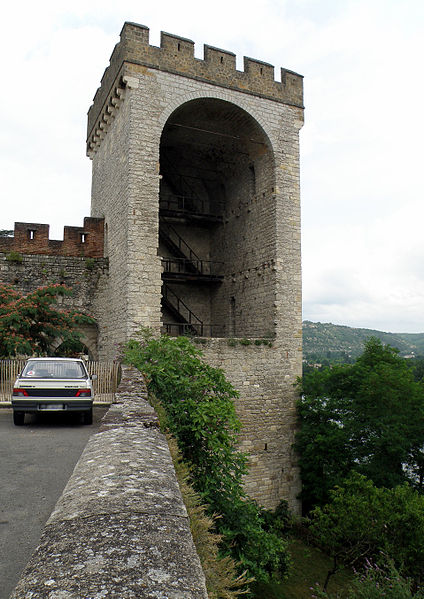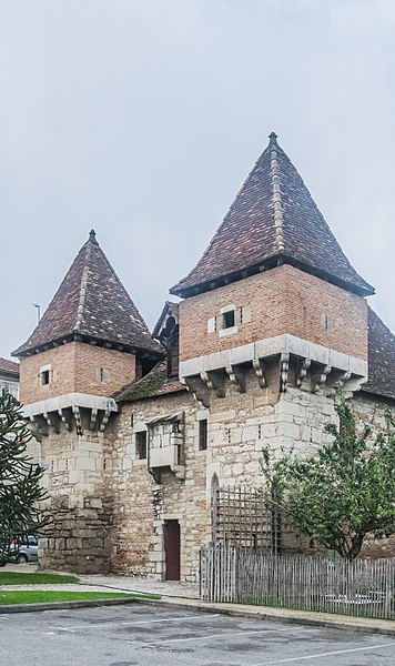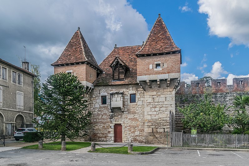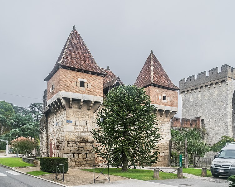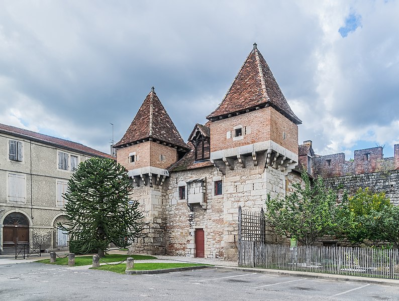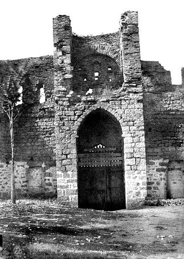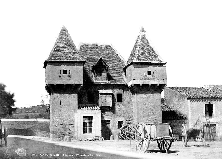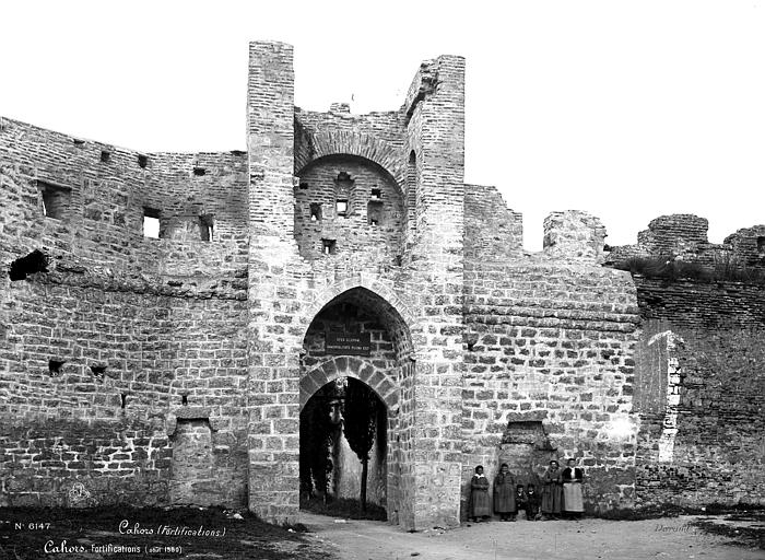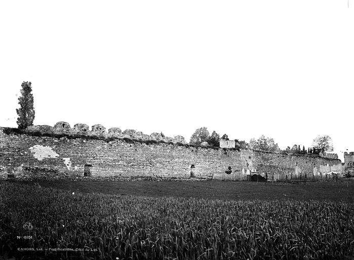 La ville, installée dans une boucle du Lot, voit sa défense renforcée par des remparts construits vers le XIVe siècle, qui relient une rive à l'autre et complètent la protection naturelle du site. Parmi les ouvrages défensifs, le Pont Valentré est le seul des deux ponts fortifiés qui subsiste encore. Le rempart comprend une tour dite des Pendus et, à proximité, un bâtiment du XVe siècle qui servait de corps de garde et est pourvu d’échauguettes aux angles. Un projet visant à édifier une seconde enceinte protégeant toute la presqu’île remonte peut-être à la fin du XIIIe siècle ; cependant, au début du XIVe siècle, seules deux ou trois des tours principales de la ligne de fortification nord semblent alors réalisées. D’importants travaux sont effectués vers 1345, notamment la construction de la partie orientale de la courtine. Dans la partie occidentale, la palissade de pieux n’est remplacée par une courtine maçonnée qu’en 1405, puis celle-ci, jugée trop faible, est reconstruite en 1491. Le corps de garde de la porte principale, aujourd’hui appelé « la Barbacane », est reconstruit au XVe siècle.