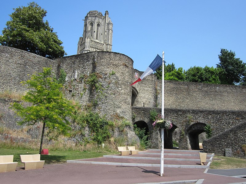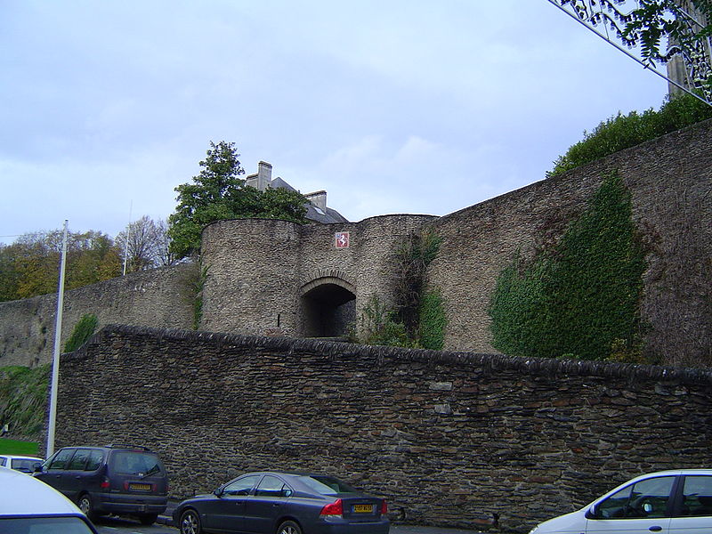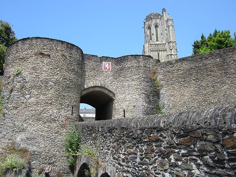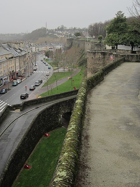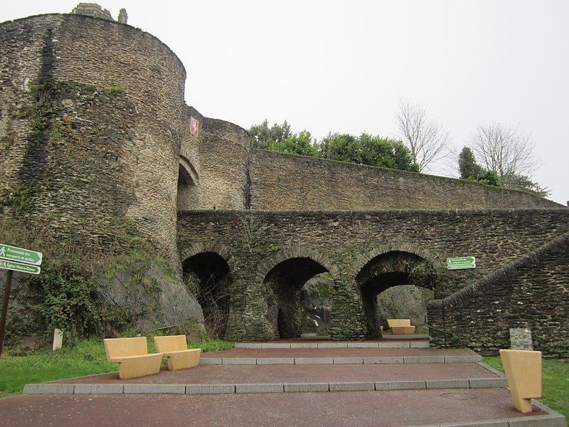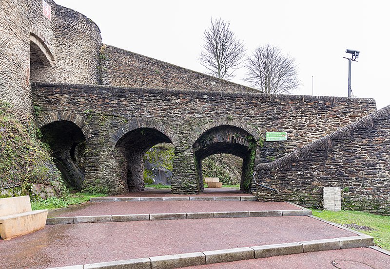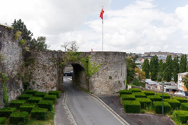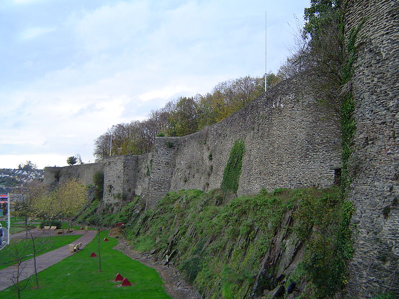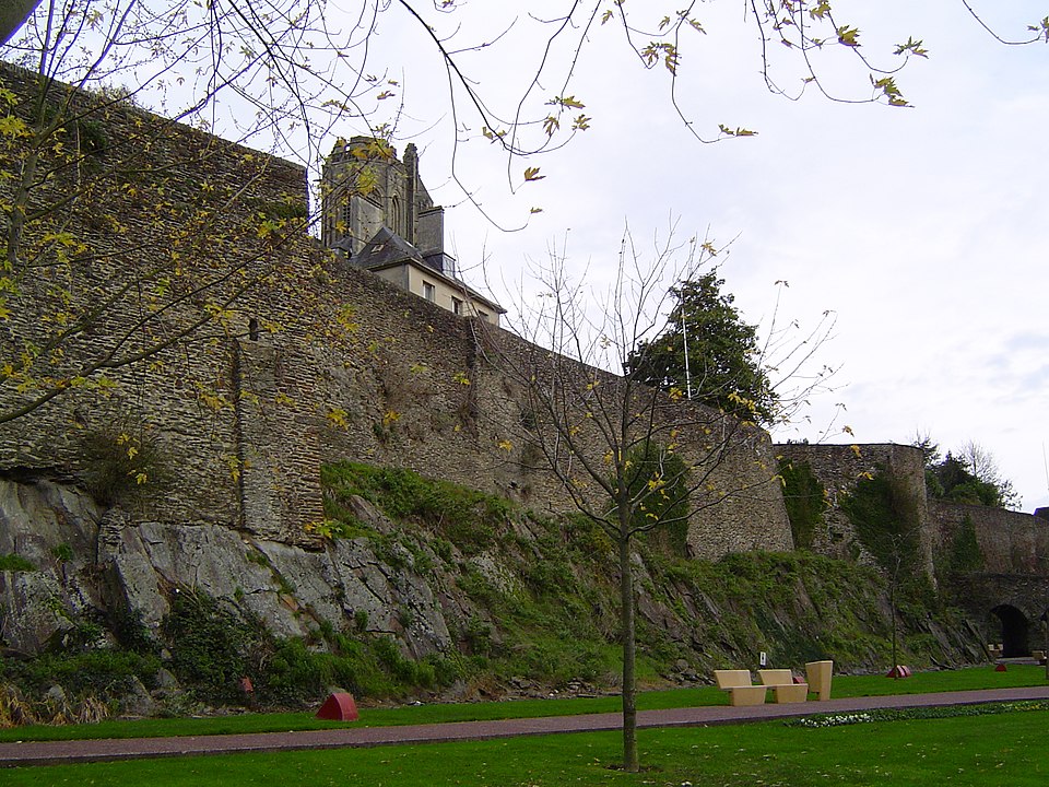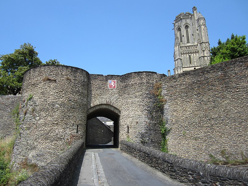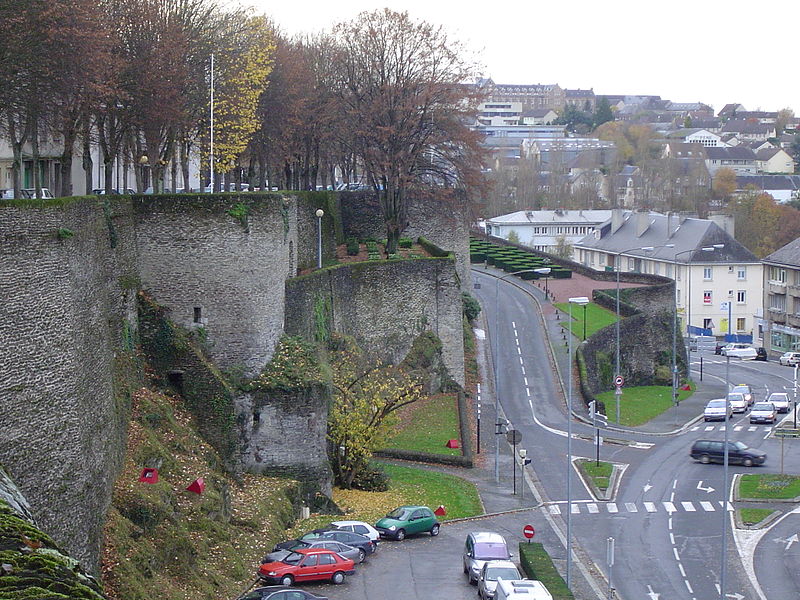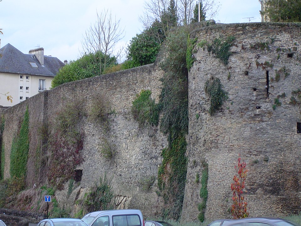 L'enceinte se présente comme une longue muraille quadrangulaire, assez bien conservée mais arasée au niveau du plateau, sauf sur son flanc est où elle a disparu ; elle enserre un espace de trois à quatre hectares. Les destructions de 1944 ont dégagé l'enceinte des constructions accolées, permettant de rétablir son tracé sur trois côtés. Les murs, en petit appareil de schiste, étaient flanqués d'une quinzaine de tours dont il subsiste douze exemplaires : parmi elles figurent la tour de la Rose, au nord près de la porte Dollée, les tours de Torteron, de la Teste-Dieu, du Belle et Nicques, arasées à la hauteur du rempart, ainsi que la tour des Beaux-Regards, au sud-ouest, et la tour de la Poudrière, au nord-est, conservée en élévation et donnant ainsi la hauteur originelle de l'enceinte. La muraille comportait trois portes, chacune flanquée de deux grosses tours avec pont-levis et avant-portes : à l'est la porte du Neuf-Bourg, détruite en 1821 avec le front oriental ; au nord la porte Dollée, qui a perdu son dernier étage ; et au sud la porte au Lait, située rue Torteron.