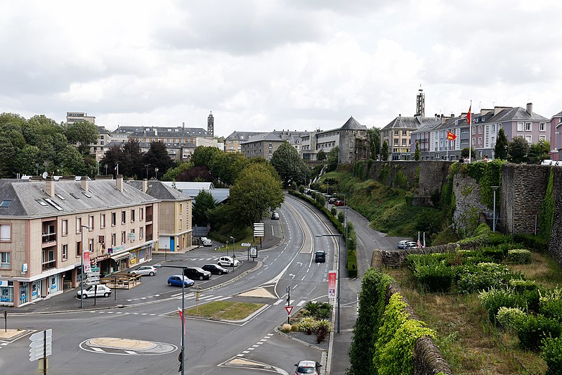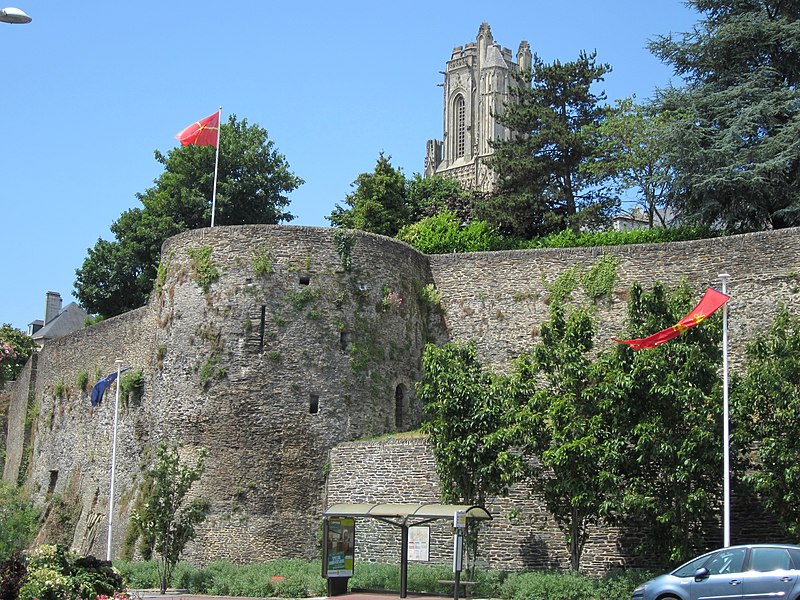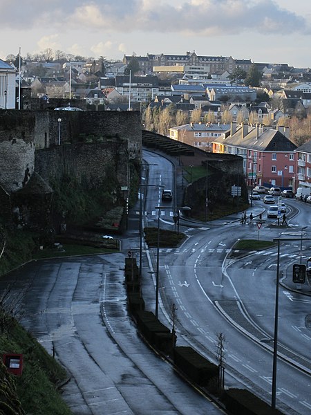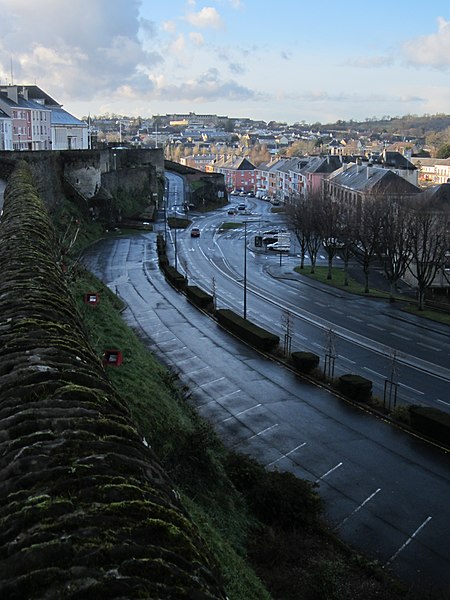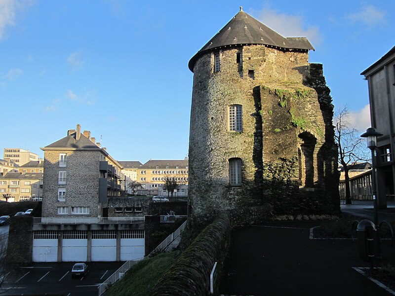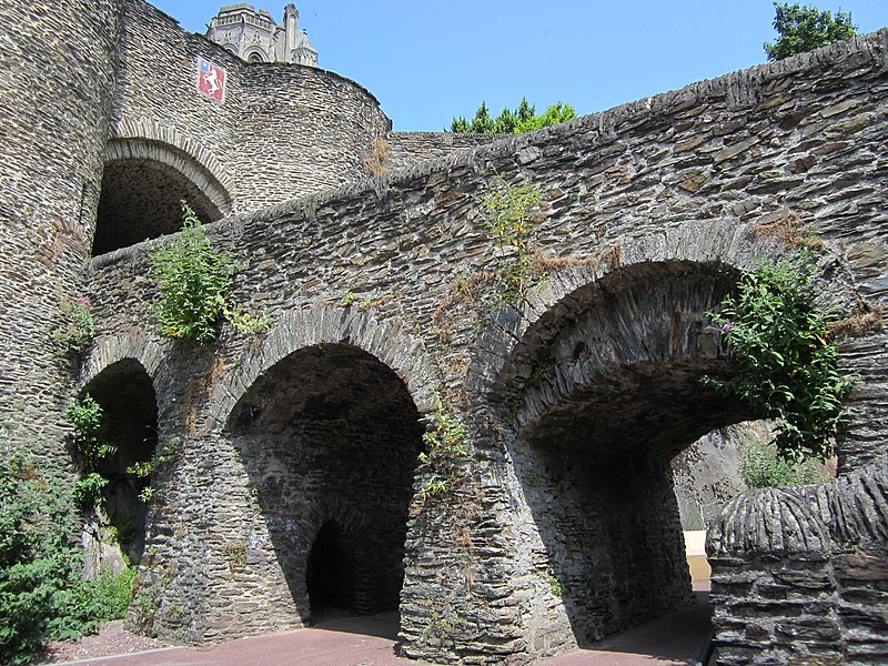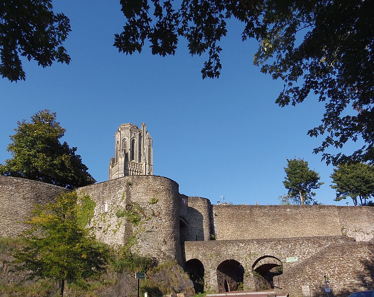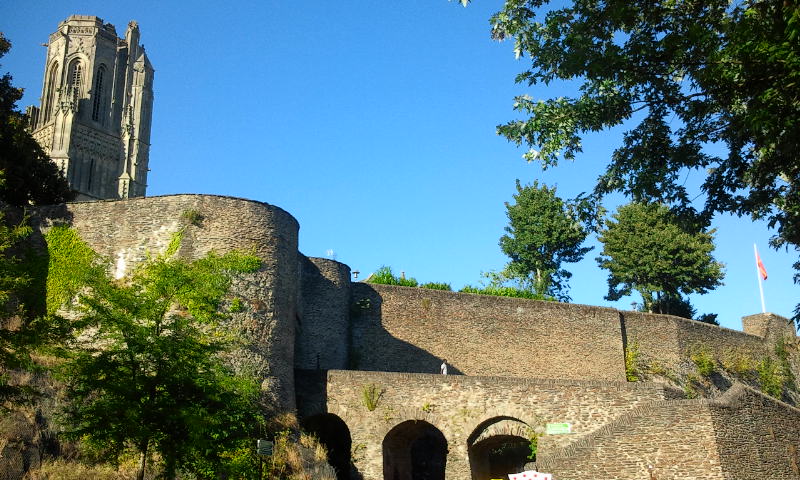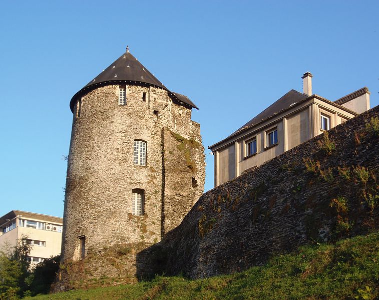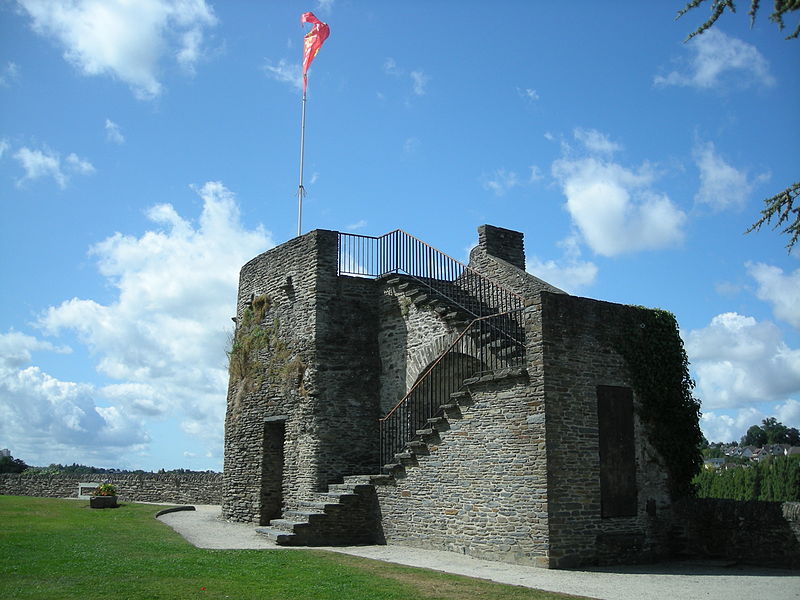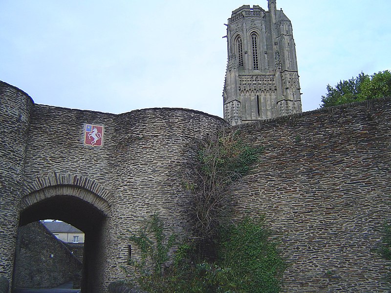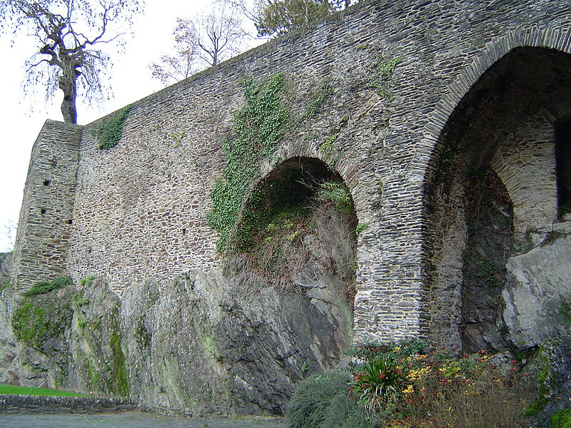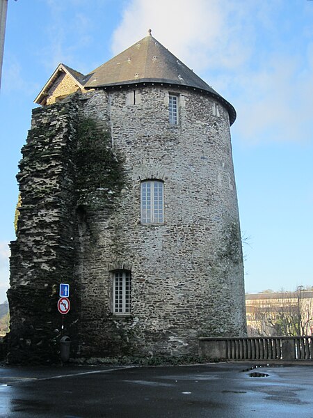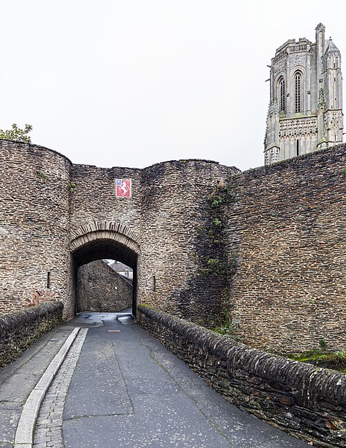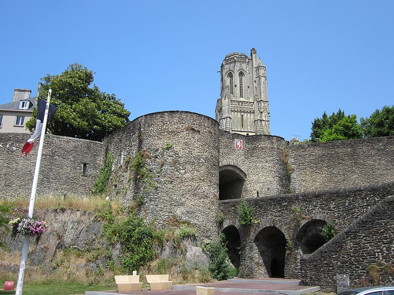 L'enceinte se présente comme une longue muraille quadrangulaire, assez bien conservée mais arasée au niveau du plateau, sauf sur son flanc est où elle a disparu ; elle enserre un espace de trois à quatre hectares. Les destructions de 1944 ont dégagé l'enceinte des constructions accolées, permettant de rétablir son tracé sur trois côtés. Les murs, en petit appareil de schiste, étaient flanqués d'une quinzaine de tours dont il subsiste douze exemplaires : parmi elles figurent la tour de la Rose, au nord près de la porte Dollée, les tours de Torteron, de la Teste-Dieu, du Belle et Nicques, arasées à la hauteur du rempart, ainsi que la tour des Beaux-Regards, au sud-ouest, et la tour de la Poudrière, au nord-est, conservée en élévation et donnant ainsi la hauteur originelle de l'enceinte. La muraille comportait trois portes, chacune flanquée de deux grosses tours avec pont-levis et avant-portes : à l'est la porte du Neuf-Bourg, détruite en 1821 avec le front oriental ; au nord la porte Dollée, qui a perdu son dernier étage ; et au sud la porte au Lait, située rue Torteron.