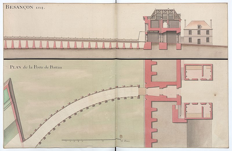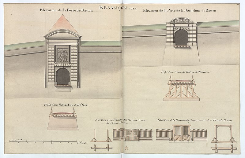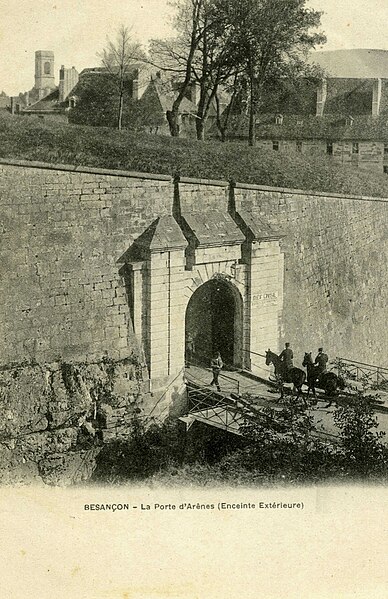 Remparts de Vauban (anciens) tels qu'ils sont délimités sur le plan annexé à arrêté : classement par arrêté du 28 octobre 1942 ; Les parties suivantes de l’enceinte urbaine : les vestiges enfouis de la contrescarpe de la tour bastionnée de Rivotte situés sur la parcelle 58 (section DK), les vestiges du rempart, même ceux enfouis, entre la tour bastionnée de la Rivotte et la tour bastionnée de Brégille, situés sur la parcelle n°11 (section AK), la partie du rempart entre le bastion du moulin Saint-Paul et les vestiges de la tour bastionnée Saint-Pierre, située 22 avenur Arthur-Gaulard, sur les parcelles n°16 et 67 (section AH), les vestiges de la tour bastionnée Saint-Pierre située rue Elisée Cusenier, sur la parcelle n°29 (section AE), les vestiges enfouis de la lunette de Bregille, situé sur la parcelle n°109 (section CX), le corps de garde est de Chamars du XVIIIe siècle, situé 2 avenue de la Gare d’Eau, sur la parcelle n°36 (section AR), l’ensemble des vestiges enfouis de la seconde ligne de remparts situés sous l’hôpital Saint-Jacques, sur la parcelle n°5 (section AV), 2 avenue de la Gare d’eau, parking du Département Doubs, 4 et 6 avenue de la Gare d’eau, sur les parcelles n°35, 44, 48 et 73 (section AR), le corps de garde nors de la porte d’Arènes, situé sur la parcelle n°164 (section AX), tels que délimités en rouge sur le plan annexé à l’arrêté : inscription par arrêté du 10 septembre 2019 ; Les parties suivantes de l ‘enceinte urbaine, tel que légendé sur le plan annexé à l’arrêté : Sur la rive gauche du Doubs : Le chemin de ronde s’étendant de la porte de Rivotte à la rue des Fusillés de la Résistance, situé faubourg Rivotte, sur la parcelle n° 42a et n° 42b, figurant au cadastre, section DK ; les vestiges enfouis de la contrescarpe de la tour bastionnée de Rivotte et le sol, situés faubourg Rivotte, dans les tréfonds de la parcelle n° 75, figurant au cadastre section AK, de la parcelle n° 107, figurant au cadastre section AK, de la parcelle n° 109, figurant au cadastre section DK, et de la parcelle n° 110, figurant au cadastre section DK, et sous l’avenue Arthur-Gaulard, sur le domaine public non cadastré, figurant au cadastre section DK ; les vestiges du rempart, même ceux enfouis, entre la tour bastionnée de Rivotte et la tour bastionnée de Bregille, ainsi que le sol situé à l’ouest des vestiges de ce rempart, situés 12 avenue Arthur-Gaulard, sur la parcelle n° 137 et dans les tréfonds de ladite parcelle, figurant au cadastre section AK, et dans le domaine public non cadastré sous l’avenue Arthur-Gaulard, figurant au cadastre section AK ; La partie du rempart située avenue Arthur-Gaulard, sur la parcelle n° 89, figurant au cadastre section AH, ainsi que ladite parcelle ; le chemin de halage situé sur le domaine public non cadastré, figurant au cadastre section AH, en contrebas des parcelles n° 16, n° 67, et n° 89 de cette section du cadastre, et sur le domaine public non cadastré situé entre le débouché de la rue de la République et le pont du même nom, figurant au cadastre à la limite entre les sections AH et AE ; les vestiges de la tour bastionnée Saint-Pierre, situés avenue Élisée-Cusenier, sur la parcelle n° 29, figurant au cadastre section AE ; Les remparts dérasés et les vestiges enfouis des anciens remparts, s’étendant depuis les vestiges de la tour bastionnée Saint-Pierre jusqu’au bastion du Saint-Esprit, partiellement situés sur la parcelle n° 29, figurant au cadastre section AE ; partiellement enfouis sous le débouché du pont Denfert-Rochereau, domaine public non cadastré, partiellement situés sur la parcelle n° 137, figurant au cadastre section AE, ainsi que le chemin de halage situé sur le domaine public non cadastré, en contrebas des parcelles n° 29 et n° 137 de la section AE du cadastre ; le bastion du Saint-Esprit, la casemate du flanc de Poitune, la casemate du flanc des Cordeliers, le rempart situé entre le bastion du Saint-Esprit et la casemate du flanc des Cordeliers et ses vestiges enfouis, ainsi que le chemin de halage, situé en contrebas de ce rempart, de ce bastion et de ces casemates, le tout situé quai Vauban sur le domaine public non cadastré, figurant au cadastre sections AD et AW ; les vestiges de casemate, situés rue Girod-de-Chantrans, figurant sur la parcelle n° 1 au cadastre section AV ; les vestiges enfouis de la seconde ligne de remparts et le sol de son ancien talus, situés sur le domaine public non cadastré, partiellement sur le chemin de halage, partiellement sous la parcelle n° 1 figurant au cadastre section AV, et partiellement sur le domaine public non cadastré, sous la rue Girod-de-Chantrans, entre les parcelles n° 1 et n° 5, le tout figurant au cadastre section AV ; les vestiges enfouis de la seconde ligne des remparts, le sol de leur ancien talus et les vestiges du pont de Chamars, situés partiellement sous l’avenue du 8-mai-1945, entre la parcelle n° 8 de la section Av et la parcelle n° 27 figurant au cadastre section AT, dans le domaine public non cadastré, partiellement sous la parcelle n° 27, figurant au cadastre section AT, et partiellement sous la voie Geneviève-de-Gaulle-Anthonioz, entre la parcelle n° 27, figurant au cadastre section AT, et la parcelle n° 5a de la section AT ; le corps de garde ouest de Chamars, situé sur la parcelle n° 27 figurant au cadastre section AT ; les vestiges enfouis de la porte Notre-Dame situés au débouché de la rue Charles-Nodier sur le faubourg Tarragnoz, figurant sur le domaine public non cadastré, sections AP et DM du cadastre ; le rempart, le fossé et la contrescarpe entre la rue Charles-Nodier et la tour Notre-Dame, portant la montée vers la rue du Chapitre, situés partiellement sur le domaine public non cadastré, section AP du cadastre et partiellement sur la parcelle n° 19, figurant au cadastre section DM ; Sur la rive