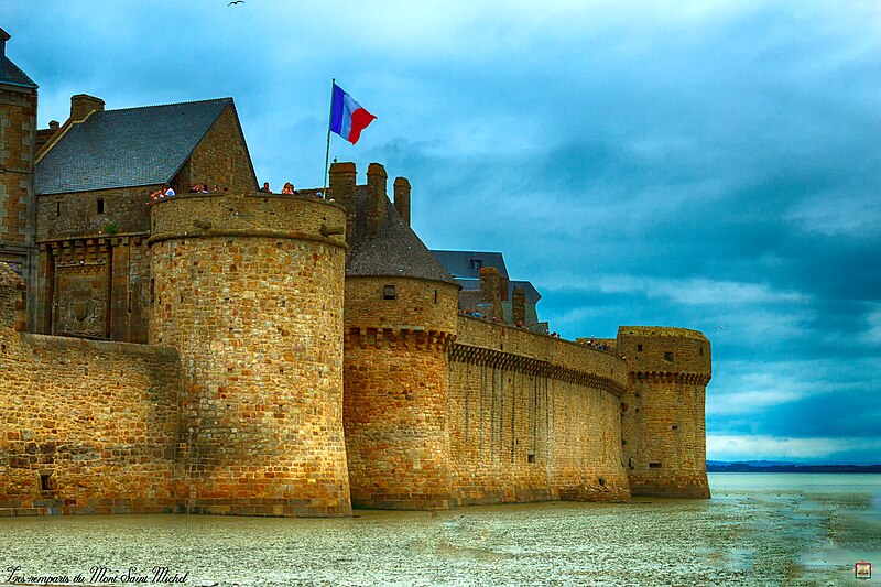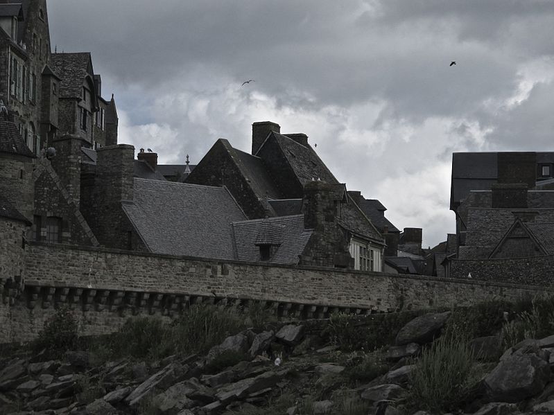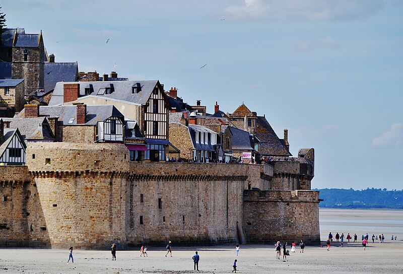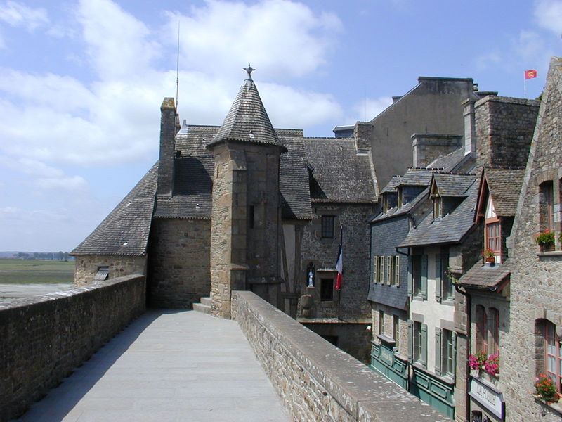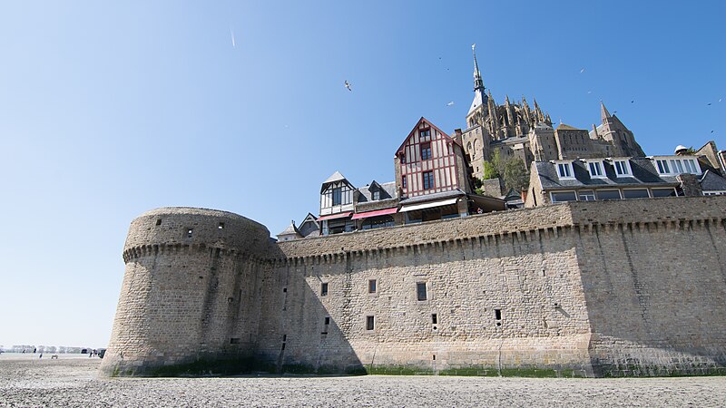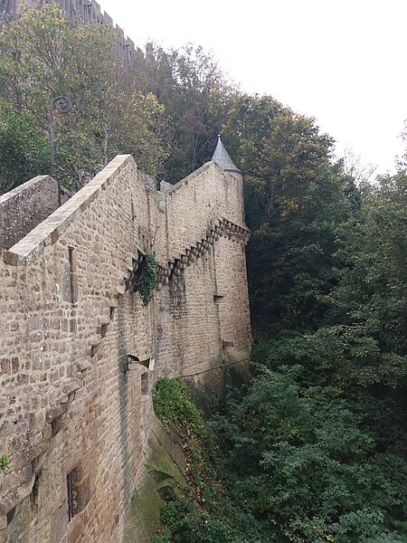L’enceinte urbaine date des XIIIe–XVIe siècles et avait pour fonction de protéger le Mont et son abbaye, notamment pendant la guerre de Cent Ans. À l’origine et jusqu’au début du XIIIe siècle, une palissade en bois protégeait le Mont, l’abbaye seule disposant d’une fortification en pierre. Après la reconquête du duché de Normandie et le ravage de l’îlot par l’armée bretonne de Guy de Thouars alliée au roi capétien, l’abbé et les moines décidèrent de ceinturer le Mont. Sous Saint Louis, vers 1257, une porte fut dressée à l’orient pour barrer l’accès par les grands escaliers, constituant la première défense avancée. En 1311 l’abbé Guillaume du Château fit édifier la première enceinte reliant la tour Nord au chevet de l’église Saint-Pierre, et en 1314 la porterie accueillit la première garnison.