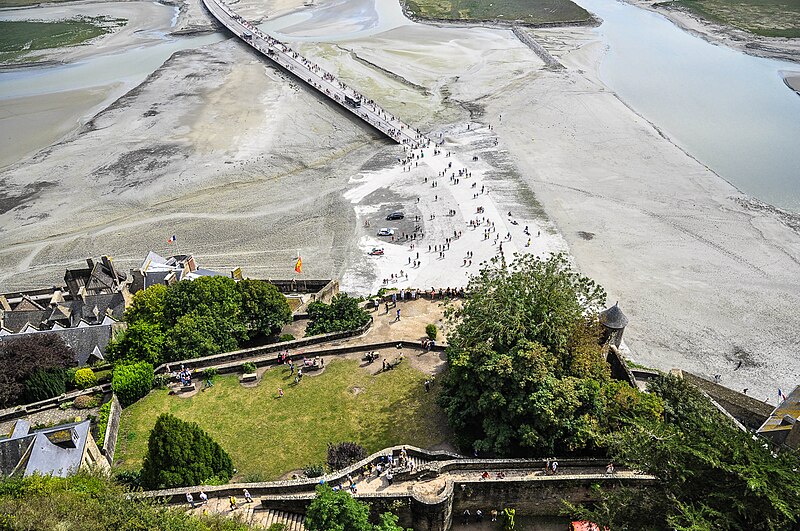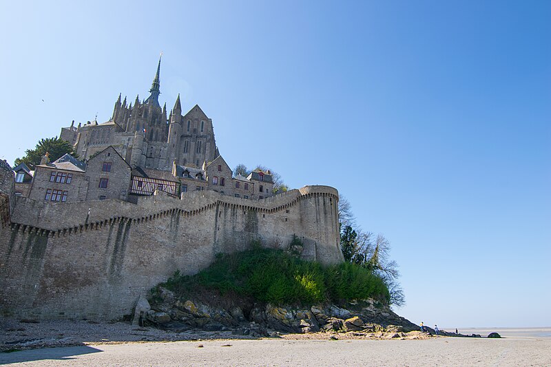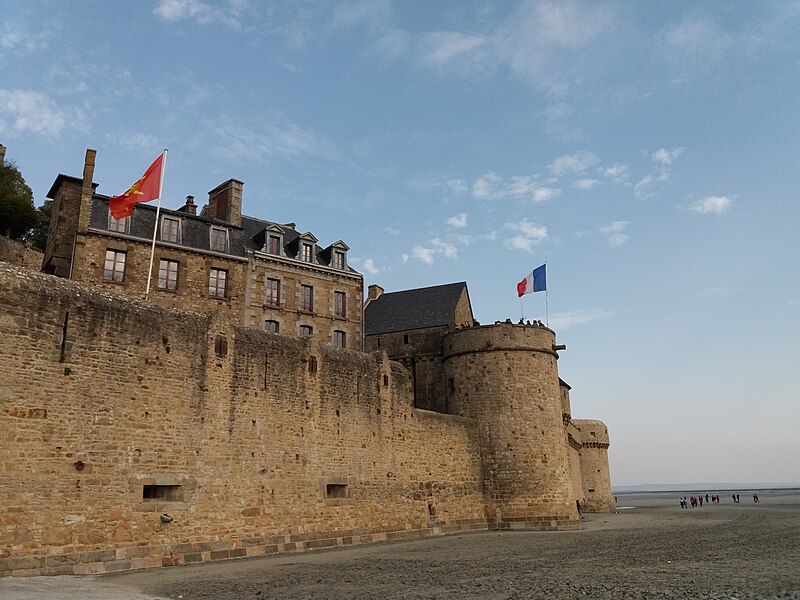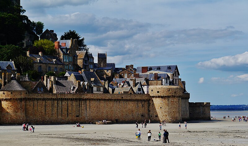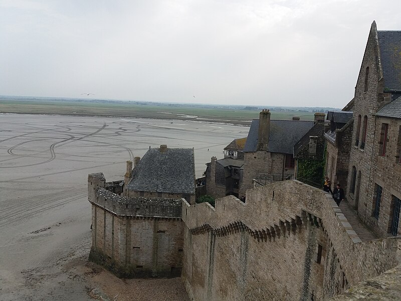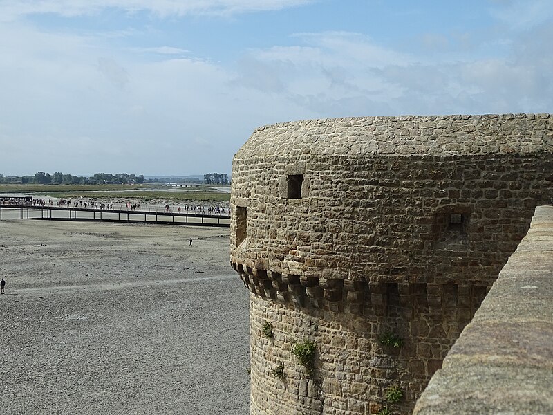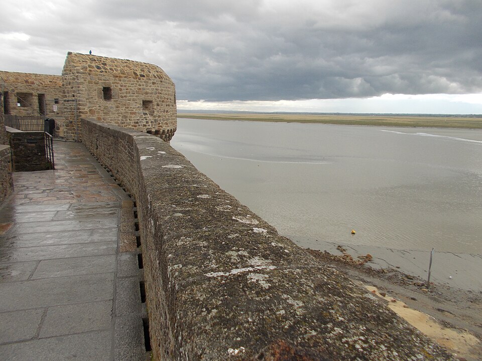 L’enceinte dite « basse » est flanquée de tours de plan rond ou en fer à cheval et renforcée de bastions en éperon ; elle protégeait le bourg médiéval habité par des pêcheurs, des commerçants liés aux pèlerinages, ainsi que des serviteurs et fournisseurs des moines. La muraille, dont les éléments les plus anciens visibles datent du XIIIe siècle, se compose de courtines flanquées de tours semi-circulaires et d’une tour bastionnée ; parmi les tours figurent la tour du Roy, près de la porte d’entrée, la tour de l’Arcade, la tour de la Liberté, la tour Basse, la tour Cholet, la tour Boucle (bastionnée, XVe siècle) et la tour Nord (après 1254). Le chemin de ronde et les parapets sont du XVe siècle et divers ouvrages défensifs complètent l’ensemble, comme la porte de l’Avancée (1530), la porte du Lion, la poterne du Trou du Chat, la porte du Roy (vers 1430), la barbacane de la porte du Roy (1430) et le corps de garde des Bourgeois (XVIe siècle).