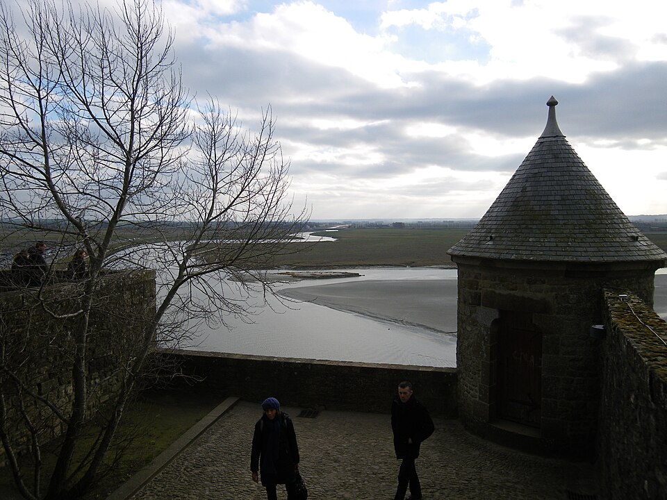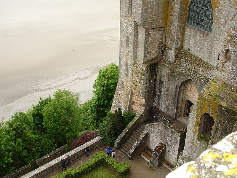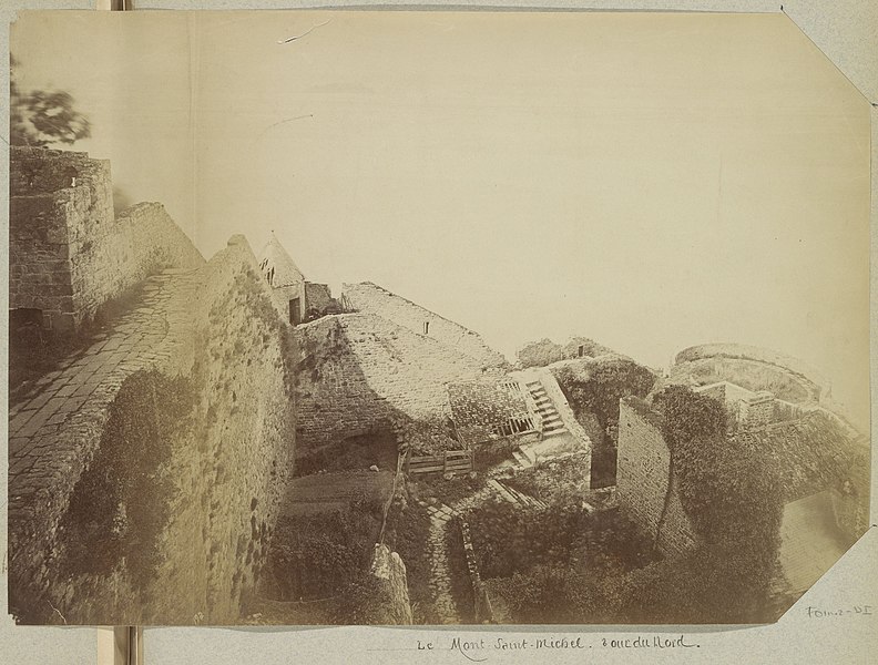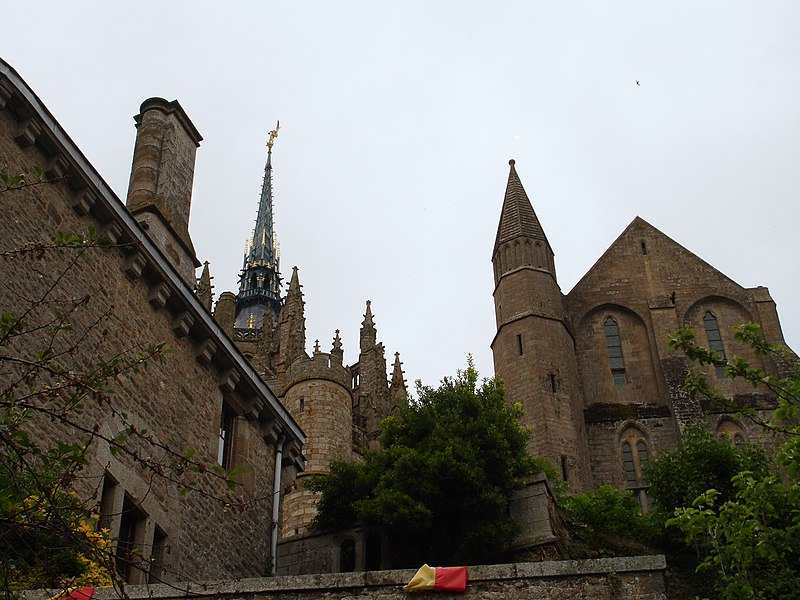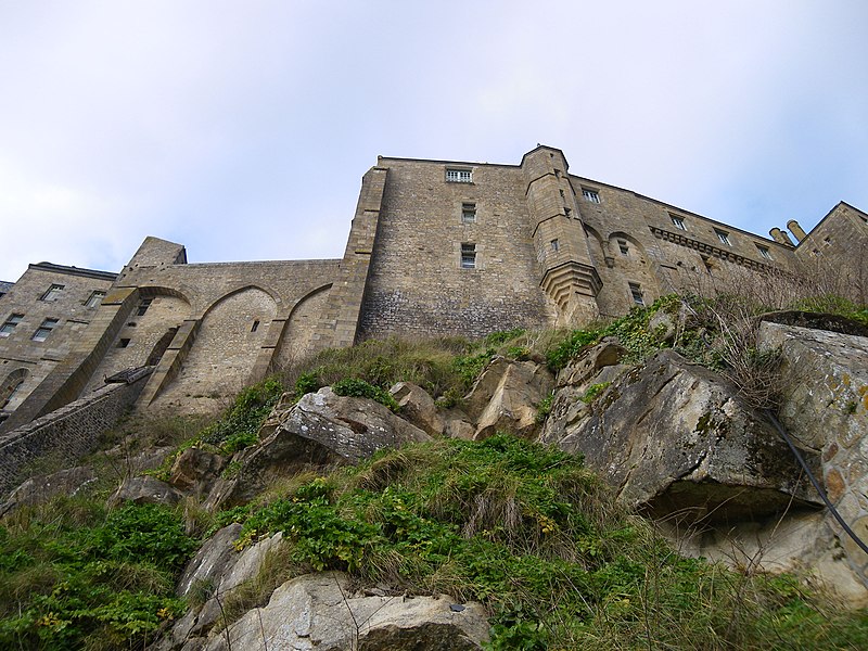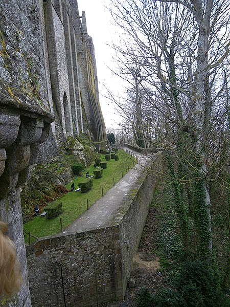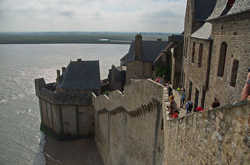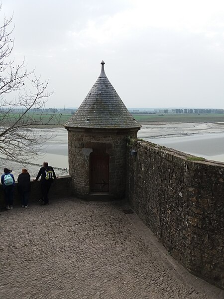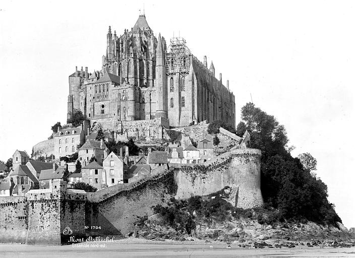 La tour Nord, bâtie en 1311 par Guillaume du Château, ouvre les Grands Degrés qui donnent accès à l’abbaye, ces degrés remplaçant, entre 1386 et 1410, l’extrémité sommitale de la rue du village et étant protégés par des bouches à feu. La tour Claudine, d’abord de plan circulaire puis arasée au niveau des courtines, servit de première défense avancée à l’entrée du monastère, fut surmontée d’une échauguette puis transformée en soute à munitions et utilisée comme base pour des contre-attaques. La tour des Corbins, située à l’angle nord-est de la Merveille, protégeait l’entrée du monastère ; arasée et surmontée par Pierre Le Roy d’une tour octogonale coiffée d’un clocheton servant de guette-lanterne, elle abrite l’escalier menant à la Merveille.