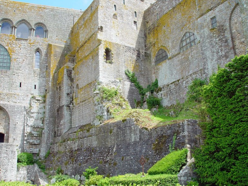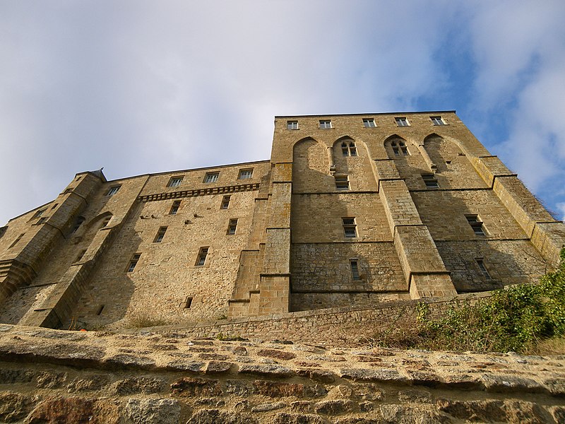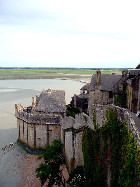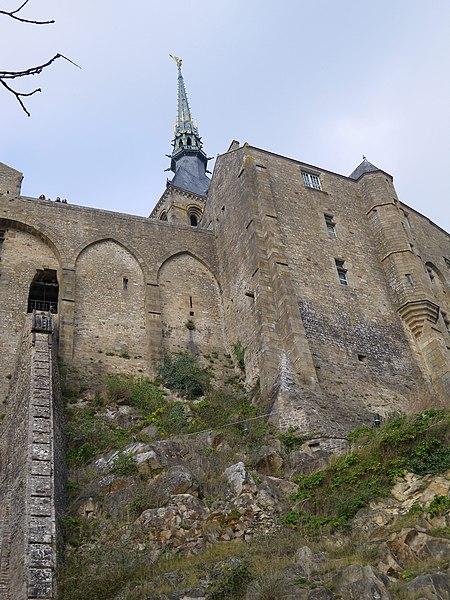 Au XVe siècle, dans le cadre de la guerre de Cent Ans, le dispositif défensif fut renforcé : l’abbé devint aussi chef militaire et, entre 1386 et 1410, Pierre Le Roy améliora notablement les défenses avec la construction d’un châtelet, d’un grand degré en avant de la barbacane, de la tour des Corbins, d’une longue courtine-terrasse dominant le bois au pied de la Merveille (1393), de la tour Pénine et d’un logis fortifié correspondant à l’actuel front sud de l’abbaye. En 1417 Robert Jollivet enferma la ville basse et le pied du Mont dans une enceinte continue à parapet crénelé sur mâchicoulis, flanquée de six tours dont celles du Roy, de l’Arcade et Cholet. Louis d’Estouteville, nommé capitaine du Mont en 1425, poursuivit les améliorations ; malgré un blocus en 1424 et un assaut en 1434 mené avec de l’artillerie, les assaillants anglais ne prirent jamais le Mont.