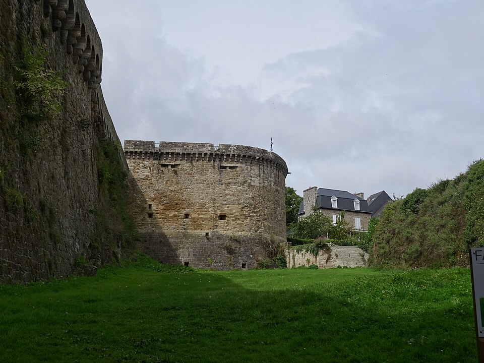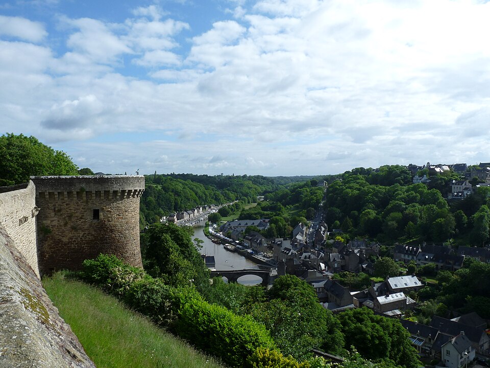 La ville se développe dès la première moitié du XIe siècle sur le bord oriental d'un plateau dominant la Rance, à un kilomètre environ en aval de l'abbaye Saint-Magloire de Léhon ; son site est naturellement défendu par des vallées escarpées à l'est et à l'ouest, des pentes méridionales moins raides mais dissuasives pour un assaillant, et au nord par une zone de forêt et de marécage qui ralentit les déplacements. Les remparts, édifiés à partir du XIIIe siècle par les seigneurs de la famille de Dinan puis repris par les ducs de Bretagne aux XIVe et XVe siècles, exploitent ces barrières naturelles et forment un quadrilatère irrégulier adapté aux escarpements des côtés est, sud et ouest.