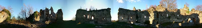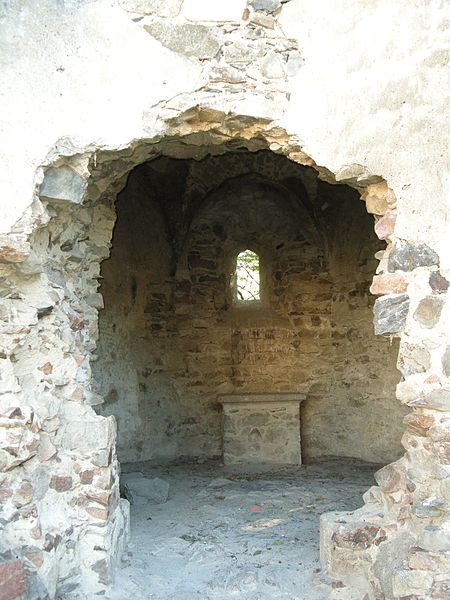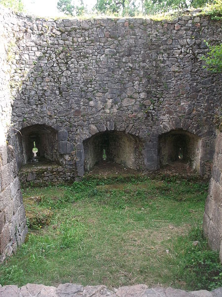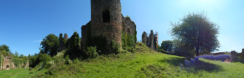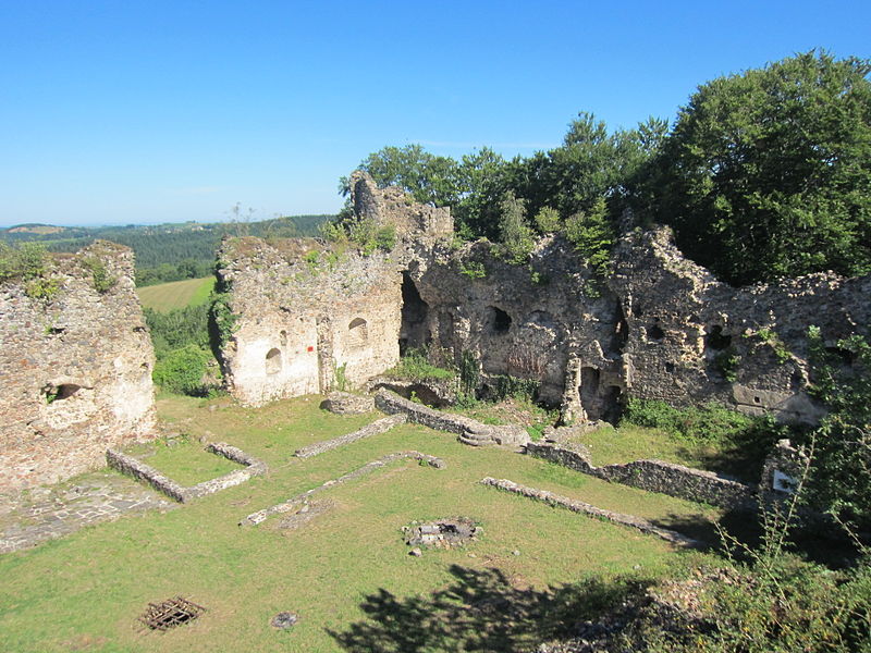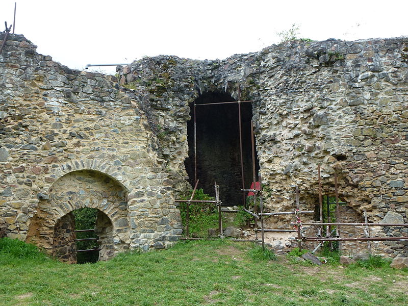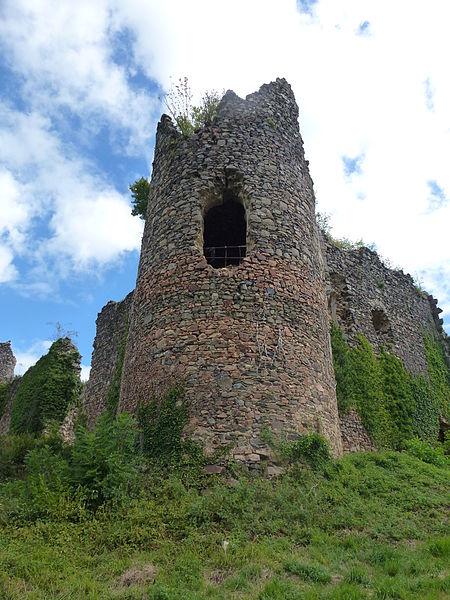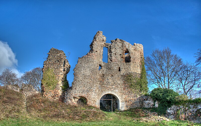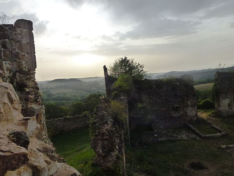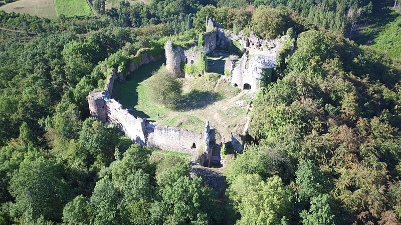 Il comporte deux enceintes superposées. L'enceinte extérieure, adaptée au terrain, renforce la défense à l'ouest et au sud par des tours et des archères et délimite une basse‑cour où logeaient les serviteurs ; elle fut remaniée au XVe siècle pour l'artillerie naissante, avec canonnières et un bastion aux murs épais qui condamna l'entrée d'origine. L'enceinte haute, de plan carré, présente aux angles des tours rondes encore voûtées — dont l'une abritait la chapelle — et comportait des tours carrées au centre des courtines aujourd'hui disparues ; elle était couronnée d'un chemin de ronde. Une porte à herse, encadrée de deux châtelets, donne accès à la cour haute où se trouvaient le logis seigneurial avec sa salle d'apparat, les communs avec cuisine et grande cheminée, ainsi que des réserves : citerne, silo et caves desservies par un escalier. Une galerie couverte longeait les bâtiments côté cour haute. À partir du XVe siècle, les locaux furent aménagés pour plus de confort : ouverture de fenêtres, enduits muraux et construction d'une rampe d'accès à la poterne du logis seigneurial. Le château fut peu à peu délaissé : salles abandonnées, fenêtres murées, puis abandon complet à la fin du XVIIIe siècle.
