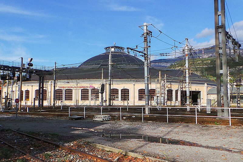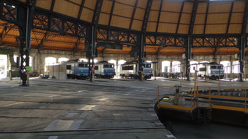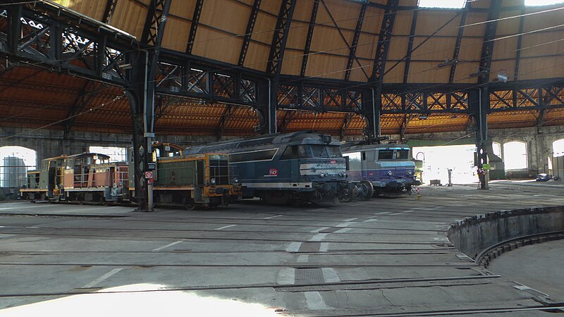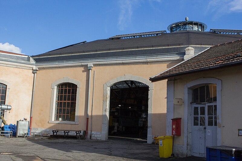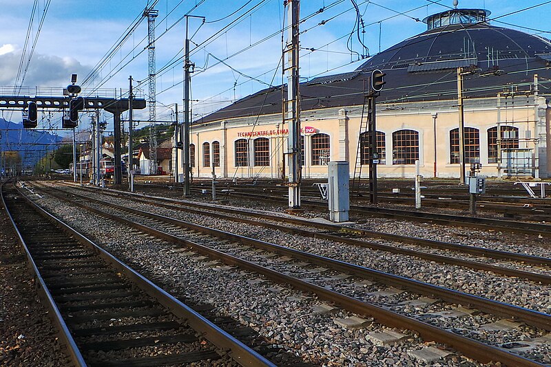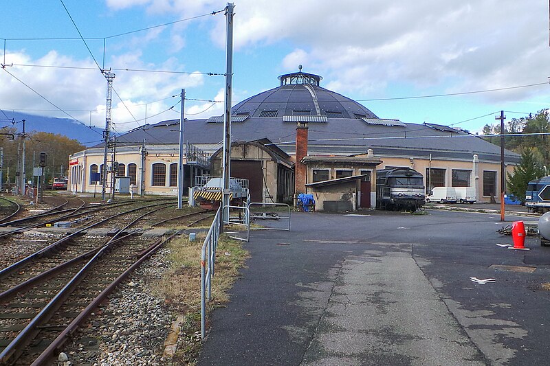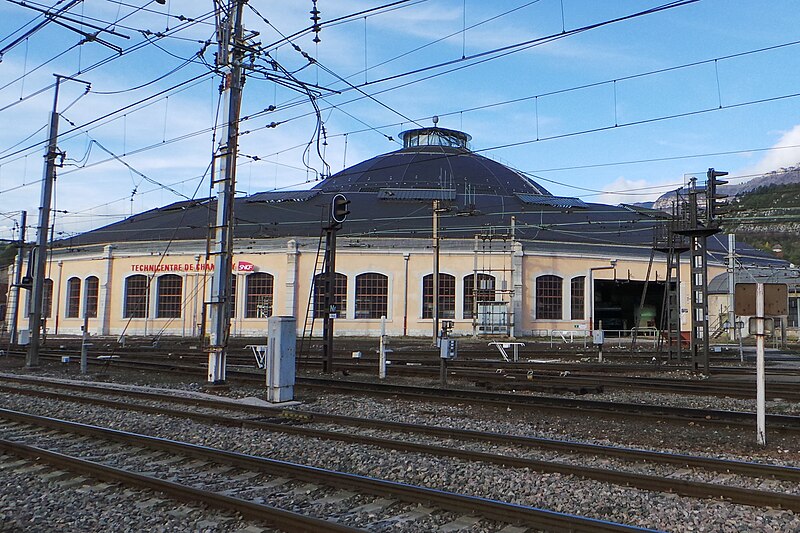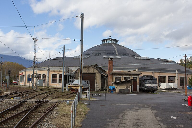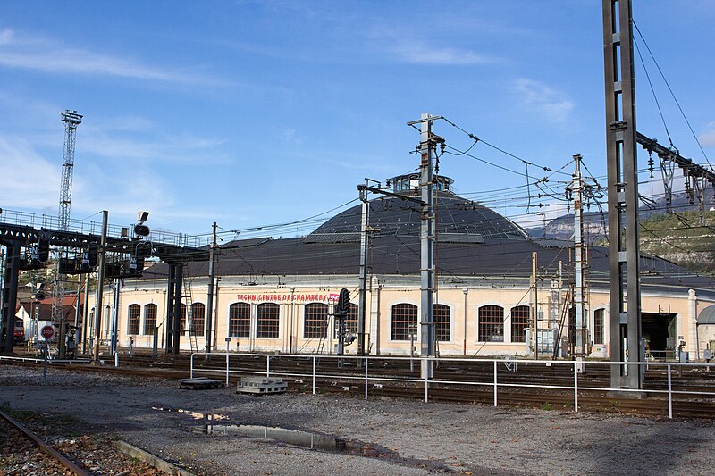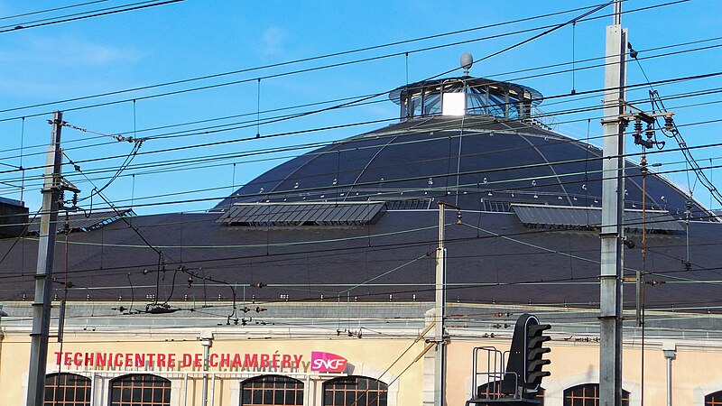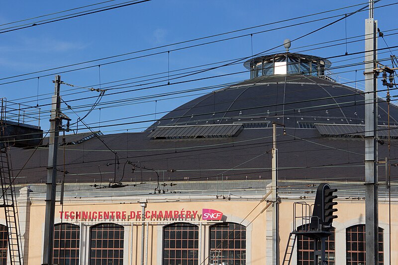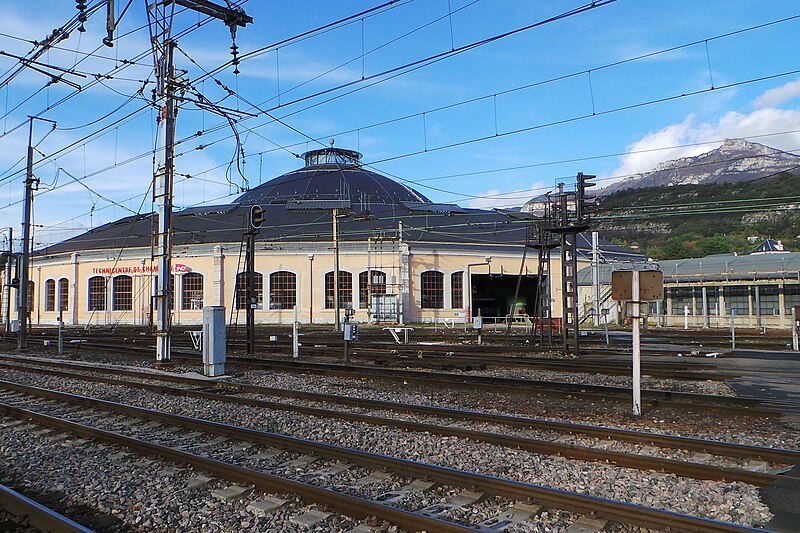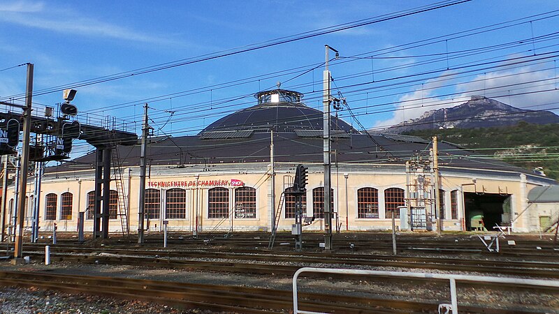 La rotonde du dépôt de locomotives de Chambéry, dite remise ferroviaire SNCF, a été édifiée pour la Compagnie du PLM au début du XXe siècle afin de répondre au trafic croissant autour de la ville. Selon les sources, sa construction s’étend entre 1906 et 1910 (certains textes indiquent 1908–1910); son diamètre est d’environ 108 mètres, parfois mentionné à 110 mètres, et elle peut abriter jusqu’à 72 locomotives sur 36 voies. Réalisée par la Société des Fonderies et Ateliers de Fourchambault, elle repose sur une ossature métallique soutenue par dix‑huit piliers, fermée par un mur extérieur en pierre et couronnée d’un lanterneau arrondi. La charpente métallique, montée selon une technique apparentée à celle d’Eiffel, est articulée à sa base et s’appuie sur des fondations sur pieux de bois adaptées aux sols marécageux de Chambéry. La rotonde est implantée à environ 500 mètres au nord‑ouest de la gare de Chambéry‑Challes‑les‑Eaux et fait partie d’un ensemble de dépôt comprenant ateliers, remises, faisceaux, voies de garage et bureaux. Son environnement mêle zones industrielles et commerciales, quartiers d’habitation historiques et espaces naturels proches comme la colline de la Boisse et la Leysse. Après avoir été relativement épargnée par le bombardement du 26 mai 1944, elle n’a pas connu de transformations majeures avant une rénovation complète engagée dans les années 2000. Lors de ces travaux, la toiture annulaire et la coupole centrale ont été refaites; la réfection du lanternon vitré a bénéficié d’un soutien financier du Conseil général de la Savoie et d’opérations locales de rénovation. La structure métallique, fortement dégradée par l’âge et la corrosion, a été remplacée à l’identique avec des assemblages par rivetage à chaud, respectant la méthode d’origine qui requiert un savoir‑faire particulier. Ces interventions, lourdes et techniques, ont été menées jusqu’à l’achèvement des travaux en 2011. Un Centre d’interprétation de l’architecture et du patrimoine (CIAP) de 800 m² a été inauguré en septembre 2014 au sein du Technicentre pour valoriser l’édifice et son histoire industrielle. La rotonde est inscrite au titre des monuments historiques depuis le 28 décembre 1984 et a reçu le label « Patrimoine du XXe siècle » en septembre 2005. Elle figure parmi les deux rotondes en France entièrement fermées à 360° et conservant leur coupole centrale, l’autre étant la rotonde de Mohon; la rotonde d’Avignon, bien que circulaire, ne possède pas de coupole centrale. Le dépôt a accueilli, au fil du temps et lors d’expositions, des locomotives anciennes de la Maurienne — notamment 2BB2 3200 et 3300, 2CC2 3400, 1ABBA1 3500 et 3600, 1CC1 3700 et 3800, 1C 1001, BB 1‑80, CC 7100 et CC 6500 — ainsi que des engins plus récents comme des BB 22200, BB 25200, BB 26000, BB 8500, BB 25150, BB 36000 et BB 36200‑300. Lors des journées du patrimoine et d’expositions organisées dans les années 2000, la rotonde a présenté du matériel restauré, des ateliers et des animations, attirant plusieurs milliers de visiteurs. Des visites commentées sont régulièrement proposées par les guides‑conférenciers du service Ville d’art et d’histoire de Chambéry.