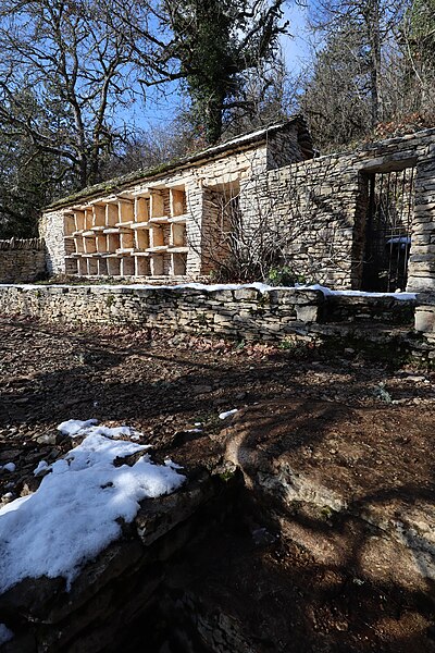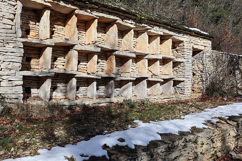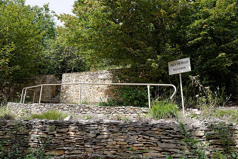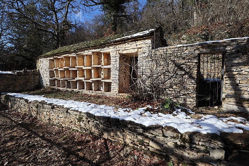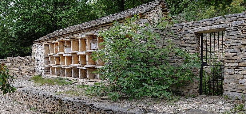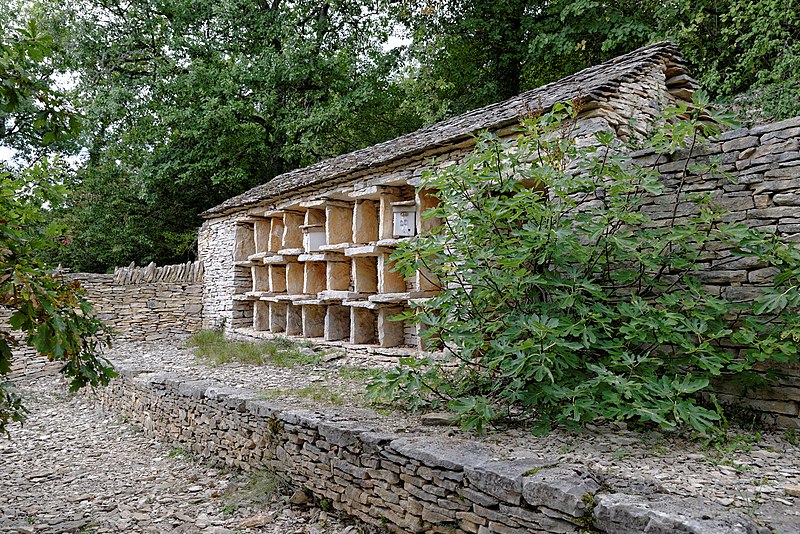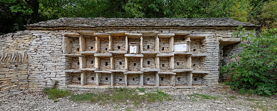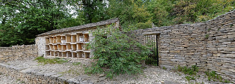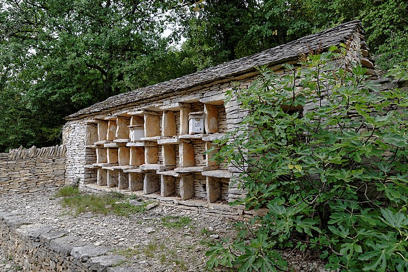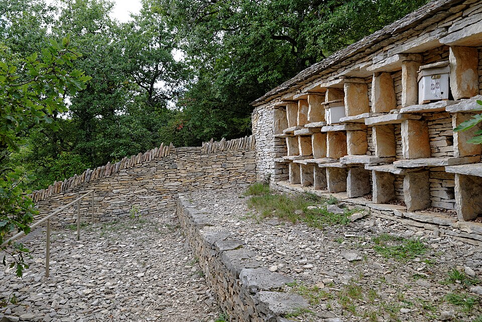 L'emplacement du rucher est attesté sur le plan cadastral napoléonien de 1812 et la propriété remonte au XIXe siècle. Il a été bâti selon les méthodes traditionnelles locales, en moellons et laves extraits de carrières voisines, sur une terrasse. Le bâtiment oblong, couvert d'un toit monopente en laves, se divise en deux parties. La première comprend, sur trois niveaux, neuf cases en pierre adossées à un mur ; à l'intérieur, un couloir parallèle dessert le même nombre de cases. L'accès à ce couloir se fait par une porte percée à droite des cases extérieures, surmontée d'un linteau monolithe et fermée par une grille métallique. La seconde partie, autrefois couverte, formait un abri et un laboratoire pour l'apiculteur.