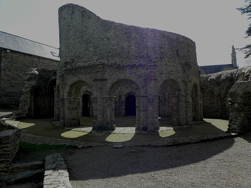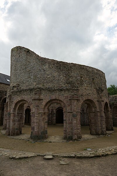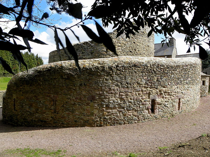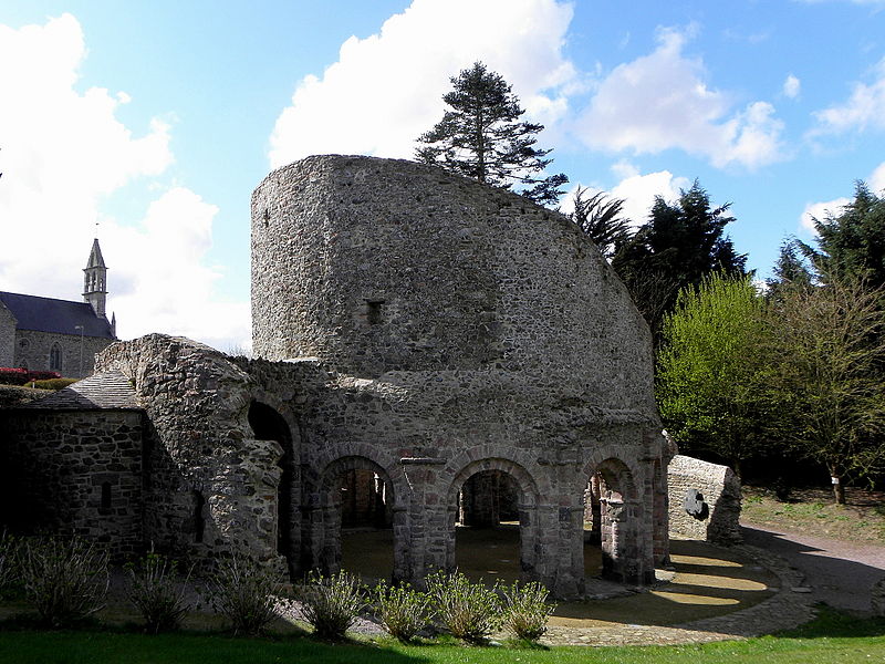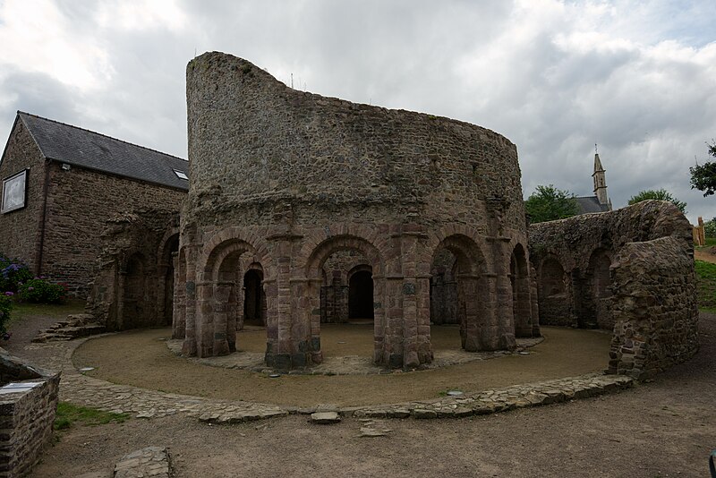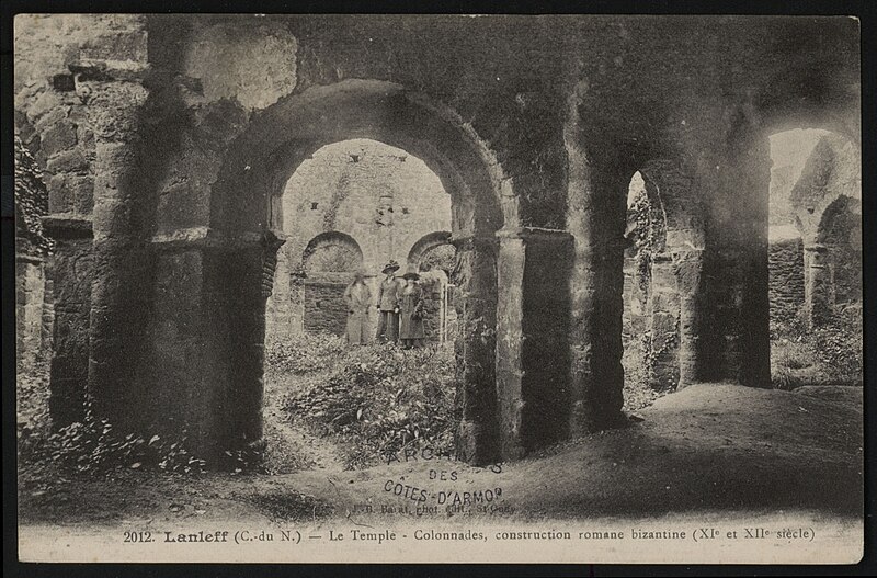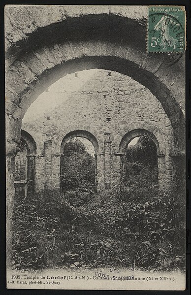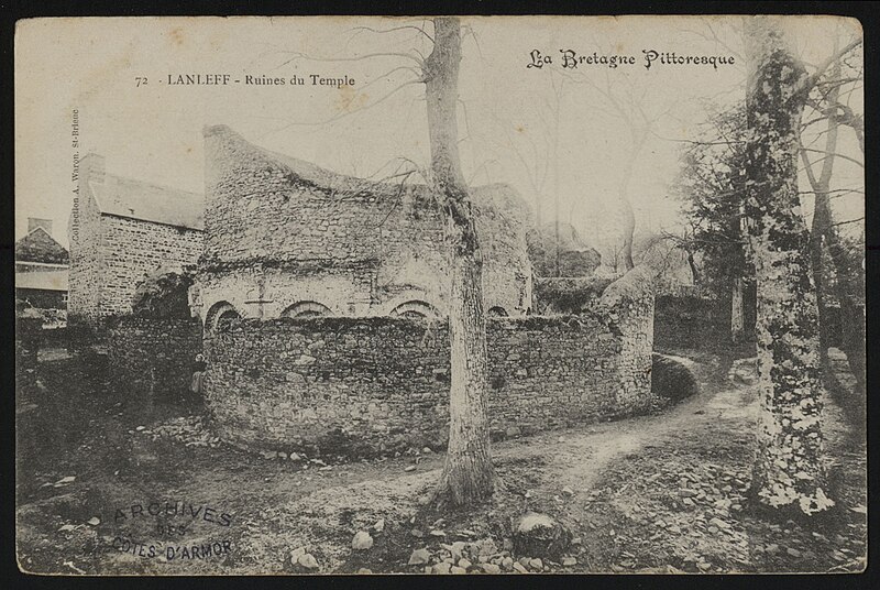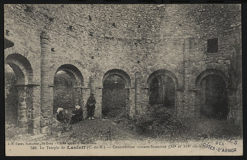 La rotonde dite « temple de Lanleff » est un monument en grès rose dont les vestiges montrent un plan circulaire rare dans la région. L’ensemble originel comportait deux enceintes circulaires concentriques séparées par un déambulatoire ; il ne subsiste aujourd’hui qu’une partie de l’enceinte extérieure, qui conserve deux des trois absidioles. L’enceinte intérieure était découpée en douze arcades plein cintre, légèrement surhaussées, soutenues par douze piliers imposants cantonnés de colonnes engagées aux bases et chapiteaux plats. Douze colonnes adossées aux massifs s’élèvent sous les cintres ; quatre d’entre elles paraissent destinées à reprendre les principales retombées des voûtes. Quelques travées subsistantes illustrent les premières voûtes en berceau. Sur la face antérieure, des gravures à la pointe représentent des figures humaines, animales et des ornements. L’enceinte extérieure présente, entre autres, un œil-de-bœuf et deux étroites ouvertures en plein cintre qui s’évasent vers l’intérieur. Les chapiteaux et les bases offrent un décor sculpté abondant — on en compte plus de 140 — comprenant motifs humains, animaux et géométriques ; l’une des représentations les plus remarquées est dite « Adam pudique ». La singularité du plan a suscité des hypothèses variées sur l’origine et la fonction de l’édifice — temple romain ou gaulois, baptistère mérovingien, église des Templiers — la présence templière n’ayant toutefois jamais été attestée. L’interprétation la plus répandue le considère comme une rotonde mariale d’époque romane, liée à la tradition des plans circulaires évoquant le Saint-Sépulcre. En l’absence de documents précis, la datation repose sur l’analyse stylistique et fait l’objet de débats : certains y voient un caractère archaïque renvoyant à la fin du IXe siècle ou au pré-roman, tandis qu’un nombre significatif de spécialistes privilégient un début du Xe siècle. Le premier document connu évoquant l’église Sainte‑Marie de Lanleff apparaît dans un acte de donation aux moines de Léhon attribué à Trihan de Chatelaudren, daté entre 1061 et 1148. Des annexes ont été ajoutées aux ruines aux XVe et XVIIIe siècles, et au XIXe siècle la rotonde a servi de vestibule à l’église paroissiale Sainte‑Marie. Le monument a retenu l’attention des savants, notamment Prosper Mérimée, et fait l’objet d’une protection au titre des monuments historiques depuis 1889. Une association locale créée en 2008 mène des recherches et propose visites et conférences autour du site.
