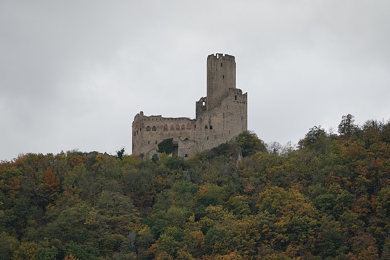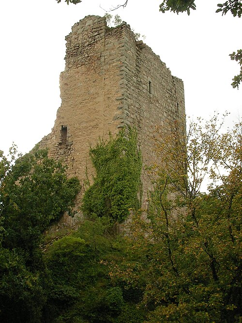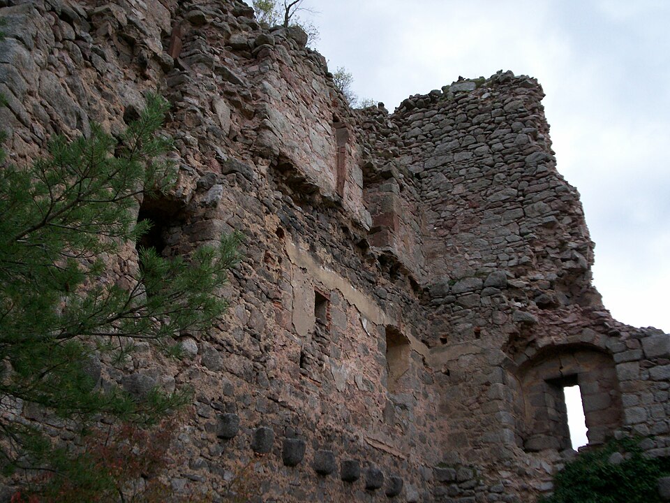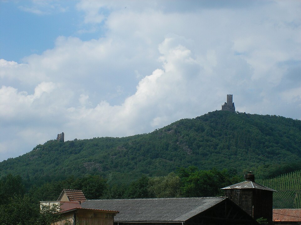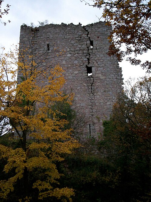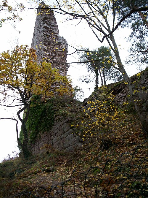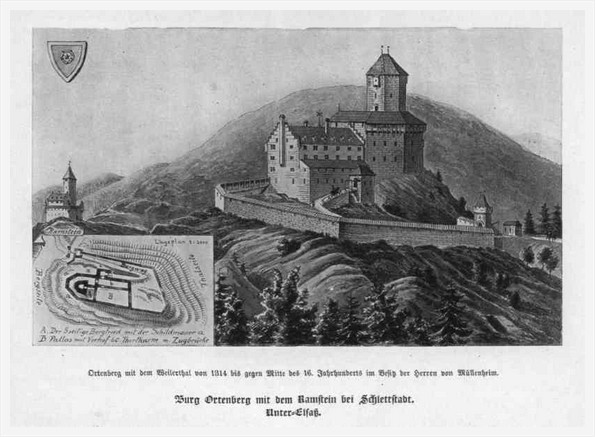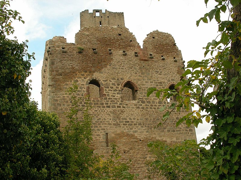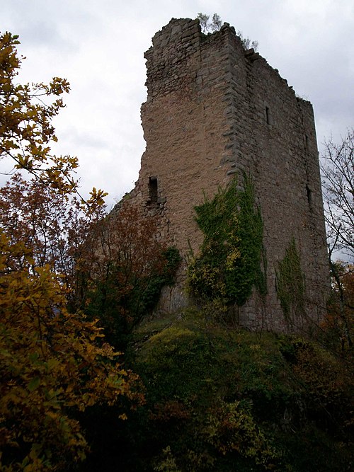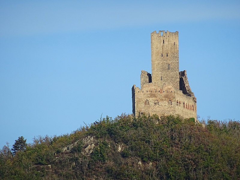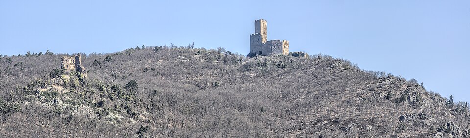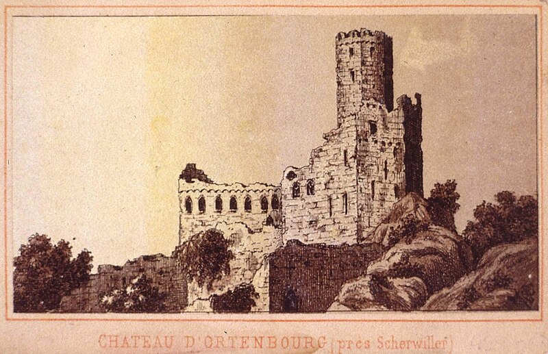 Les ruines des châteaux de l'Ortenbourg et du Ramstein se dressent sur la commune de Scherwiller, dans le Bas‑Rhin. L'Ortenbourg, attribué au comte Werner d'Ortenberg, passa ensuite aux mains des Habsbourg puis d'autres seigneuries et connut restaurations, occupations et démantèlements avant des travaux de consolidation au XIXe siècle. Le Ramstein est un château fort en ruine, établi sur un rocher à l'extrémité sud du Rittersberg, à environ 390 m d'altitude et à quelque 200 m au sud‑ouest de l'Ortenbourg. Il fut construit à la fin du XIIIe siècle par Otto IV d'Ochsenstein, vraisemblablement en lien avec les événements de 1293, et il est attesté dès 1303 parmi les possessions des Habsbourg. Le château changea plusieurs fois de mains au cours du Moyen Âge, passant notamment aux Württemberg, aux Müllenheim et à diverses lignées locales qui y réalisèrent réparations et transformations. Le Ramstein fut saccagé par les Strasbourgeois pendant la guerre de Dachstein, puis remis en état et occupé au moins jusqu'à la première moitié du XVIe siècle. Il fut incendié et démantelé par les Suédois en 1633 et définitivement abandonné par la suite. Les ruines furent acquises et consolidées par des propriétaires privés au XIXe siècle, classées au titre des monuments historiques au XXe siècle et font l'objet, depuis le XXIe siècle, de travaux de dégagement et d'entretien menés aussi par des bénévoles réunis en association. Le toponyme Ramstein, attesté dès 1293, signifie littéralement « rocher des corbeaux », Ram‑ partageant la racine de « corbeau » et ‑stein signifiant « rocher ». Le site occupe les premiers contreforts des Vosges, en bordure de la plaine d'Alsace ; il regarde vers l'Ortenbourg qui domine le versant opposé. Le terrain immédiatement au nord‑est forme une large terrasse relativement plane, ce qui a concentré les défenses sur ce côté, tandis que les flancs sud et ouest bénéficient d'une protection naturelle par forte pente. La plus ancienne mention du château figure dans les Annales du couvent des Dominicains de Colmar, dans une note datée de l'été 1293. L'origine et le rôle du Ramstein ont fait l'objet d'un long débat : de la fin du XIXe siècle à la fin du XXe siècle il fut souvent présenté comme un château de siège destiné à menacer l'Ortenbourg, interprétation remise en cause par des recherches du début du XXIe siècle. Ces études récentes montrent que l'emplacement du Ramstein est mal adapté pour couper les approvisionnements de l'Ortenbourg, que l'argumentation initiale repose largement sur une lecture d'un passage ambigu des Annales, et qu'une arbalète de siège installée au Ramstein n'aurait guère pu atteindre l'Ortenbourg. Le château se compose principalement d'une tour‑habitat imposante posée sur le rocher, d'une basse‑cour en contrebas à l'ouest et d'une enceinte de fausses‑braies garnie de tours. L'accès s'effectuait par l'extrémité orientale du fossé : un assaillant devait franchir une porte, parcourir le fossé vers l'ouest pour atteindre la porte de la basse‑cour, puis traverser le site vers l'est pour gagner la tour‑habitat. La tour‑habitat, quasi rectangulaire d'environ 20 m sur 15 m, reposait directement sur le rocher et dominait le fossé d'une vingtaine de mètres ; elle comptait à l'origine quatre niveaux et fut surélevée de deux étages au XIVe siècle. Aujourd'hui ne subsistent que le mur nord et une partie du mur est de cette tour, les murs ouest et sud ayant presque disparu, l'aspect du mur sud étant partiellement connu par une gravure de 1514. Les niveaux inférieurs, dont la cave et le premier niveau extérieur, ont été en partie comblés ou remaniés et plusieurs ouvertures ont été bouchées au cours des travaux médiévaux. Les maçonneries sont principalement en moellons de granite extraits sur place ; des encadrements et éléments des niveaux supérieurs montrent l'emploi de grès lors de réfections ultérieures et les murs étaient recouverts de crépi. Au XVe siècle, l'ensemble fut entouré de fausses‑braies peu épaisses dotées de tours circulaires et en fer à cheval, comprenant des tours de flanquement et une porte intégrée dans une tour en fer à cheval. Le fossé, en forme de L, isole le château de la crête ; son creusement fournit une grande partie des matériaux de construction et une zone aménagée près de la porte servait à diriger les eaux de ruissellement vers une dépression pouvant servir d'abreuvoir. Les fouilles et travaux de restauration engagés depuis les années 1960, puis intensifiés au XXIe siècle, ont permis de rendre visible le tracé de la basse‑cour, des fausses‑braies et de mieux comprendre l'organisation et les modifications successives du site.