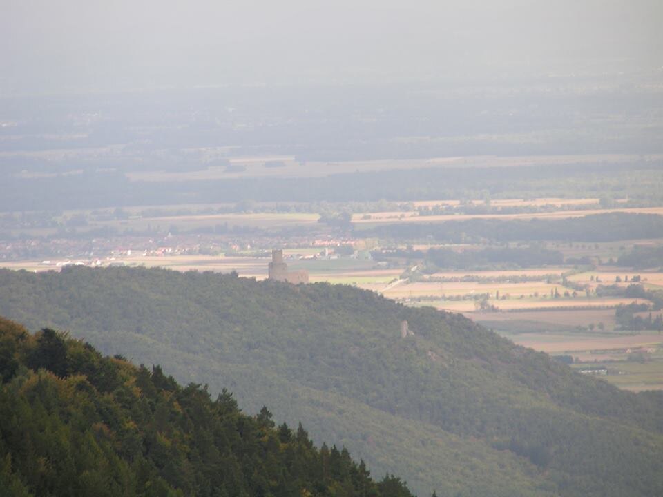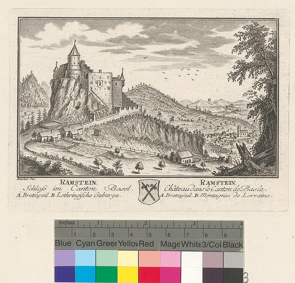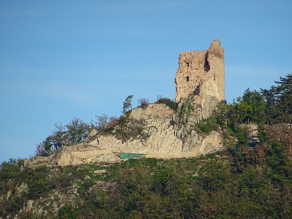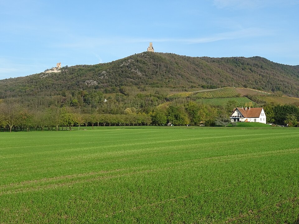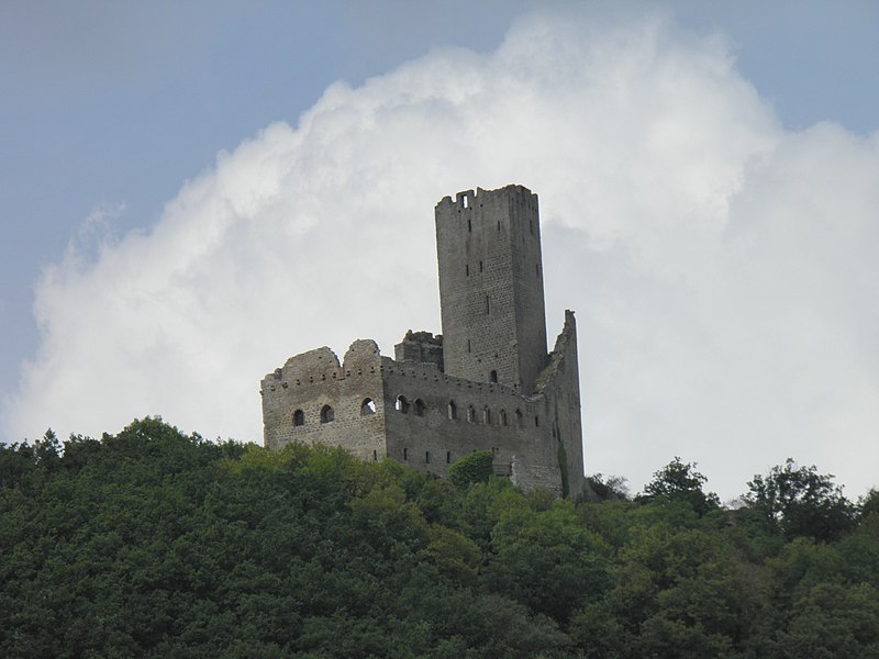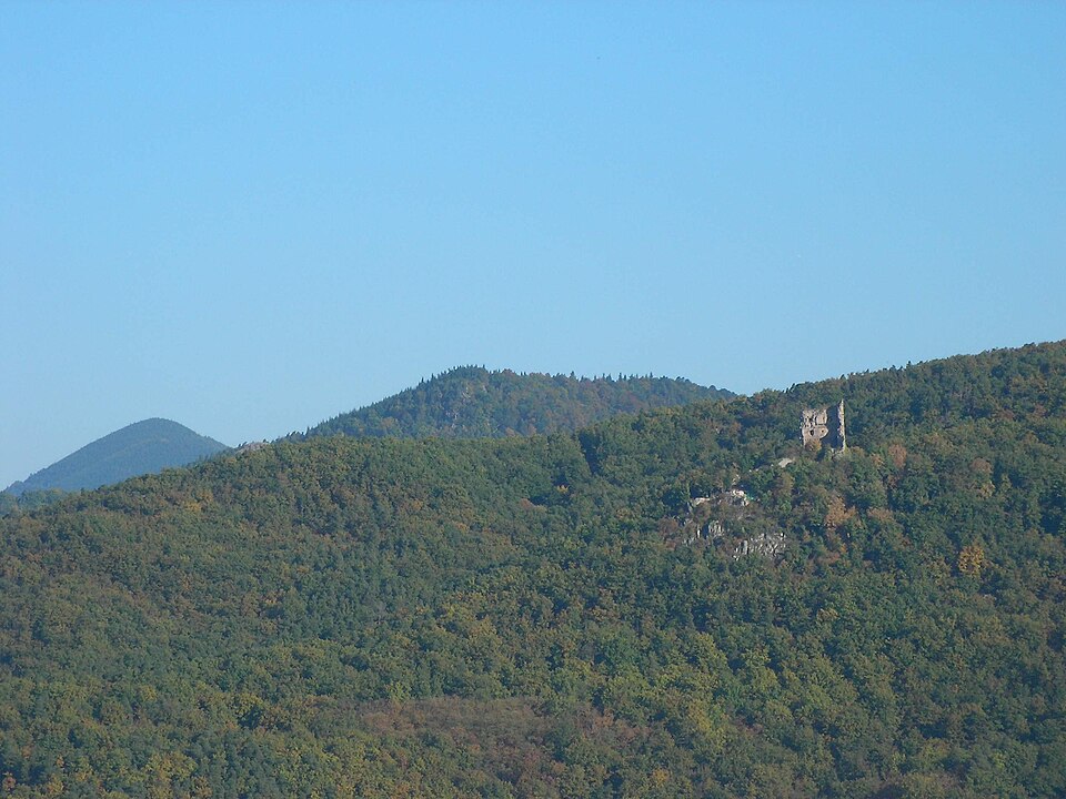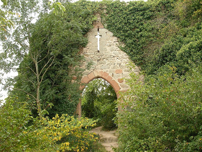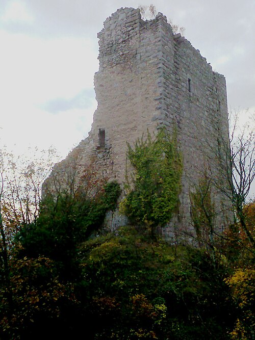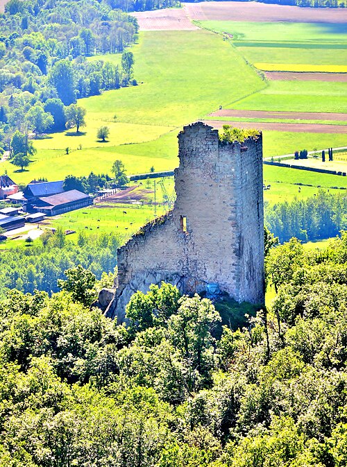 Les ruines des châteaux de l'Ortenbourg et du Ramstein se dressent sur la commune de Scherwiller, dans le Bas‑Rhin. L'Ortenbourg, attribué au comte Werner d'Ortenberg, passa ensuite aux mains des Habsbourg puis d'autres seigneuries et connut restaurations, occupations et démantèlements avant des travaux de consolidation au XIXe siècle. Le Ramstein est un château fort en ruine, établi sur un rocher à l'extrémité sud du Rittersberg, à environ 390 m d'altitude et à quelque 200 m au sud‑ouest de l'Ortenbourg. Il fut construit à la fin du XIIIe siècle par Otto IV d'Ochsenstein, vraisemblablement en lien avec les événements de 1293, et il est attesté dès 1303 parmi les possessions des Habsbourg. Le château changea plusieurs fois de mains au cours du Moyen Âge, passant notamment aux Württemberg, aux Müllenheim et à diverses lignées locales qui y réalisèrent réparations et transformations. Le Ramstein fut saccagé par les Strasbourgeois pendant la guerre de Dachstein, puis remis en état et occupé au moins jusqu'à la première moitié du XVIe siècle. Il fut incendié et démantelé par les Suédois en 1633 et définitivement abandonné par la suite. Les ruines furent acquises et consolidées par des propriétaires privés au XIXe siècle, classées au titre des monuments historiques au XXe siècle et font l'objet, depuis le XXIe siècle, de travaux de dégagement et d'entretien menés aussi par des bénévoles réunis en association. Le toponyme Ramstein, attesté dès 1293, signifie littéralement « rocher des corbeaux », Ram‑ partageant la racine de « corbeau » et ‑stein signifiant « rocher ». Le site occupe les premiers contreforts des Vosges, en bordure de la plaine d'Alsace ; il regarde vers l'Ortenbourg qui domine le versant opposé. Le terrain immédiatement au nord‑est forme une large terrasse relativement plane, ce qui a concentré les défenses sur ce côté, tandis que les flancs sud et ouest bénéficient d'une protection naturelle par forte pente. La plus ancienne mention du château figure dans les Annales du couvent des Dominicains de Colmar, dans une note datée de l'été 1293. L'origine et le rôle du Ramstein ont fait l'objet d'un long débat : de la fin du XIXe siècle à la fin du XXe siècle il fut souvent présenté comme un château de siège destiné à menacer l'Ortenbourg, interprétation remise en cause par des recherches du début du XXIe siècle. Ces études récentes montrent que l'emplacement du Ramstein est mal adapté pour couper les approvisionnements de l'Ortenbourg, que l'argumentation initiale repose largement sur une lecture d'un passage ambigu des Annales, et qu'une arbalète de siège installée au Ramstein n'aurait guère pu atteindre l'Ortenbourg. Le château se compose principalement d'une tour‑habitat imposante posée sur le rocher, d'une basse‑cour en contrebas à l'ouest et d'une enceinte de fausses‑braies garnie de tours. L'accès s'effectuait par l'extrémité orientale du fossé : un assaillant devait franchir une porte, parcourir le fossé vers l'ouest pour atteindre la porte de la basse‑cour, puis traverser le site vers l'est pour gagner la tour‑habitat. La tour‑habitat, quasi rectangulaire d'environ 20 m sur 15 m, reposait directement sur le rocher et dominait le fossé d'une vingtaine de mètres ; elle comptait à l'origine quatre niveaux et fut surélevée de deux étages au XIVe siècle. Aujourd'hui ne subsistent que le mur nord et une partie du mur est de cette tour, les murs ouest et sud ayant presque disparu, l'aspect du mur sud étant partiellement connu par une gravure de 1514. Les niveaux inférieurs, dont la cave et le premier niveau extérieur, ont été en partie comblés ou remaniés et plusieurs ouvertures ont été bouchées au cours des travaux médiévaux. Les maçonneries sont principalement en moellons de granite extraits sur place ; des encadrements et éléments des niveaux supérieurs montrent l'emploi de grès lors de réfections ultérieures et les murs étaient recouverts de crépi. Au XVe siècle, l'ensemble fut entouré de fausses‑braies peu épaisses dotées de tours circulaires et en fer à cheval, comprenant des tours de flanquement et une porte intégrée dans une tour en fer à cheval. Le fossé, en forme de L, isole le château de la crête ; son creusement fournit une grande partie des matériaux de construction et une zone aménagée près de la porte servait à diriger les eaux de ruissellement vers une dépression pouvant servir d'abreuvoir. Les fouilles et travaux de restauration engagés depuis les années 1960, puis intensifiés au XXIe siècle, ont permis de rendre visible le tracé de la basse‑cour, des fausses‑braies et de mieux comprendre l'organisation et les modifications successives du site.
