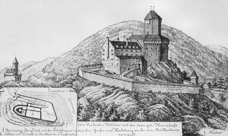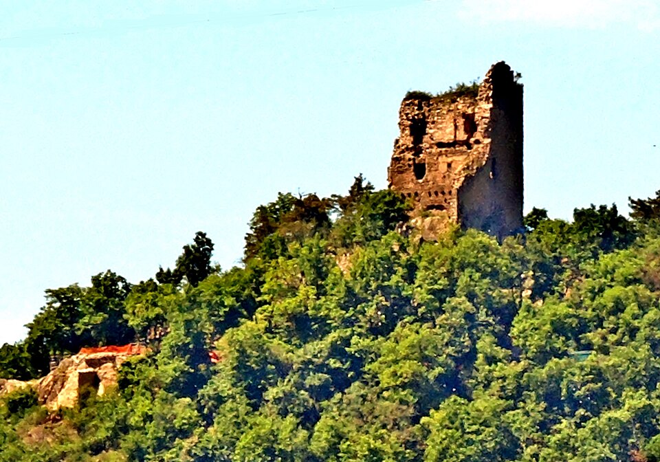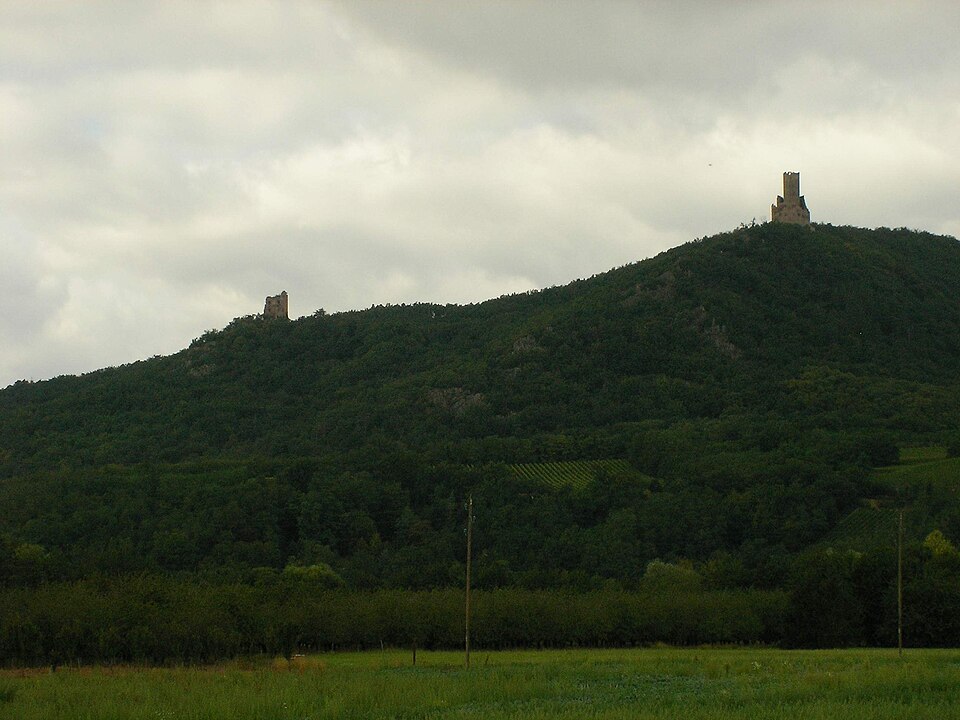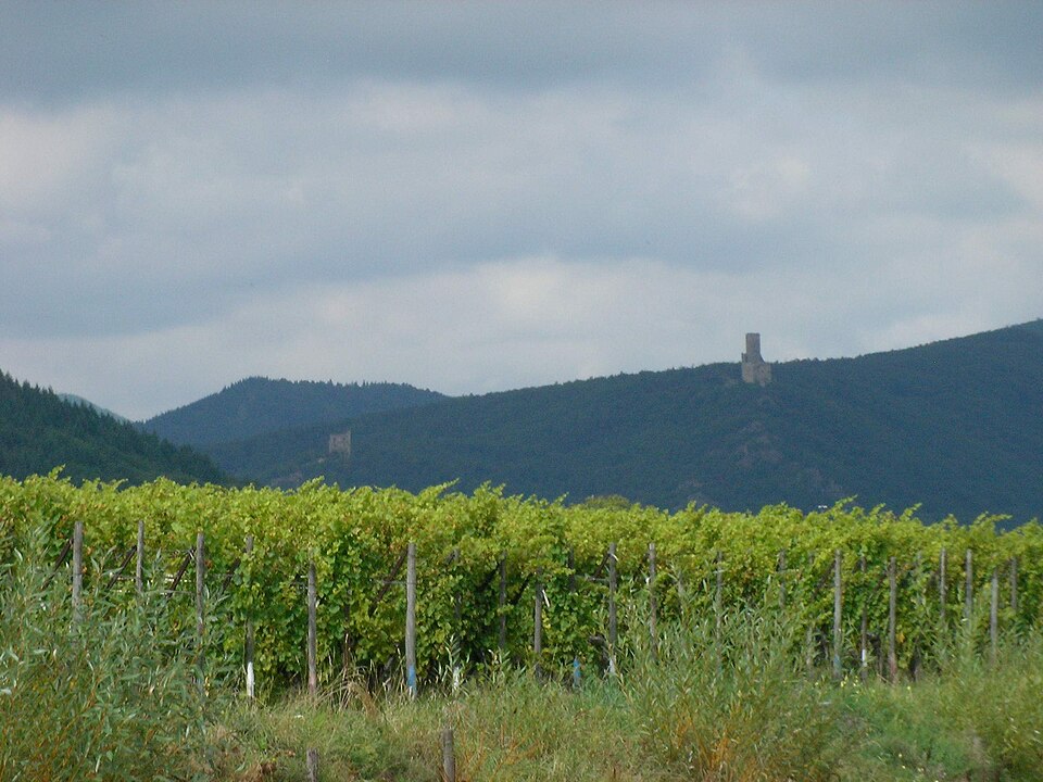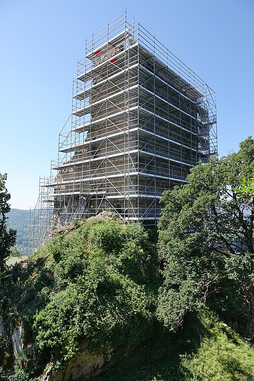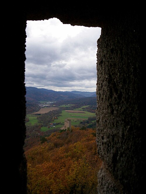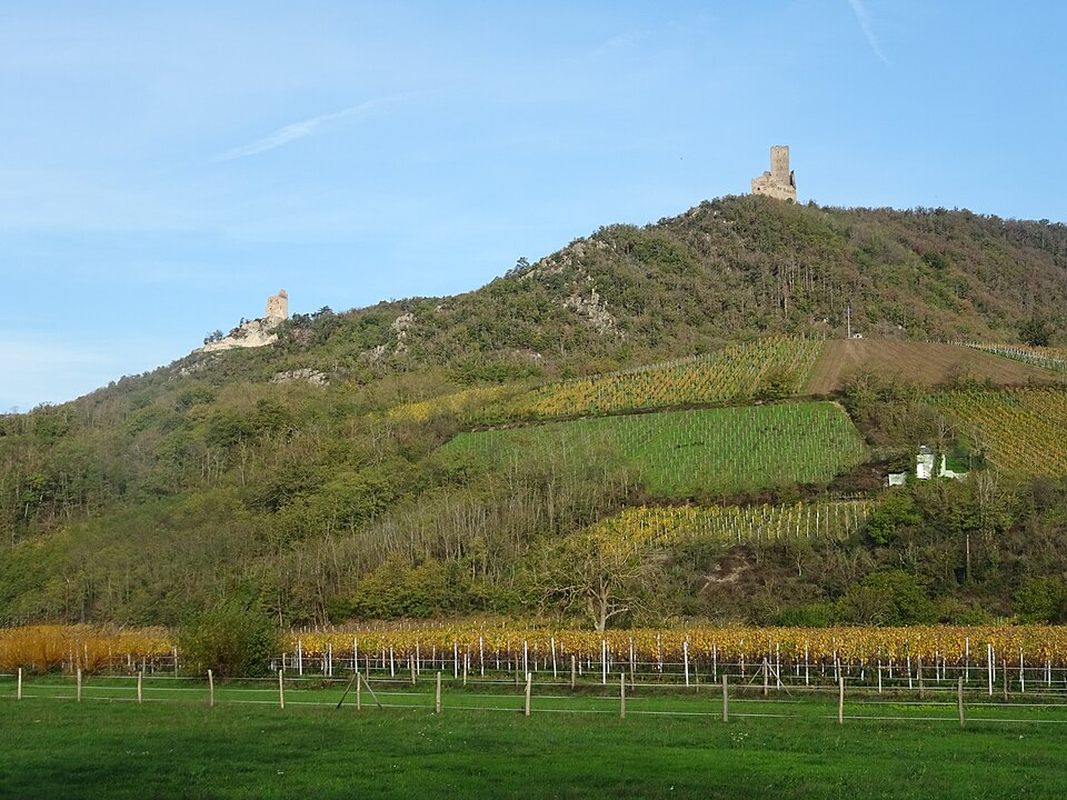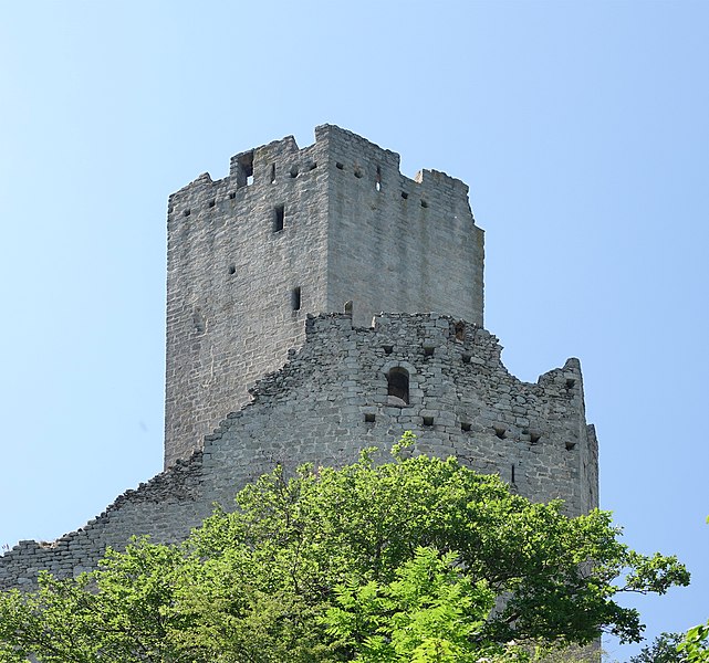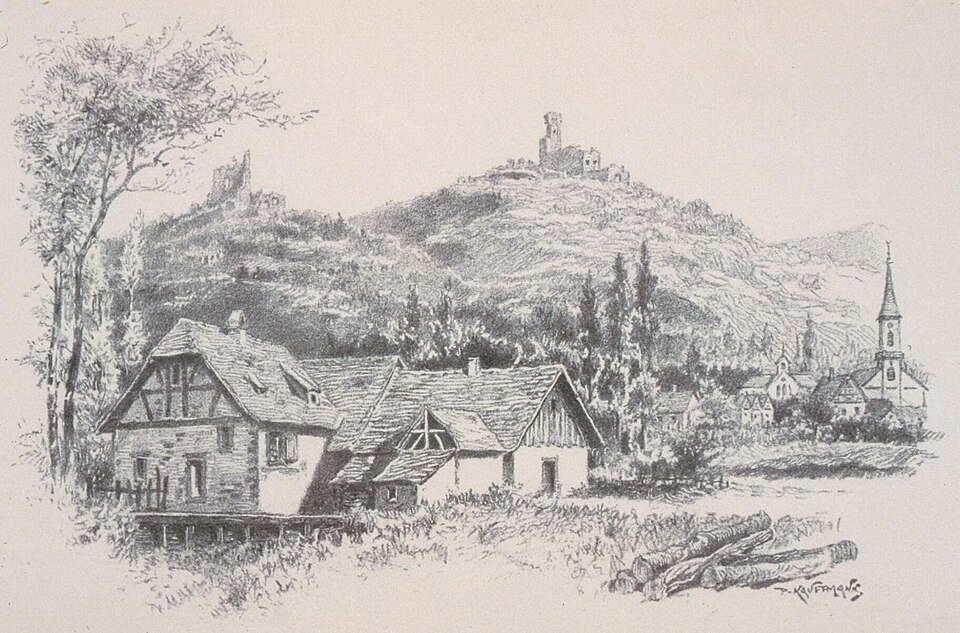 Les ruines des châteaux de l'Ortenbourg et du Ramstein se dressent sur la commune de Scherwiller, dans le Bas‑Rhin. L'Ortenbourg, attribué au comte Werner d'Ortenberg, passa ensuite aux mains des Habsbourg puis d'autres seigneuries et connut restaurations, occupations et démantèlements avant des travaux de consolidation au XIXe siècle. Le Ramstein est un château fort en ruine, établi sur un rocher à l'extrémité sud du Rittersberg, à environ 390 m d'altitude et à quelque 200 m au sud‑ouest de l'Ortenbourg. Il fut construit à la fin du XIIIe siècle par Otto IV d'Ochsenstein, vraisemblablement en lien avec les événements de 1293, et il est attesté dès 1303 parmi les possessions des Habsbourg. Le château changea plusieurs fois de mains au cours du Moyen Âge, passant notamment aux Württemberg, aux Müllenheim et à diverses lignées locales qui y réalisèrent réparations et transformations. Le Ramstein fut saccagé par les Strasbourgeois pendant la guerre de Dachstein, puis remis en état et occupé au moins jusqu'à la première moitié du XVIe siècle. Il fut incendié et démantelé par les Suédois en 1633 et définitivement abandonné par la suite. Les ruines furent acquises et consolidées par des propriétaires privés au XIXe siècle, classées au titre des monuments historiques au XXe siècle et font l'objet, depuis le XXIe siècle, de travaux de dégagement et d'entretien menés aussi par des bénévoles réunis en association. Le toponyme Ramstein, attesté dès 1293, signifie littéralement « rocher des corbeaux », Ram‑ partageant la racine de « corbeau » et ‑stein signifiant « rocher ». Le site occupe les premiers contreforts des Vosges, en bordure de la plaine d'Alsace ; il regarde vers l'Ortenbourg qui domine le versant opposé. Le terrain immédiatement au nord‑est forme une large terrasse relativement plane, ce qui a concentré les défenses sur ce côté, tandis que les flancs sud et ouest bénéficient d'une protection naturelle par forte pente. La plus ancienne mention du château figure dans les Annales du couvent des Dominicains de Colmar, dans une note datée de l'été 1293. L'origine et le rôle du Ramstein ont fait l'objet d'un long débat : de la fin du XIXe siècle à la fin du XXe siècle il fut souvent présenté comme un château de siège destiné à menacer l'Ortenbourg, interprétation remise en cause par des recherches du début du XXIe siècle. Ces études récentes montrent que l'emplacement du Ramstein est mal adapté pour couper les approvisionnements de l'Ortenbourg, que l'argumentation initiale repose largement sur une lecture d'un passage ambigu des Annales, et qu'une arbalète de siège installée au Ramstein n'aurait guère pu atteindre l'Ortenbourg. Le château se compose principalement d'une tour‑habitat imposante posée sur le rocher, d'une basse‑cour en contrebas à l'ouest et d'une enceinte de fausses‑braies garnie de tours. L'accès s'effectuait par l'extrémité orientale du fossé : un assaillant devait franchir une porte, parcourir le fossé vers l'ouest pour atteindre la porte de la basse‑cour, puis traverser le site vers l'est pour gagner la tour‑habitat. La tour‑habitat, quasi rectangulaire d'environ 20 m sur 15 m, reposait directement sur le rocher et dominait le fossé d'une vingtaine de mètres ; elle comptait à l'origine quatre niveaux et fut surélevée de deux étages au XIVe siècle. Aujourd'hui ne subsistent que le mur nord et une partie du mur est de cette tour, les murs ouest et sud ayant presque disparu, l'aspect du mur sud étant partiellement connu par une gravure de 1514. Les niveaux inférieurs, dont la cave et le premier niveau extérieur, ont été en partie comblés ou remaniés et plusieurs ouvertures ont été bouchées au cours des travaux médiévaux. Les maçonneries sont principalement en moellons de granite extraits sur place ; des encadrements et éléments des niveaux supérieurs montrent l'emploi de grès lors de réfections ultérieures et les murs étaient recouverts de crépi. Au XVe siècle, l'ensemble fut entouré de fausses‑braies peu épaisses dotées de tours circulaires et en fer à cheval, comprenant des tours de flanquement et une porte intégrée dans une tour en fer à cheval. Le fossé, en forme de L, isole le château de la crête ; son creusement fournit une grande partie des matériaux de construction et une zone aménagée près de la porte servait à diriger les eaux de ruissellement vers une dépression pouvant servir d'abreuvoir. Les fouilles et travaux de restauration engagés depuis les années 1960, puis intensifiés au XXIe siècle, ont permis de rendre visible le tracé de la basse‑cour, des fausses‑braies et de mieux comprendre l'organisation et les modifications successives du site.