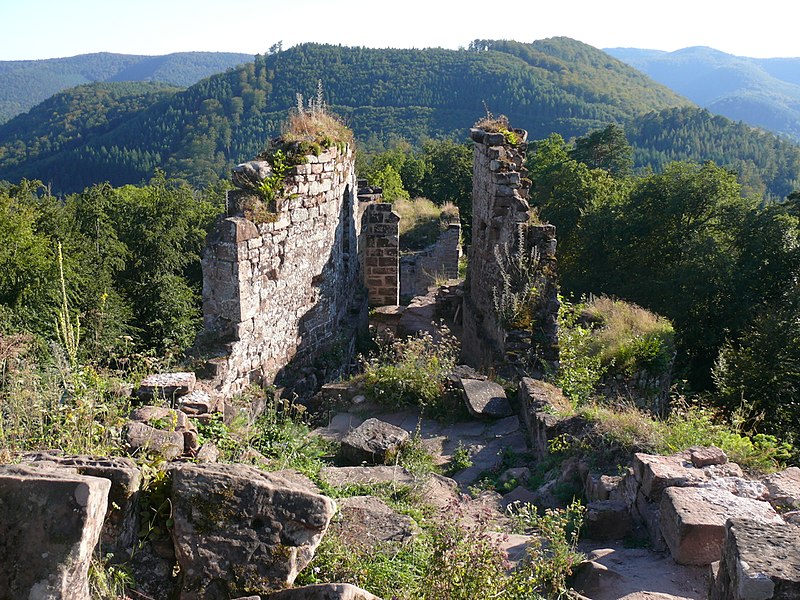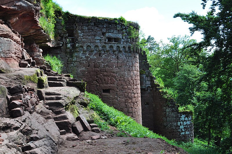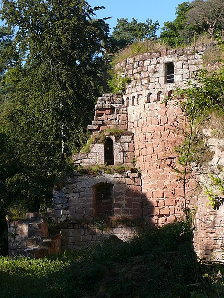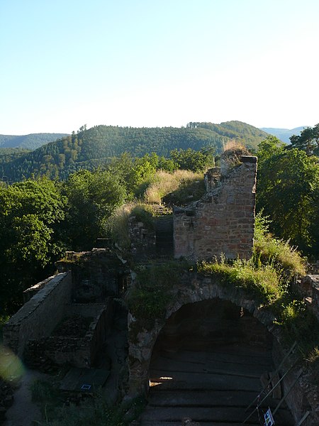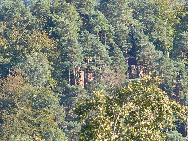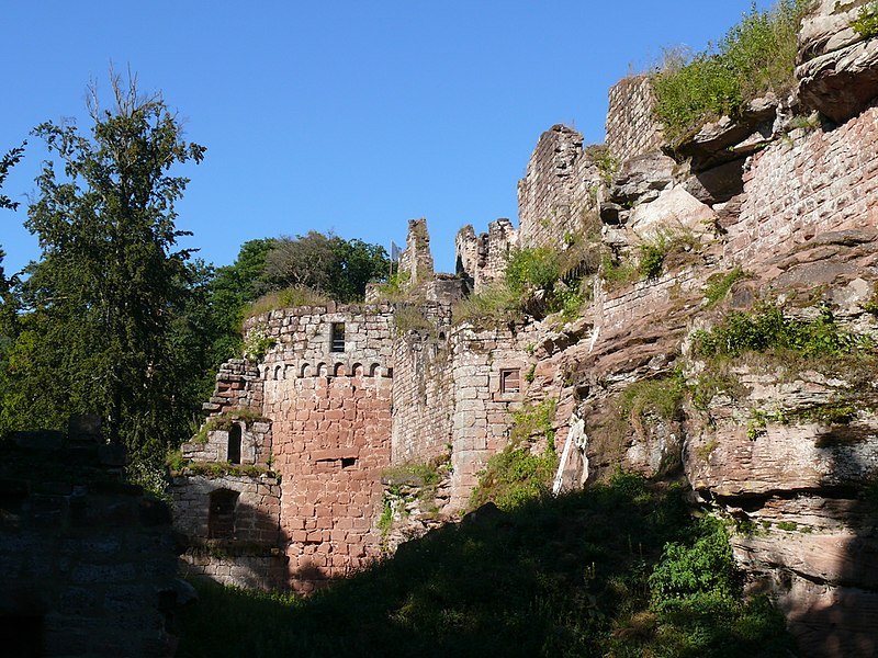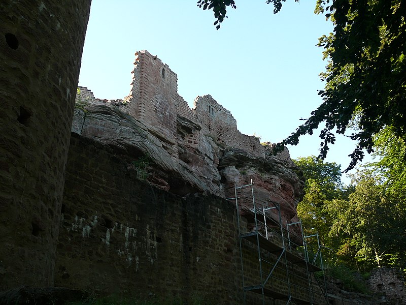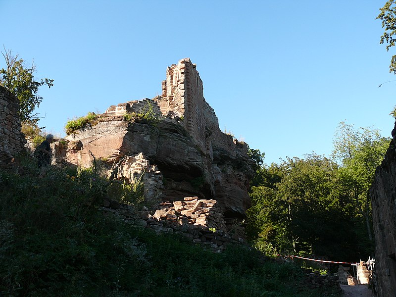 Les ruines du château de Schoeneck sont un ancien château fort en relief, aujourd'hui ruiné, situé sur la commune de Dambach (Bas-Rhin, Grand Est). Il s'élève sur une barre rocheuse à 380 m d'altitude, à 2,6 km au nord-est de Dambach. Probablement édifié à la fin du XIIe ou au début du XIIIe siècle, il aurait été établi sans doute à l'instigation des Hohenstaufen et destiné à chasser les brigands. Le château fut détruit vers 1280, reconstruit en 1286 et cité en 1287 comme propriété de l'évêque de Strasbourg, allié des Habsbourg. En 1301, l'évêque confia la garde à la famille de Lichtenberg et l'inféoda aux Schoeneck. Des travaux de restauration furent entrepris à la fin du XIVe siècle sous l'autorité de l'évêque Frédéric de Blankenheim, avec des travaux poursuivis jusqu'en 1390. Aux XVe et XVIe siècles, la seigneurie connut des changements de main et des conflits : la seigneurie fut accordée en sous-fief aux Durckheim en 1517, alors que le château était délabré, et il fut restauré puis modernisé entre 1545 et 1547 pour faire face aux progrès de l'artillerie. À l'extinction des comtes de Deux-Ponts-Bitche, la seigneurie revint aux comtes de Hanau-Lichtenberg. En 1663 un incendie de forêt l'endommagea ; les Durckheim entreprirent des réparations, mais le château fut finalement démantelé à la fin du XVIIe siècle sur ordre de Louis XIV, au terme d'opérations militaires impliquant des troupes commandées par Monclar et Mélac. Après la Révolution, les vestiges furent achetés par la famille de Dietrich ; la ruine et la forêt appartiennent aujourd'hui à la famille de Pimodan. Les ruines sont inscrites au titre des monuments historiques depuis le 28 décembre 1984. Le site conserve une porte à bretèche ogivale et une grande entrée flanquée de deux bastions carrés du XVIe siècle pourvus de canonnières, la porte étant précédée d'un ancien pont-levis. À l'ouest, une courtine rectiligne ferme la basse-cour ; à l'est, une longue muraille est flanquée de deux tours. On observe aussi les vestiges des logis seigneuriaux, notamment deux fenêtres supérieures étroites à arc en plein cintre et des frises lombardes à l'extérieur de l'enceinte occidentale. Les constructeurs ont employé du grès local et un grès plus fin provenant d'une carrière située à une quinzaine de kilomètres ; un emplacement de monte-charge est encore visible sur le site. Des travaux de consolidation sont attestés à plusieurs reprises et l'association Cun Ulmer Grün mène depuis 2000 des consolidations et des fouilles. Des interventions archéologiques ont été réalisées depuis la fin du XIXe siècle : des fouilles limitées en 1881, des campagnes en 1981 dirigées par Maurice Frey qui dégagèrent l'entrée et mirent au jour un linteau daté de 1676, des fouilles en 1983 révélant notamment une forge avec son évier, puis des campagnes en 2003 autour de la tour octogonale qui ont mis en évidence une stratigraphie notable et permis de trouver une pièce de 1656 dans une couche d'incendie, confirmant l'événement de 1663. L'accès se fait entre Obersteinbach et le Wineckerthal par la D53, en prenant le chemin menant à la maison forestière du Fischerackerhof puis le sentier du Club vosgien Henri-Mellon balisé d'un triangle vert, ou, plus loin et moins raide, le chemin balisé d'un triangle rouge.